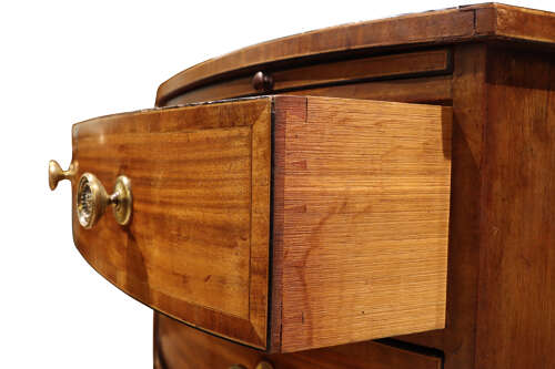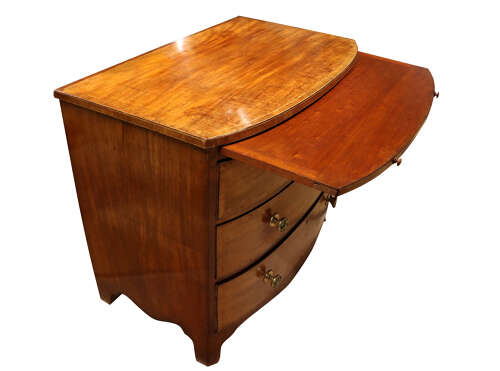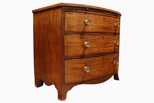 The elegant bowed front is complemented by a shaped apron and bracket feet, and the piece retains a brushing slide above the drawers, a desirable and practical feature. Constructed in solid mahogany, with dovetailed drawers, it displays a warm, rich colour and pleasing patina consistent with age and use.