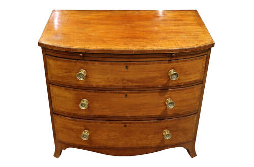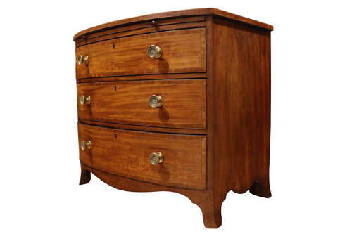A fine Georgian bow-fronted mahogany chest of drawers, dating from the late 18th to early 19th century. The chest features three graduated drawers with attractive boxwood stringing and tulipwood banding with brass knobs and escutcheons.