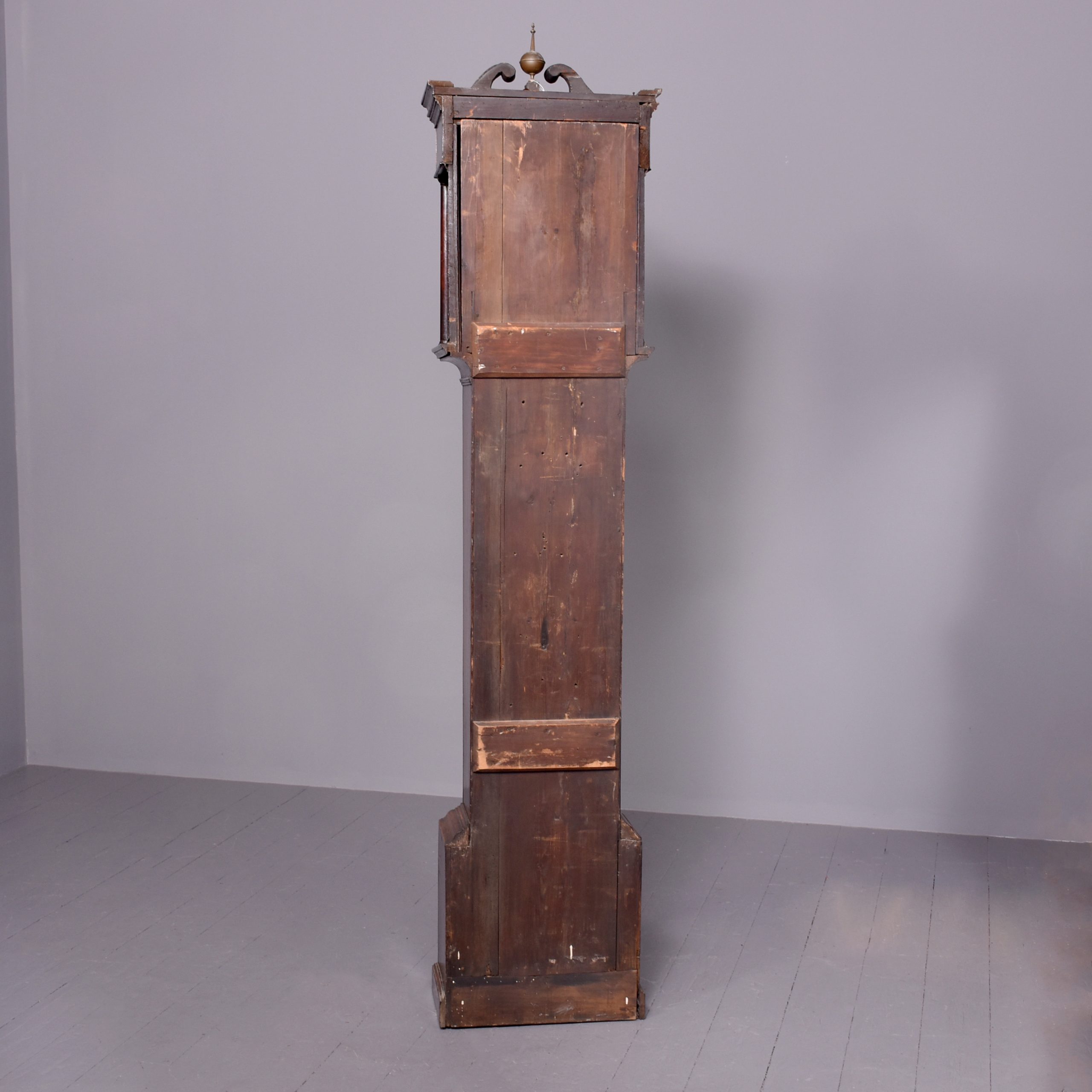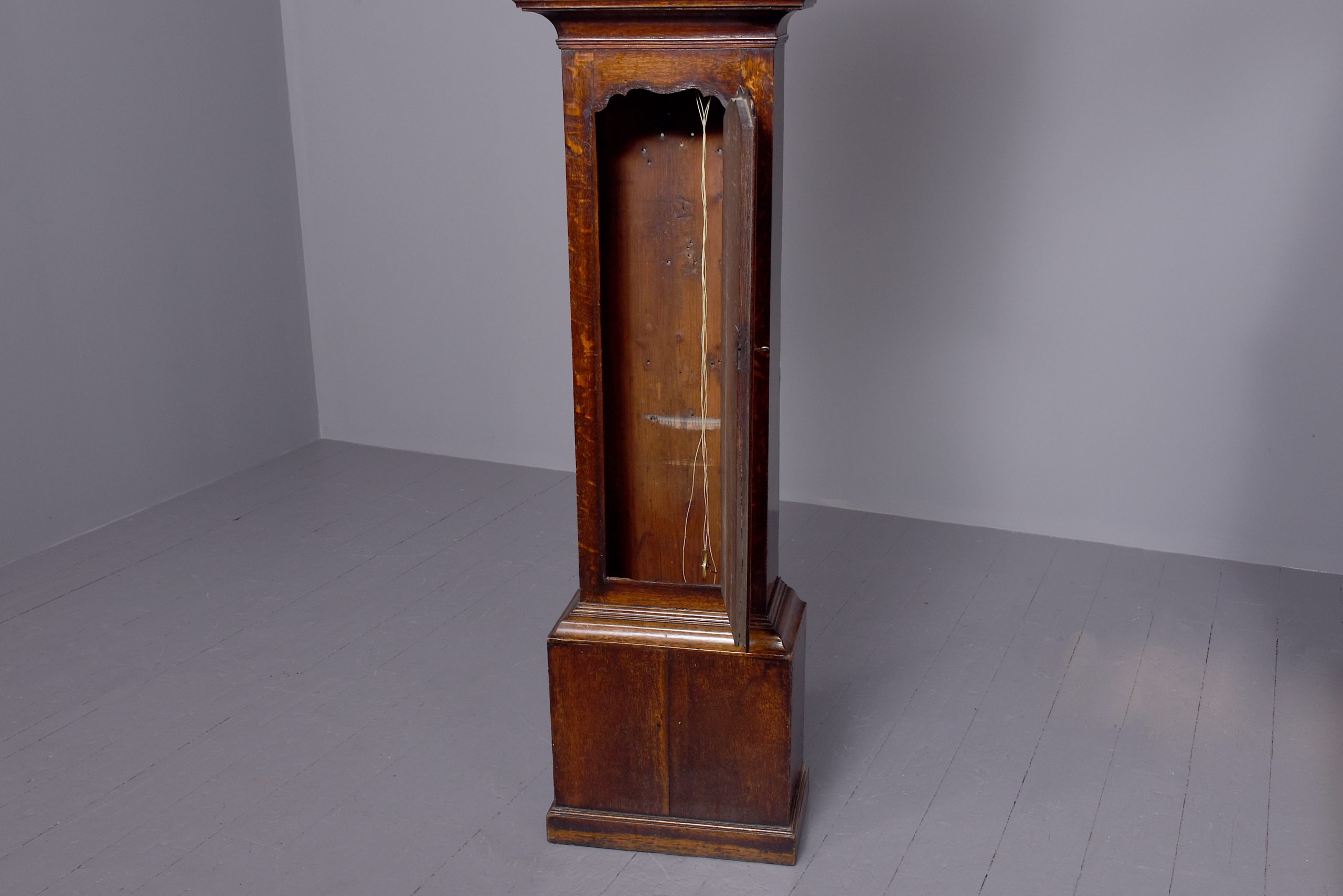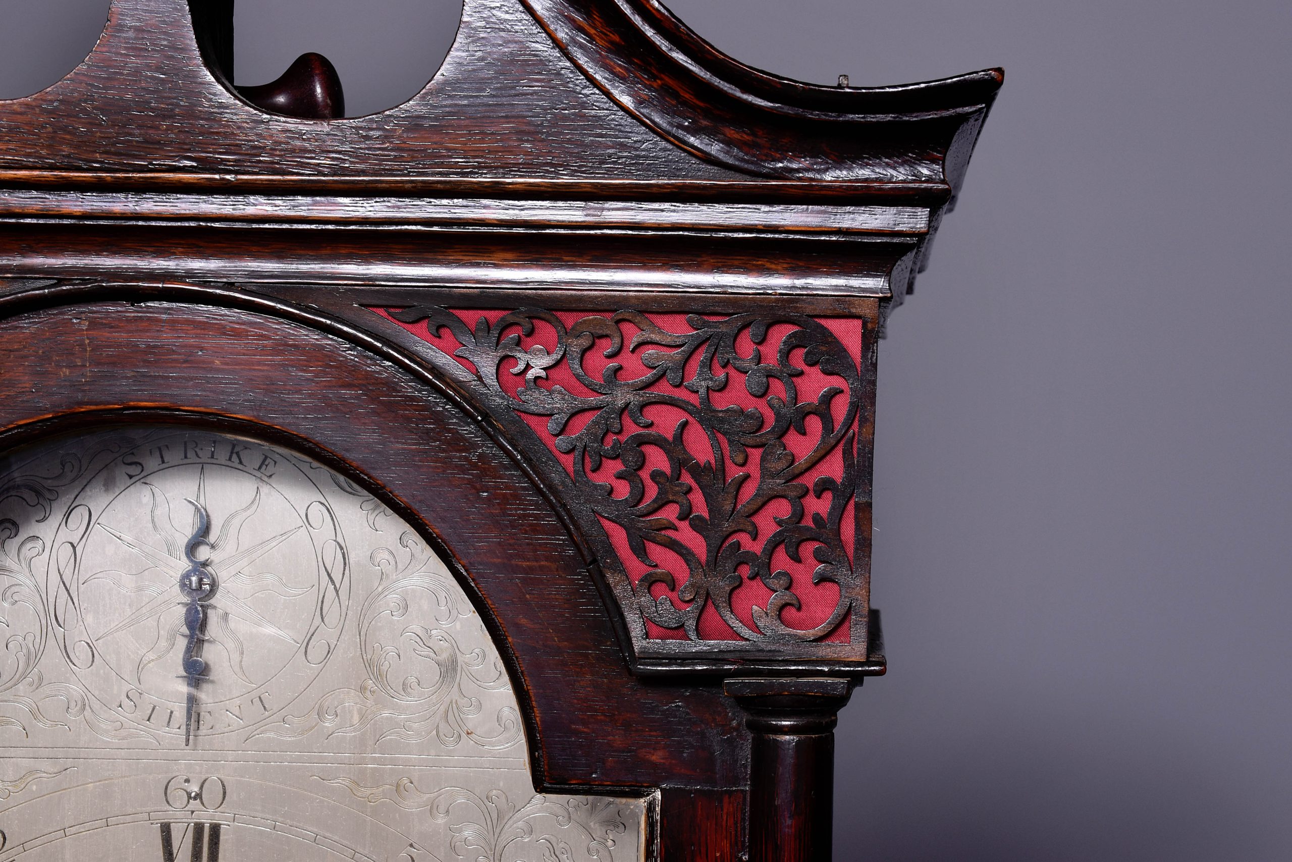 Circa 1790. A late George III oak cased Grandfather clock ‘Alex Dickie of Edinburgh’.(Alexander Richie active from 1762-1808), the classic horned top, centered by a cast bell with a spire above it, the front with an arched door with pierced fretwork and sound boards each side, silvered dial with Arabic and Roman numerals, pierced hands a date calendar, The door of the hood is flanked by a pair of circular columns, the base with a full-length arched door, the base with a simple with moulding, resting on an enclosed plinth. The price includes a full service and a guarantee.