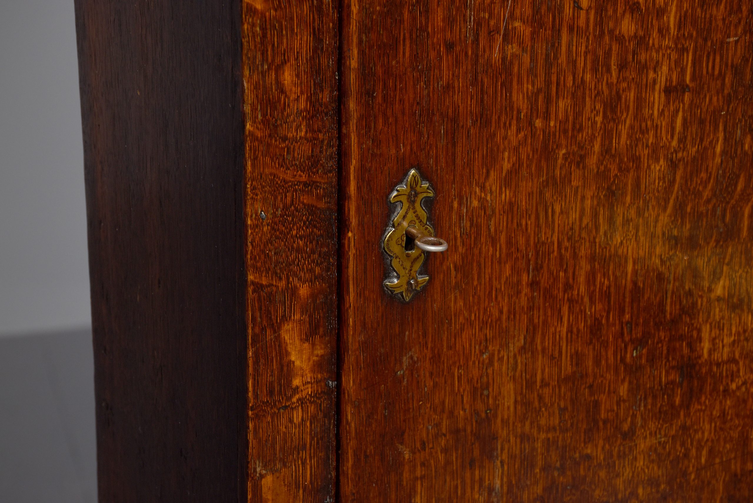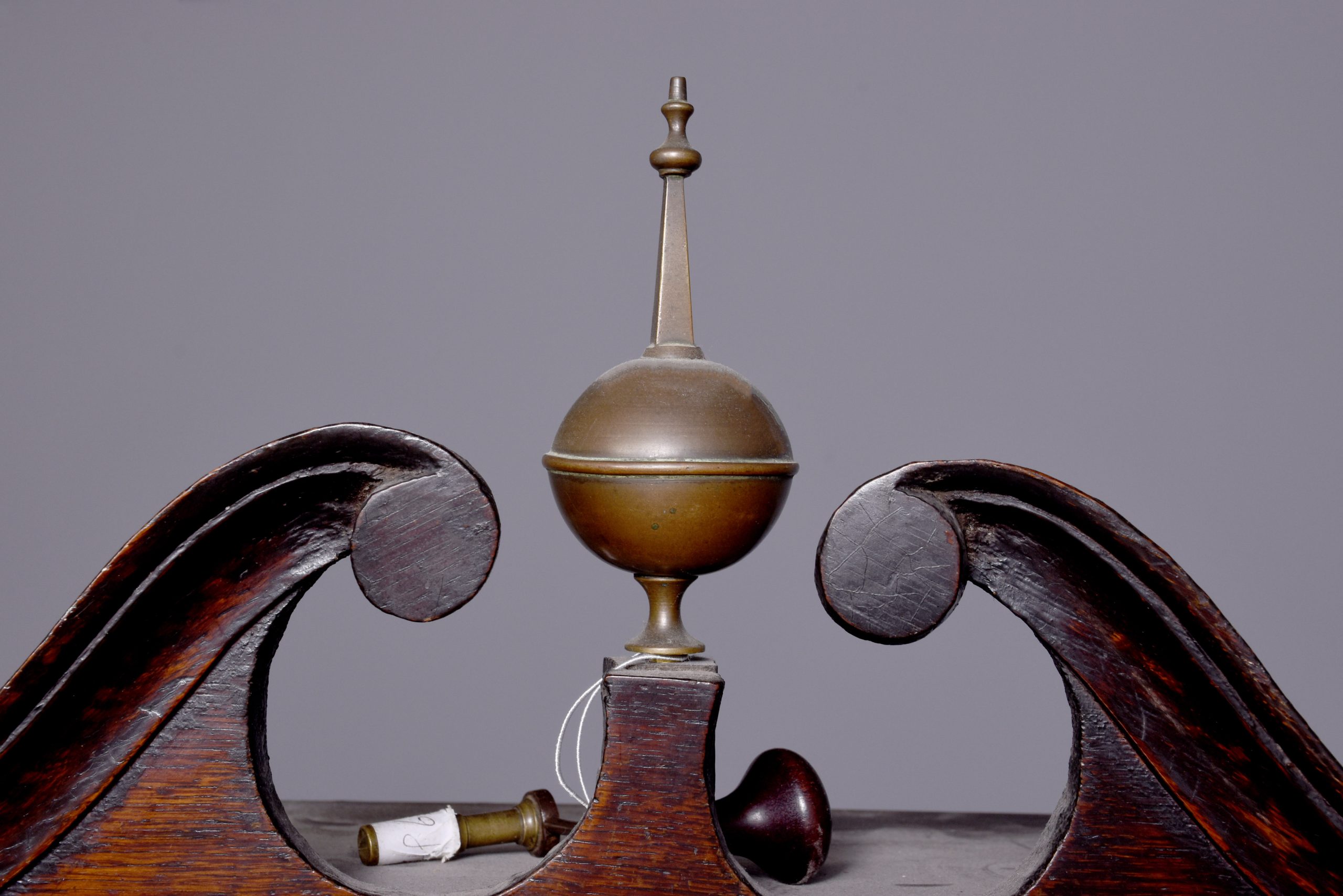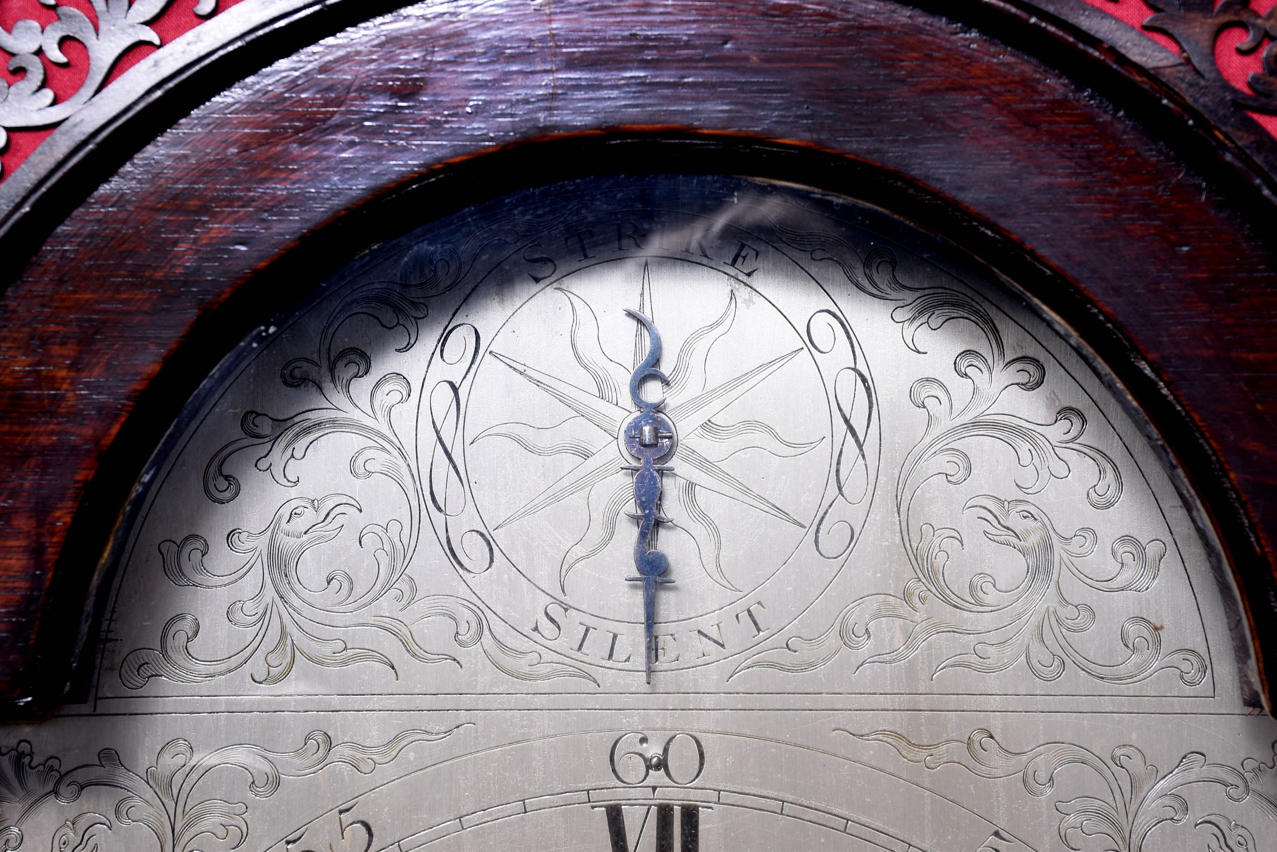 Circa 1790. A late George III oak cased Grandfather clock ‘Alex Dickie of Edinburgh’.(Alexander Richie active from 1762-1808), the classic horned top, centered by a cast bell with a spire above it, the front with an arched door with pierced fretwork and sound boards each side, silvered dial with Arabic and Roman numerals, pierced hands a date calendar, The door of the hood is flanked by a pair of circular columns, the base with a full-length arched door, the base with a simple with moulding, resting on an enclosed plinth. The price includes a full service and a guarantee.