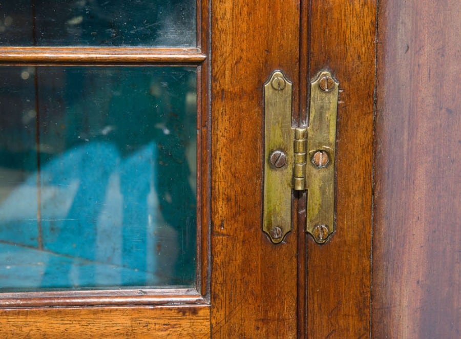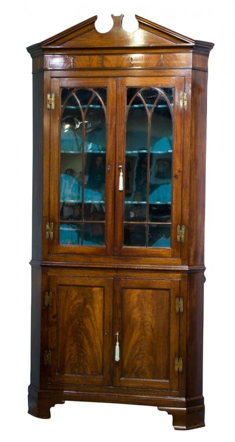A George III mahogany full standing corner cabinet with glazed top section enclosing shaped shelves ( original paint) original H shaped hinges and architectural pediment c1770