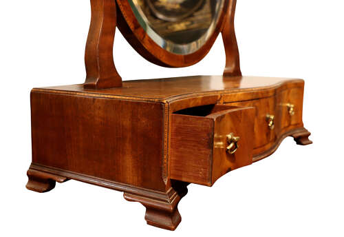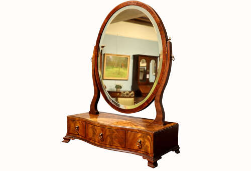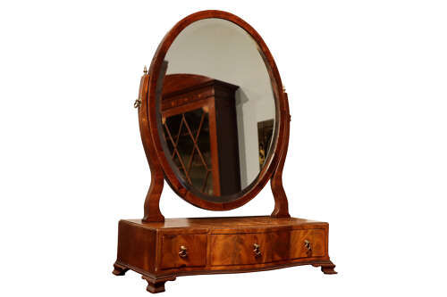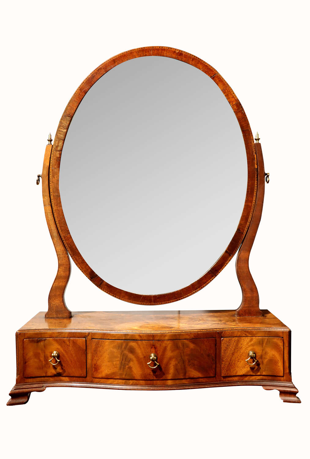 A charming late 18th to early 19th century mahogany dressing table mirror, the original oval bevelled glass held within a mahogany frame, supported by shaped uprights with brass finials. The serpentine base fitted with three drawers, each with brass ring handles, and raised on shaped bracket feet. The top and drawer fronts with delicate inlay decoration.