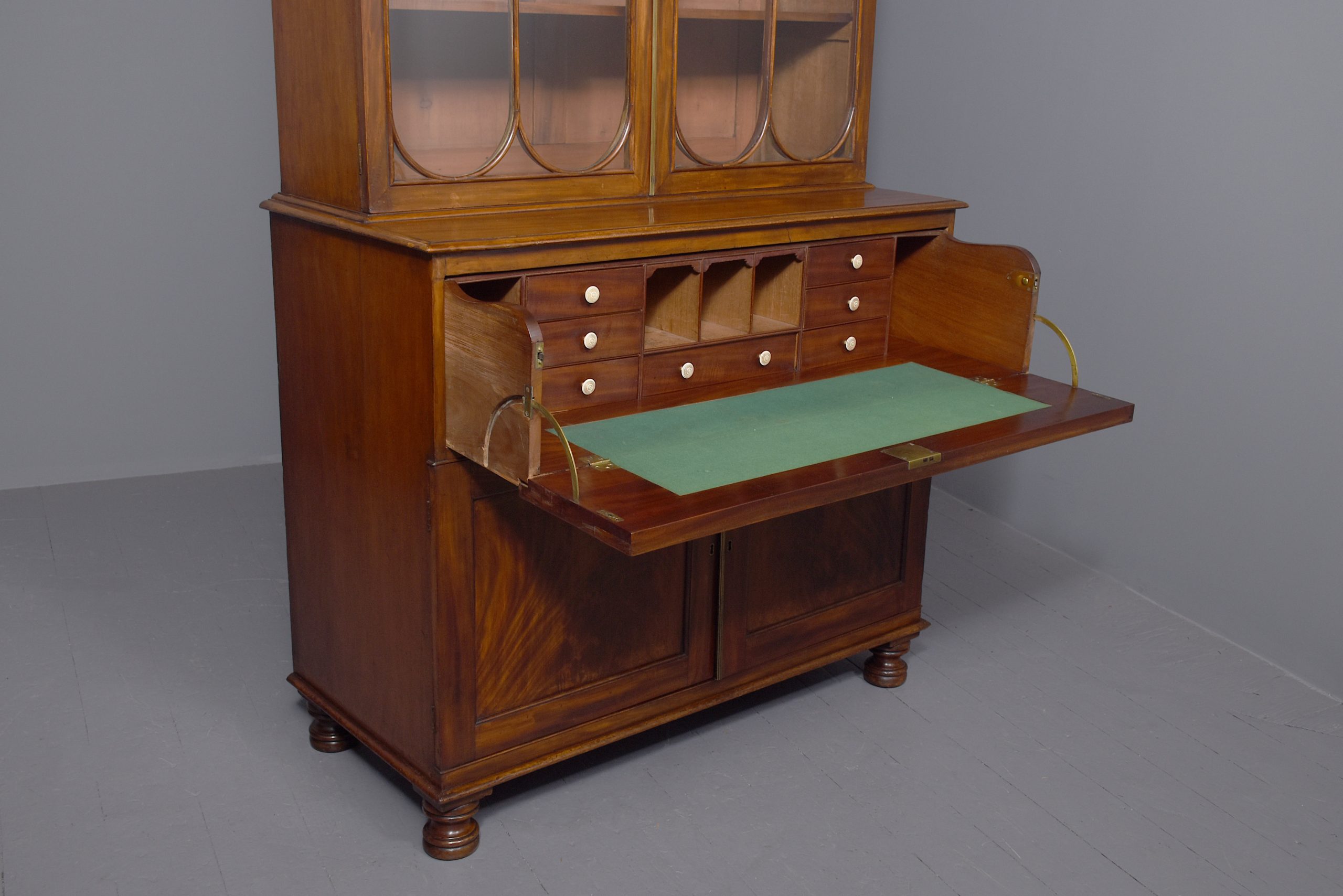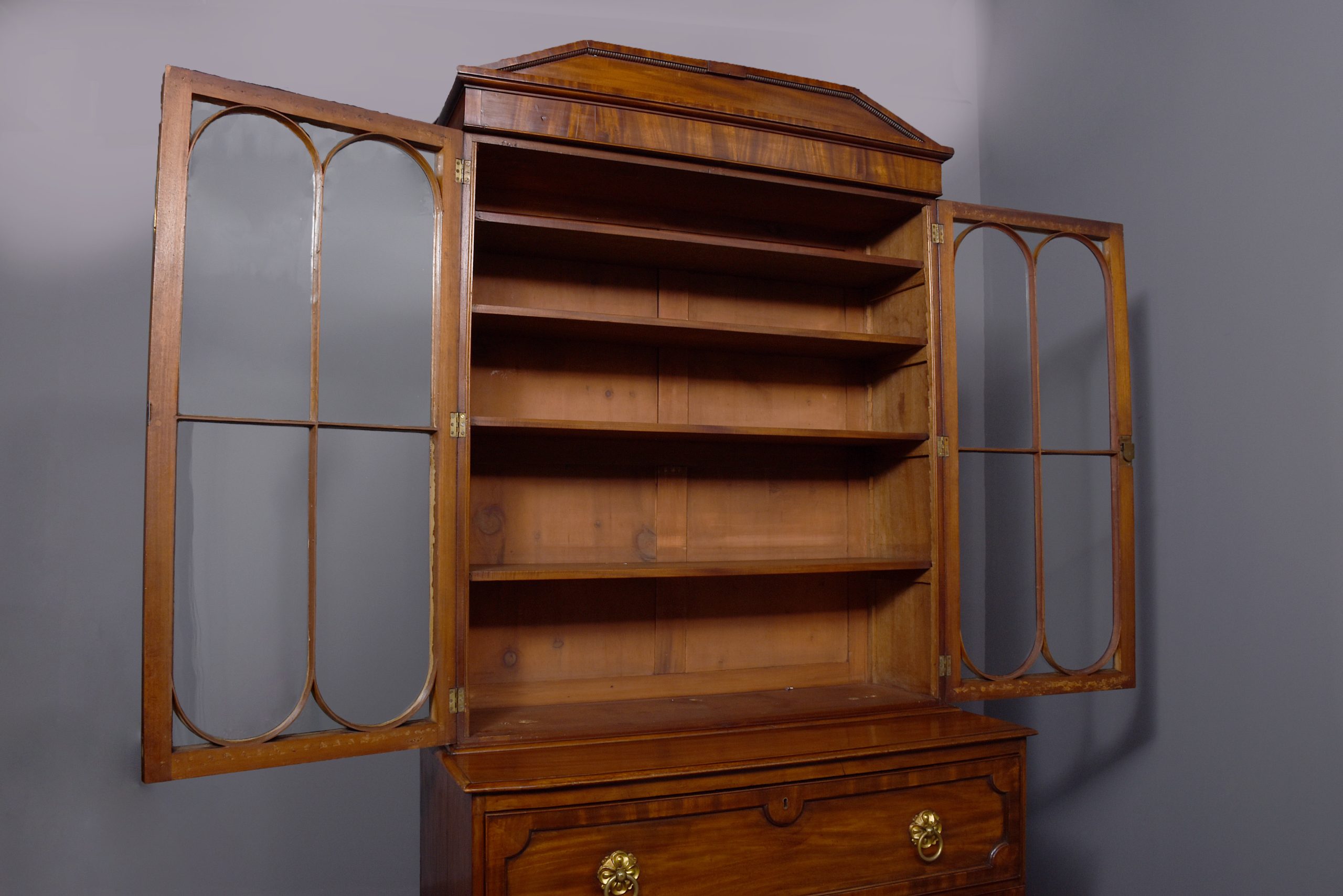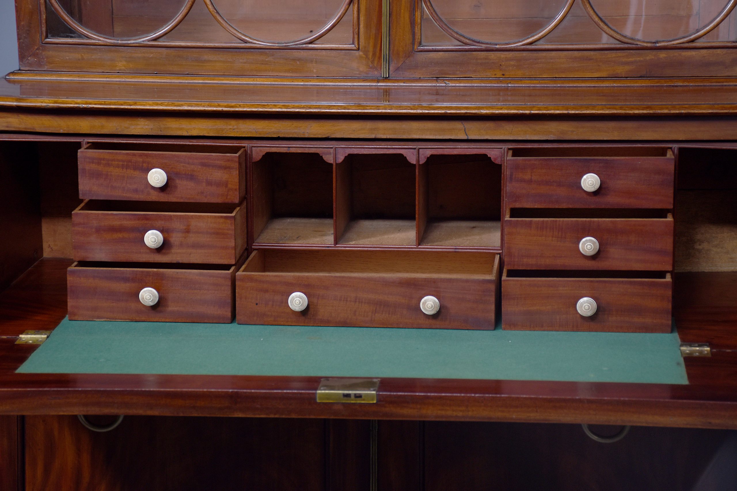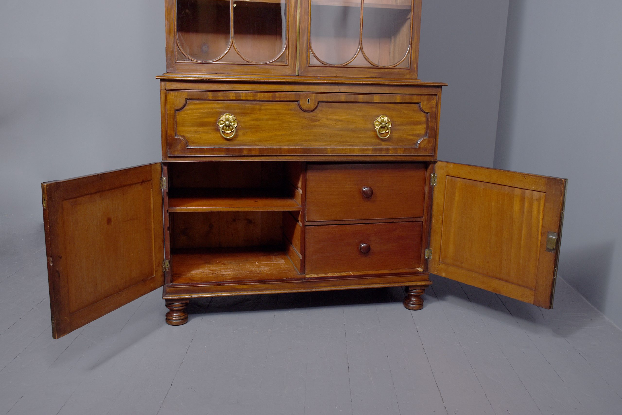 Circa 1820. A quality mahogany William IV secretaire cabinet bookcase, the cornice with an architectural pediment with fine beading and a raised section and a deep frieze, the front a pair of glazed doors with stylish astragals, with a brass beading separating the doors, inside with four adjustable shelves, the polished section in the base with a full-length secretaire drawer with gilded brass handles, elegant back plates and ring pull to the front, the inside is well appointed with various pigeon holes and drawers with turned and ribbed domed bone handles, and a felted writing surface, beneath this there is a pair of cupboards, the right-hand side and two drawers on the left-hand side, a single adjustable shelf, all resting on four squat turned bun feet, with excellent colour and patination and original glass.