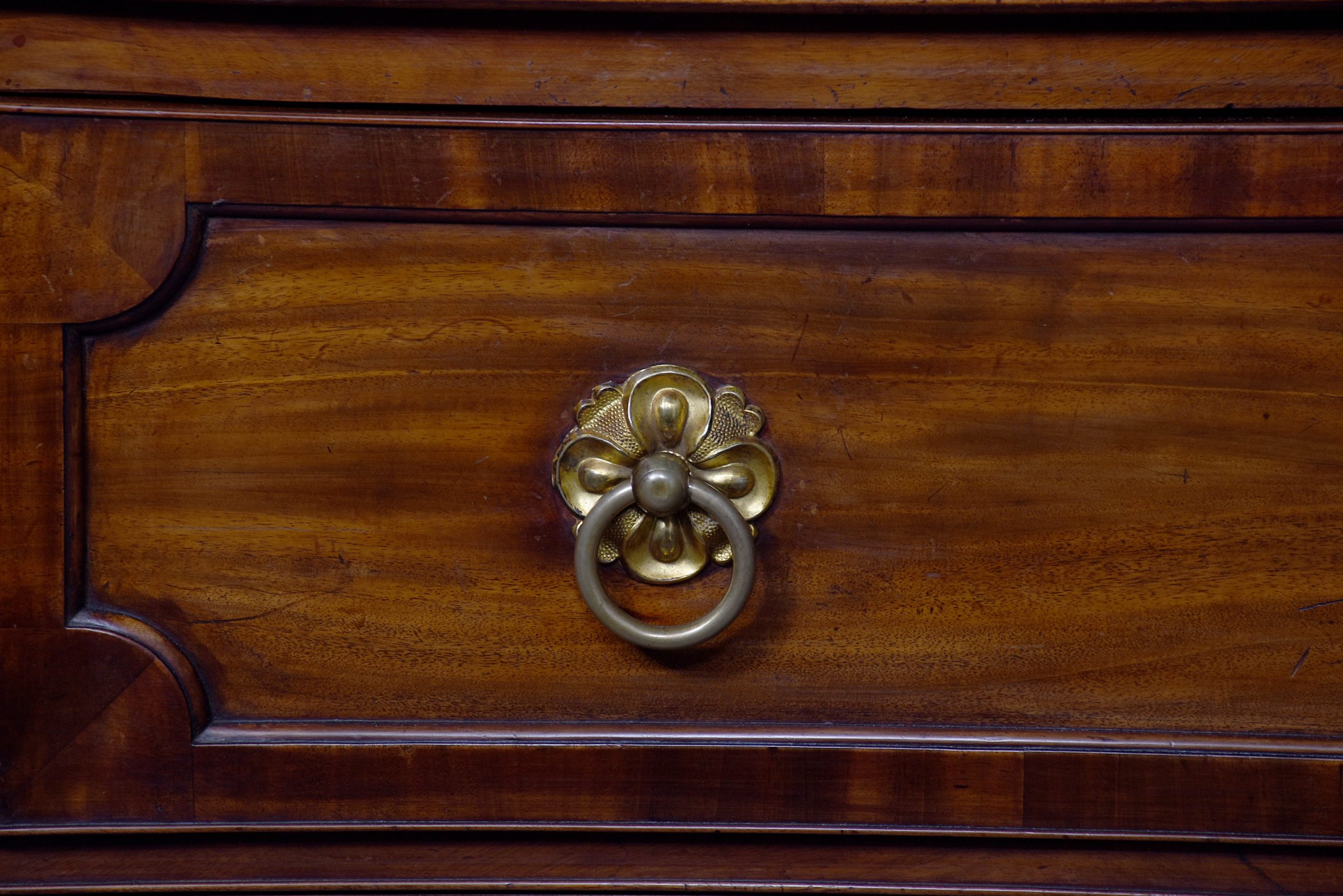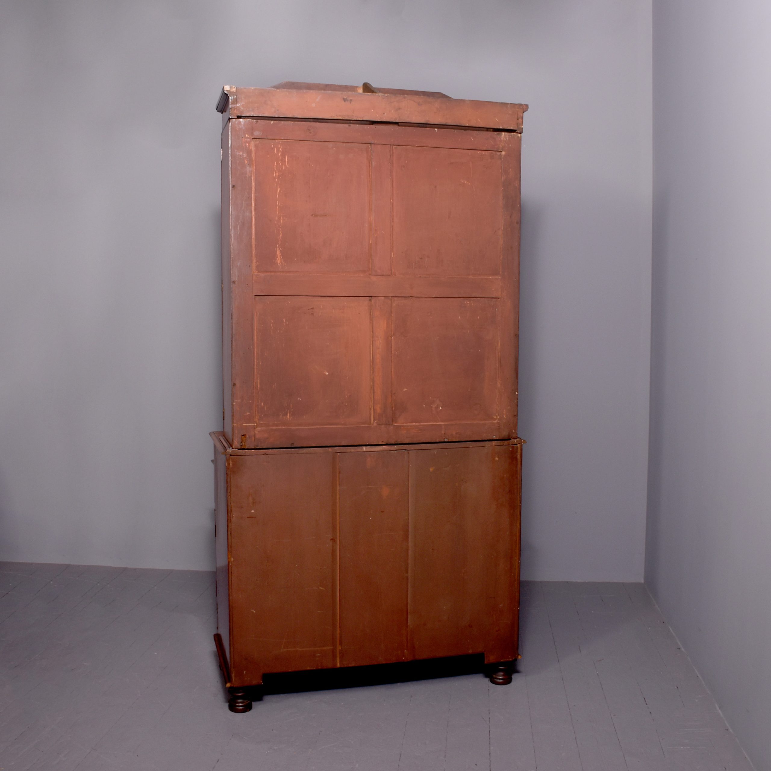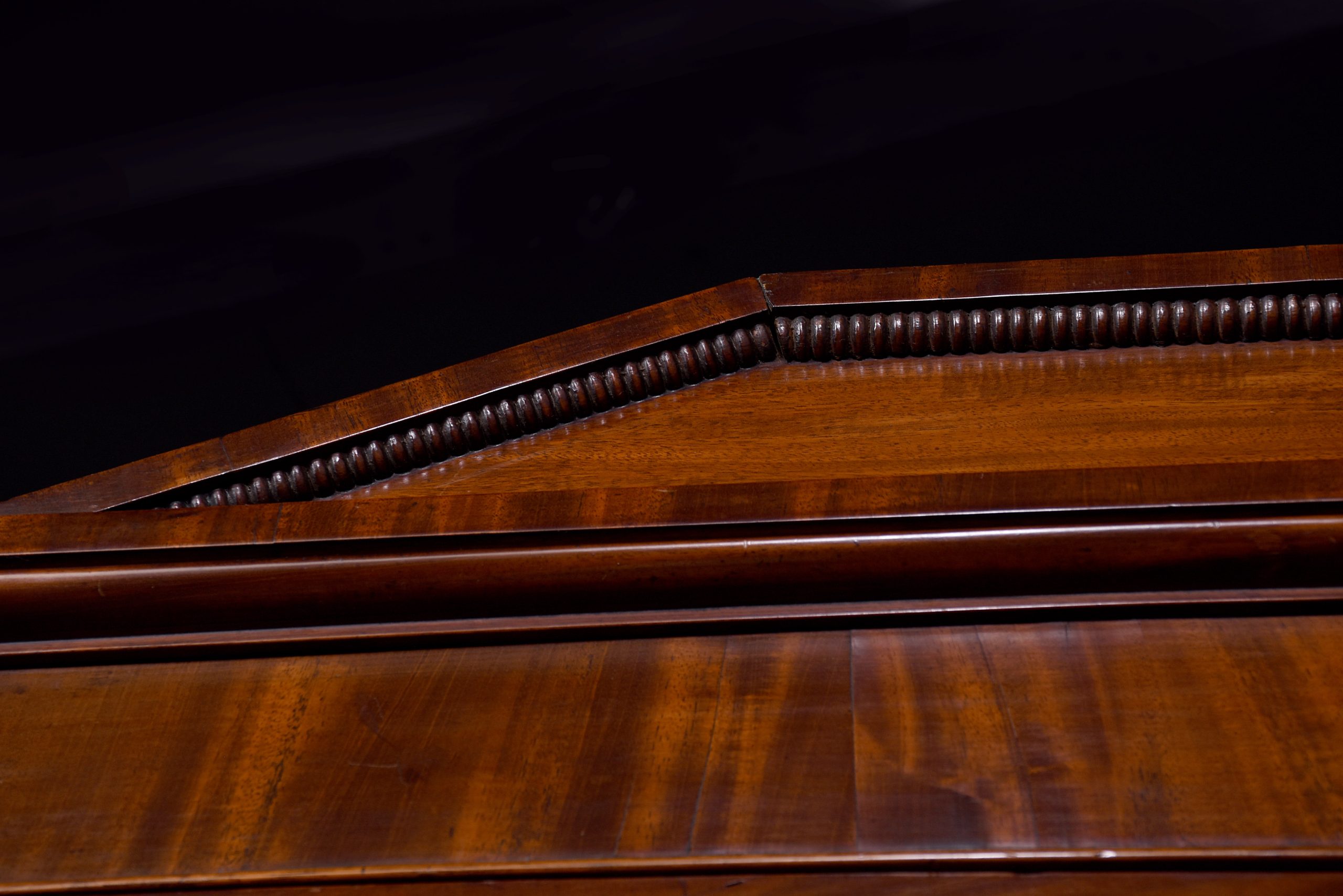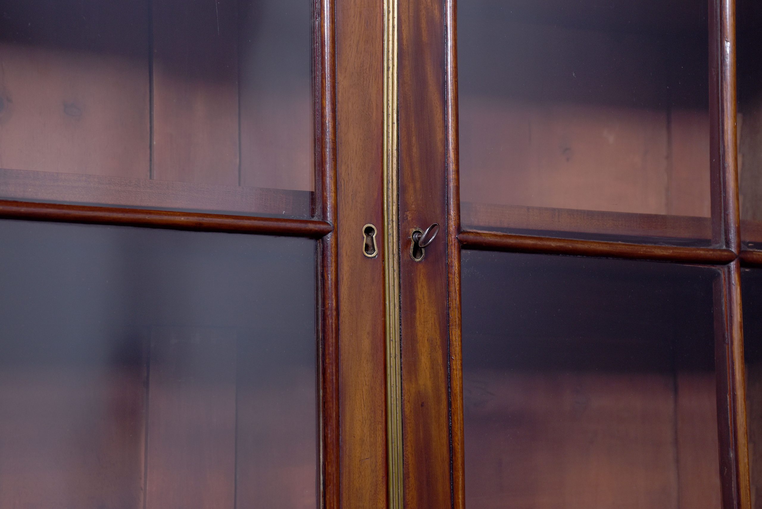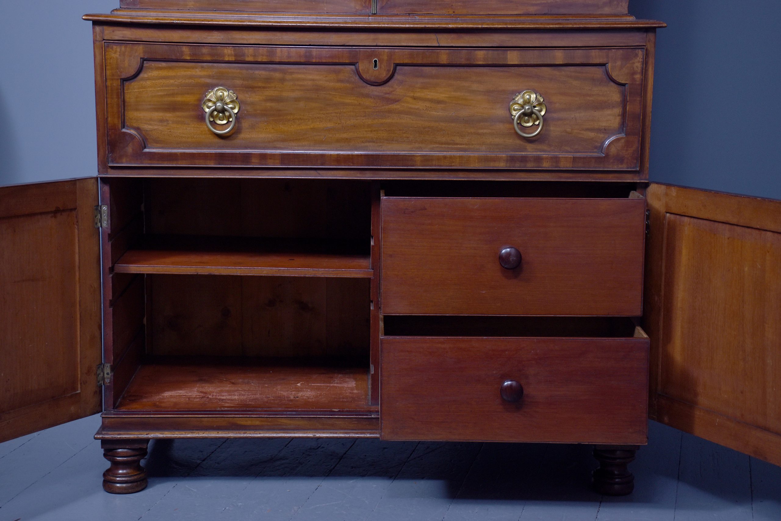 Circa 1820. A quality mahogany William IV secretaire cabinet bookcase, the cornice with an architectural pediment with fine beading and a raised section and a deep frieze, the front a pair of glazed doors with stylish astragals, with a brass beading separating the doors, inside with four adjustable shelves, the polished section in the base with a full-length secretaire drawer with gilded brass handles, elegant back plates and ring pull to the front, the inside is well appointed with various pigeon holes and drawers with turned and ribbed domed bone handles, and a felted writing surface, beneath this there is a pair of cupboards, the right-hand side and two drawers on the left-hand side, a single adjustable shelf, all resting on four squat turned bun feet, with excellent colour and patination and original glass.
