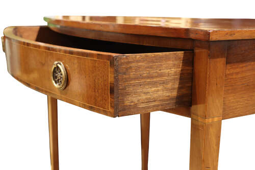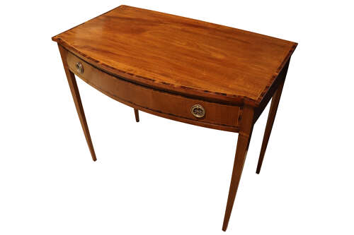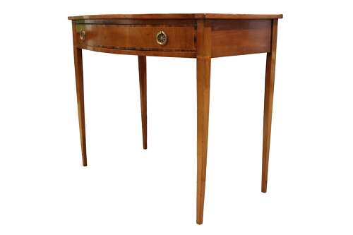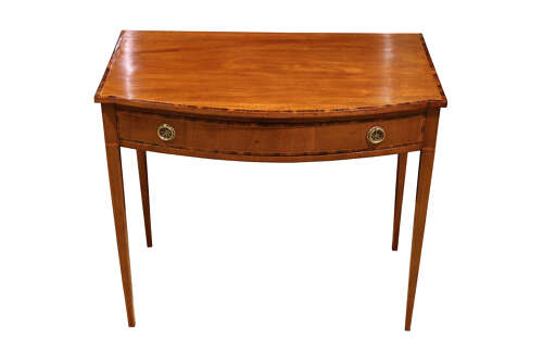 A Georgian rosewood banded table, circa 1820, of elegant proportions, the well-figured mahogany top with rosewood crossbanding and stringing above a bowfronted single drawer, fitted with gilt brass oval backplate handles. Raised on square tapered legs with line inlay, this fine early 19th century table shows the refined simplicity of the late Georgian period. The drawer constructed in oak with hand-cut dovetails. Warm patina and pleasing colour throughout.