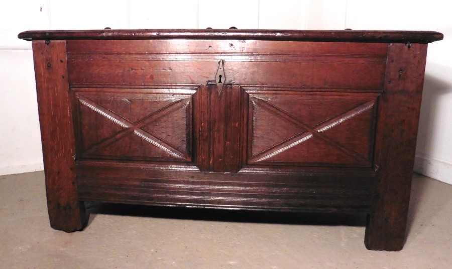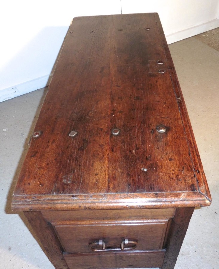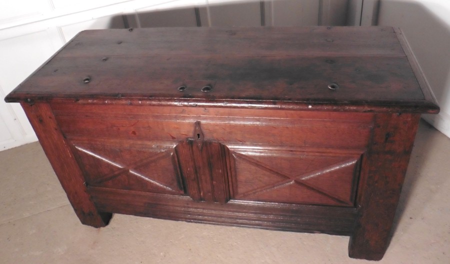 A Heavy French Panelled Oak Coffer The chest has 2 moulded panels on the front and 1 more on each side with a carrying handle This is a very heavy piece it is made from solid Oak The top of the box has a planked and moulded edge and it has a large lidded candle box inside This good rustic piece has been waxed and is in good sound condition for its age, it has blacksmith made hinges and handles The Coffer measures 56’’ wide x 25’’ deep and stands 27’’ high SR33 Manufacture Date : 1800 Materials : Oak