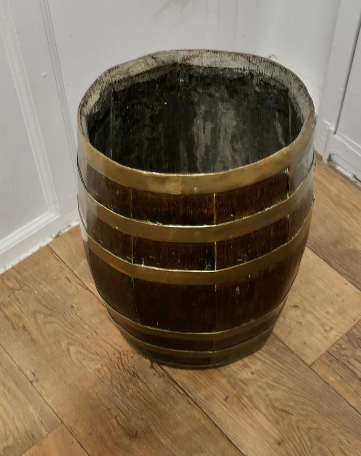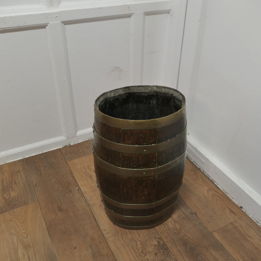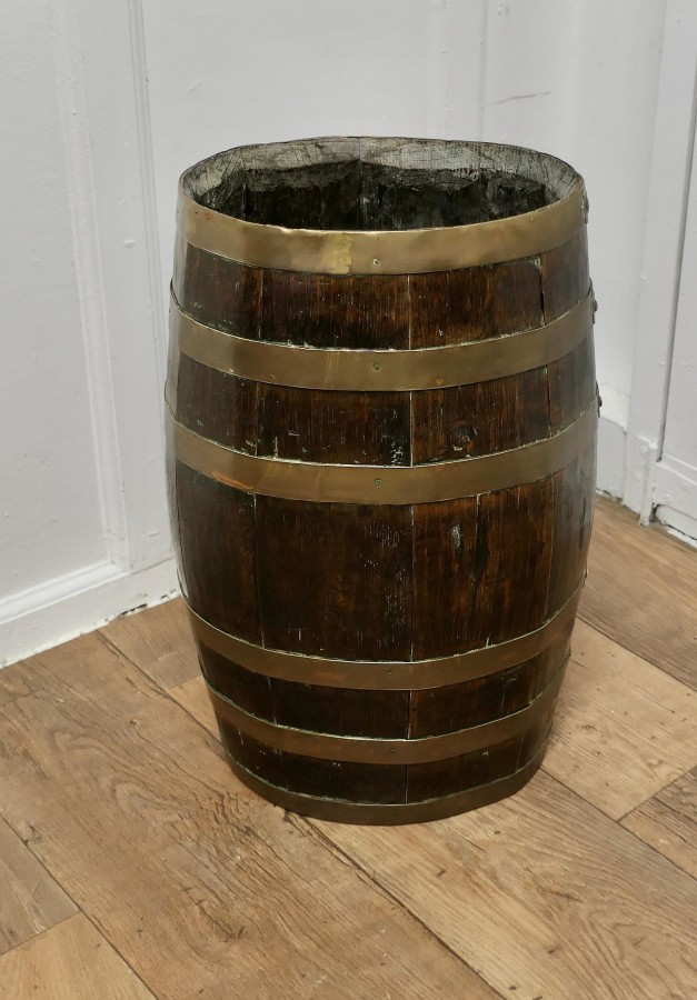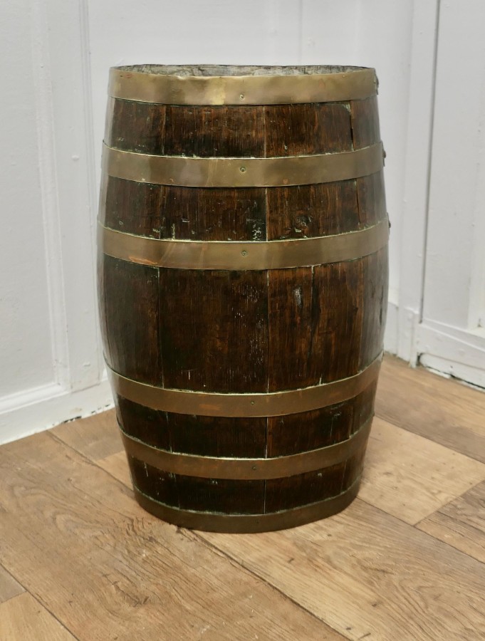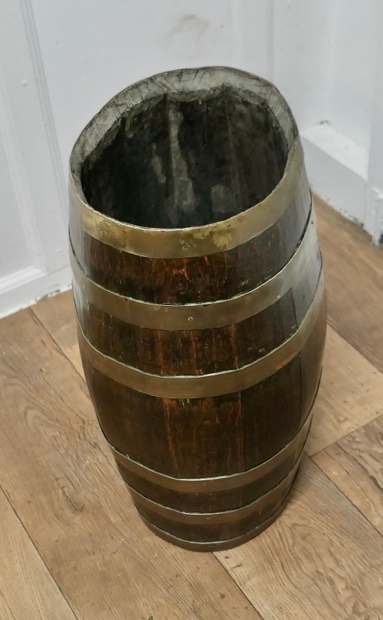 A Large Brass and Oak Barrel Stick Stand This good looking piece originated as a 19th Century Rum Barrel, it is made with oak staves and bound with 6 wide brass hoops The Barrel is in good attractive condition, it is 22” high and 14” x 11” oval diameter VY200 Manufacture Date : 19th Century Materials : Oak
