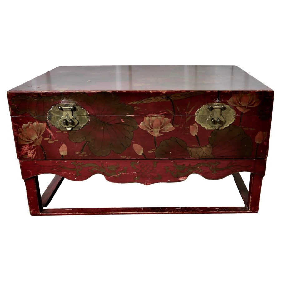 A Large Chinoiserie Marriage Chest on Stand This Marriage Chest is a bright and colourful piece, the chest is in Fire Red and painted with large stylised chrysanthemum flowers The chest has 4 carrying handles and has its own stand, the interior is very clean and lined in oriental print This is an old piece and has some signs of a previous life, the box would make a very attractive coffee table, it is 32” long, 24” deep, 17” high on its stand ZX70 Manufacture Date : 1920 Materials : Lacquer