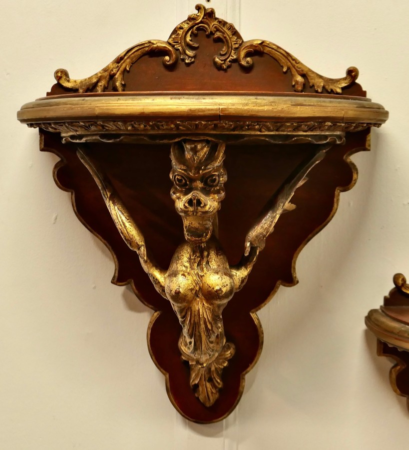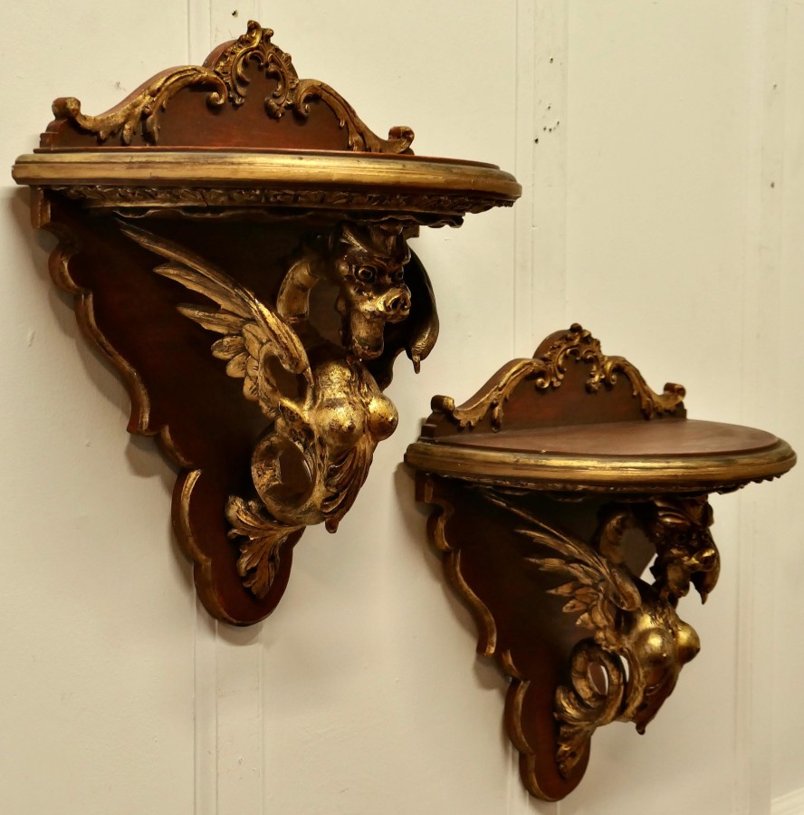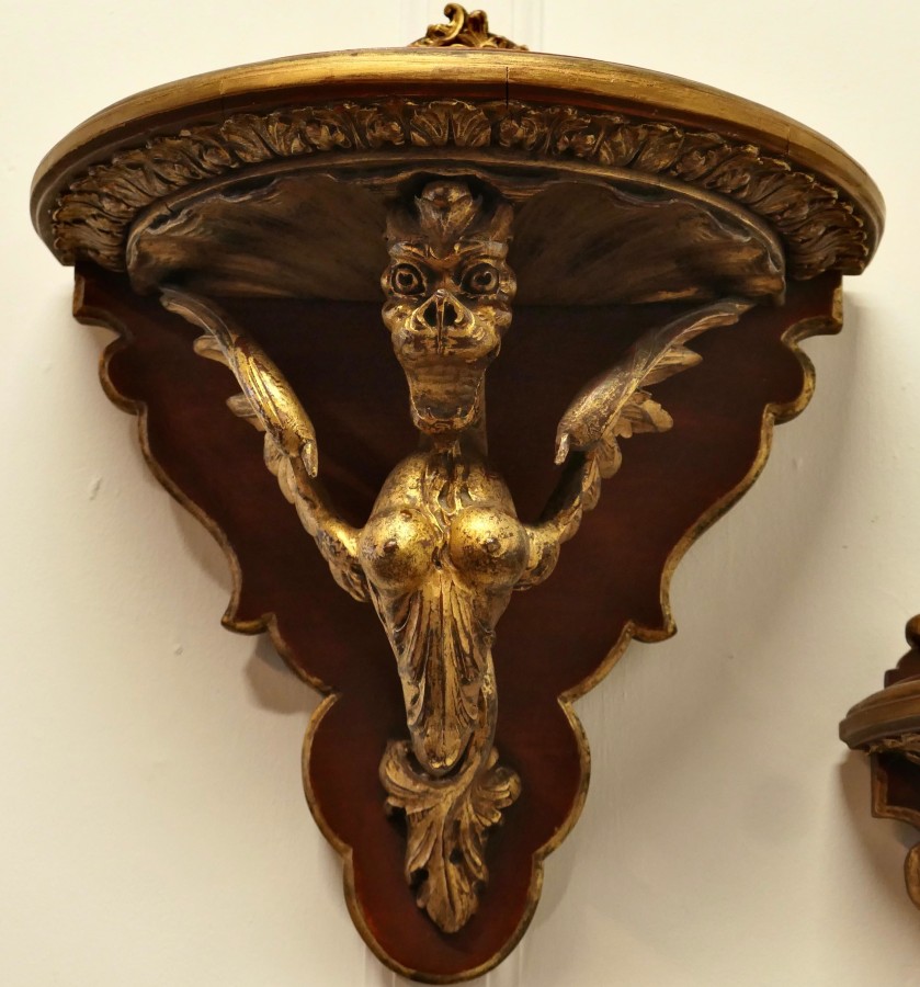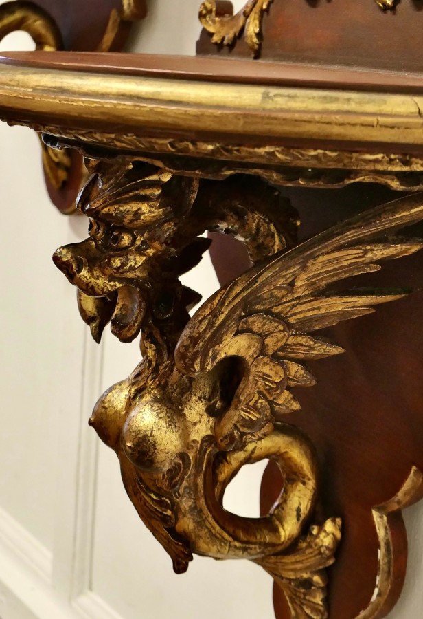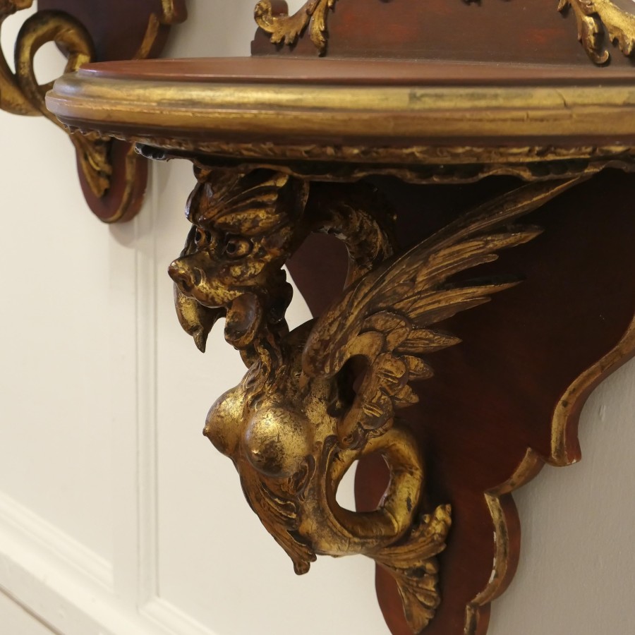A Large Pair of Italian Carved Gilt Wall Brackets These are a beautifully carved pair, Winged Griffins with breasts, piercing expression in their eyes and scroll feet supporting large Demi-lune wall brackets There are superb pieces in good condition, they are 21” tall, 18” across and 11” out from the wall VY90 Manufacture Date : 19th Century Materials : Chestnut