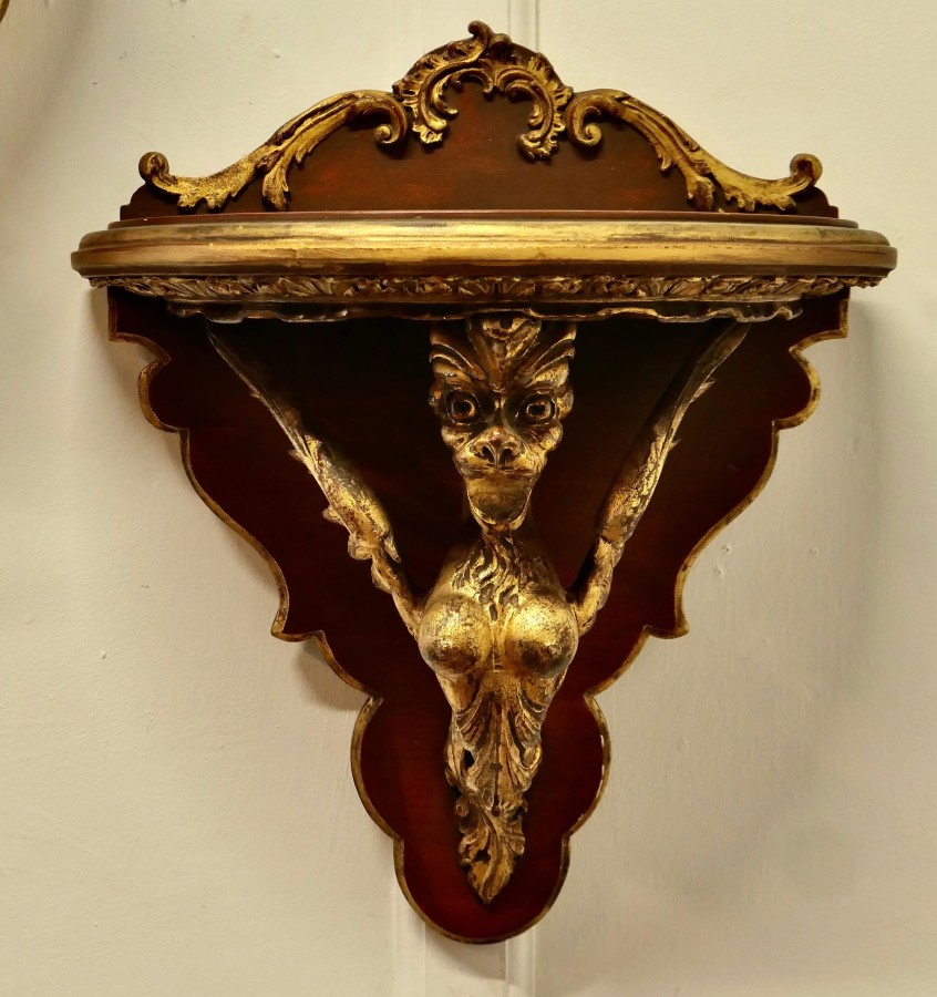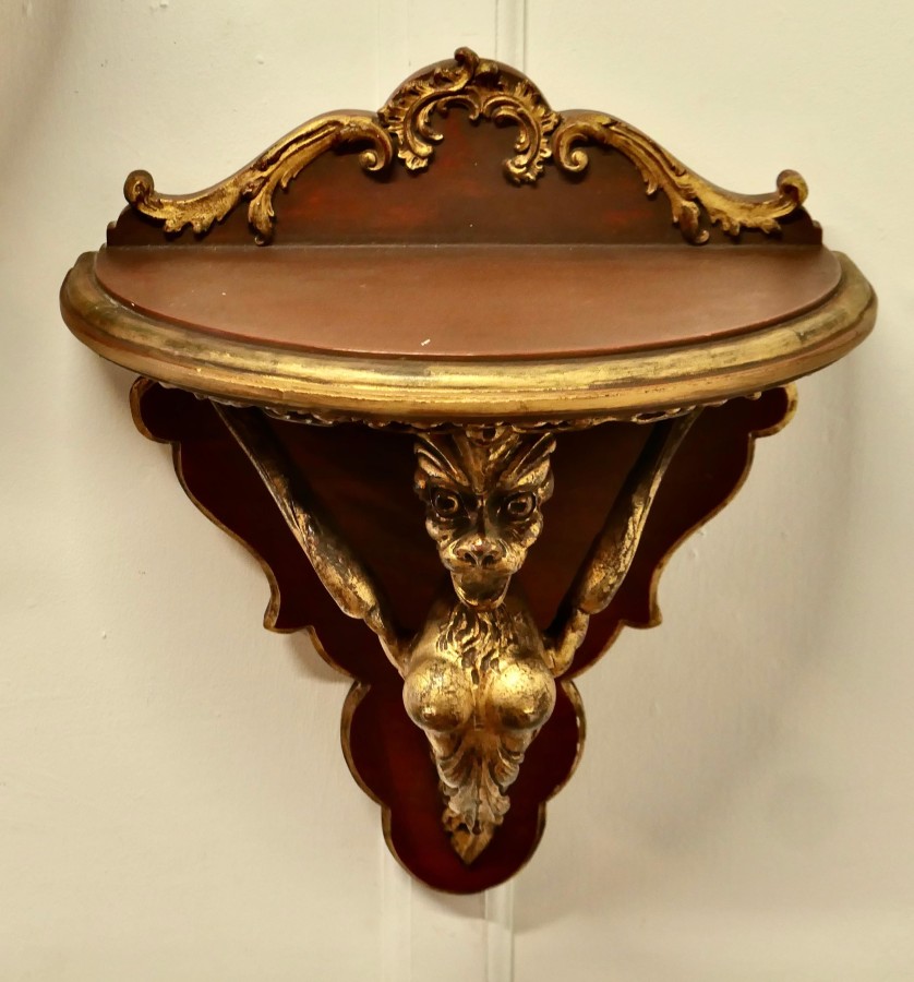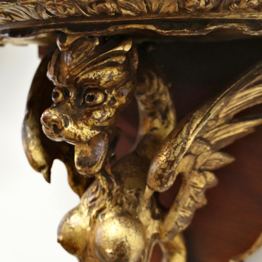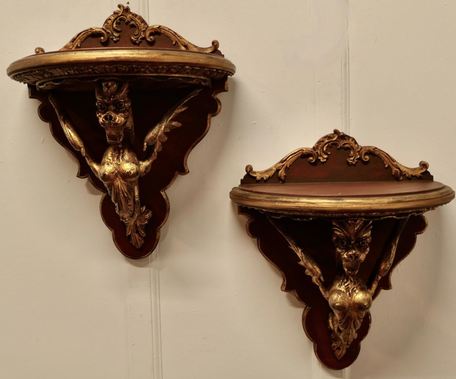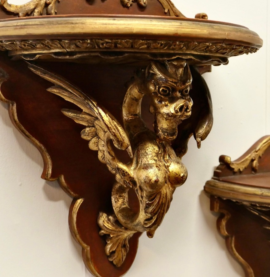 A Large Pair of Italian Carved Gilt Wall Brackets These are a beautifully carved pair, Winged Griffins with breasts, piercing expression in their eyes and scroll feet supporting large Demi-lune wall brackets There are superb pieces in good condition, they are 21” tall, 18” across and 11” out from the wall VY90 Manufacture Date : 19th Century Materials : Chestnut