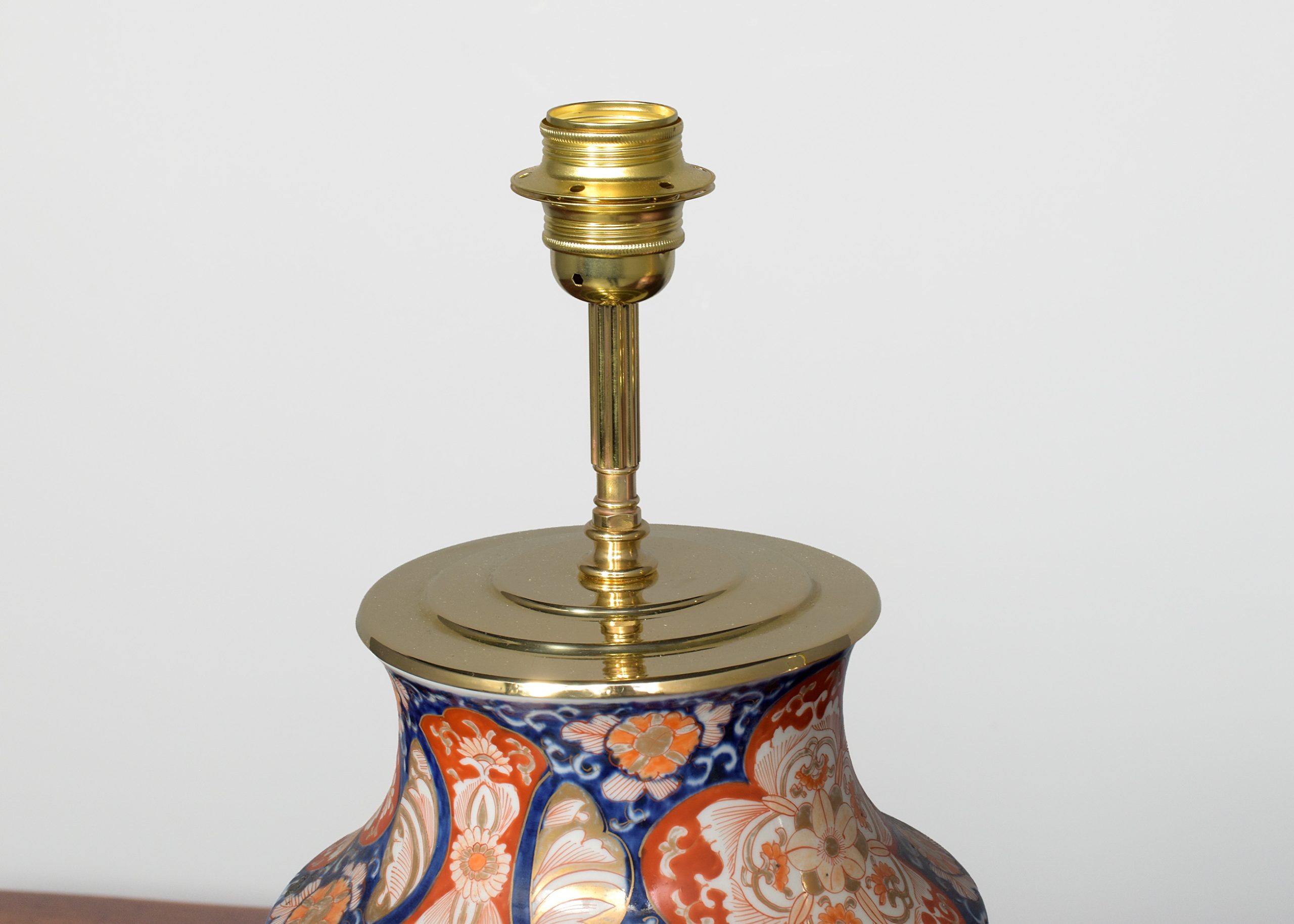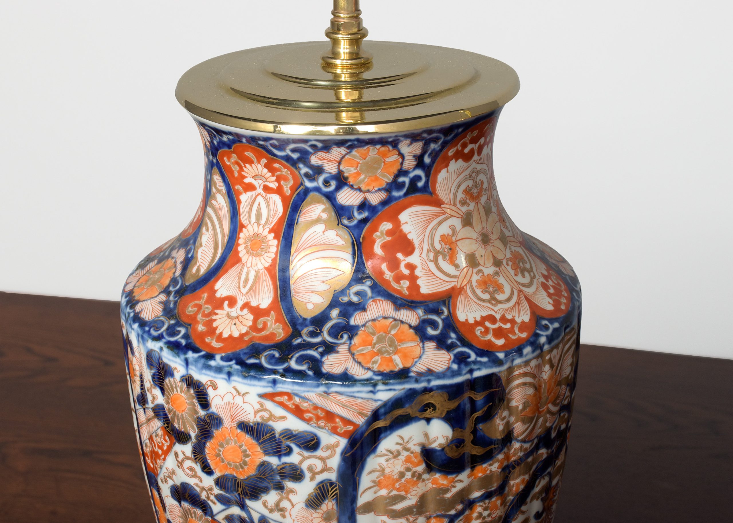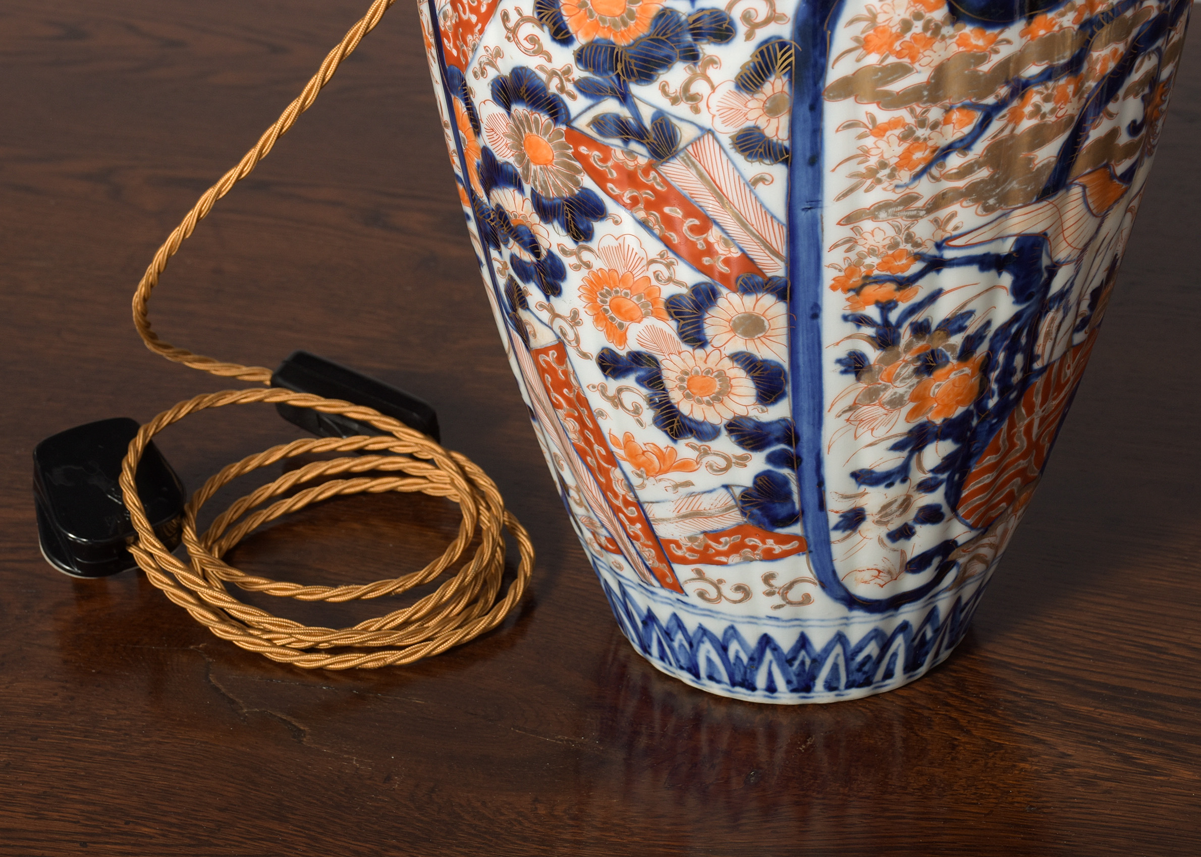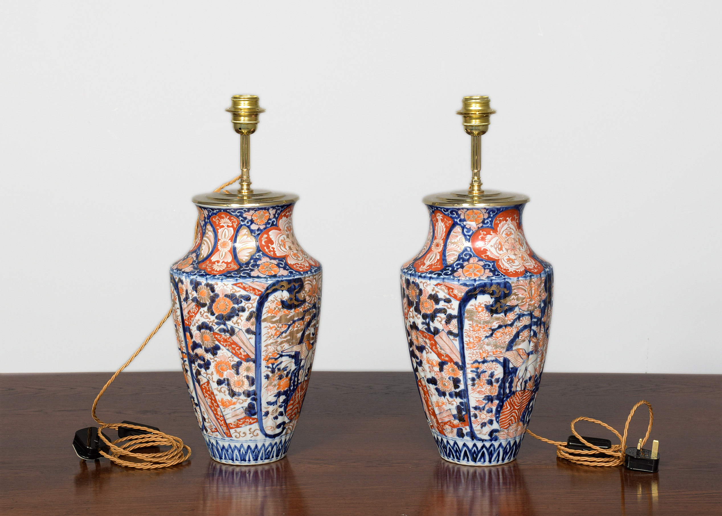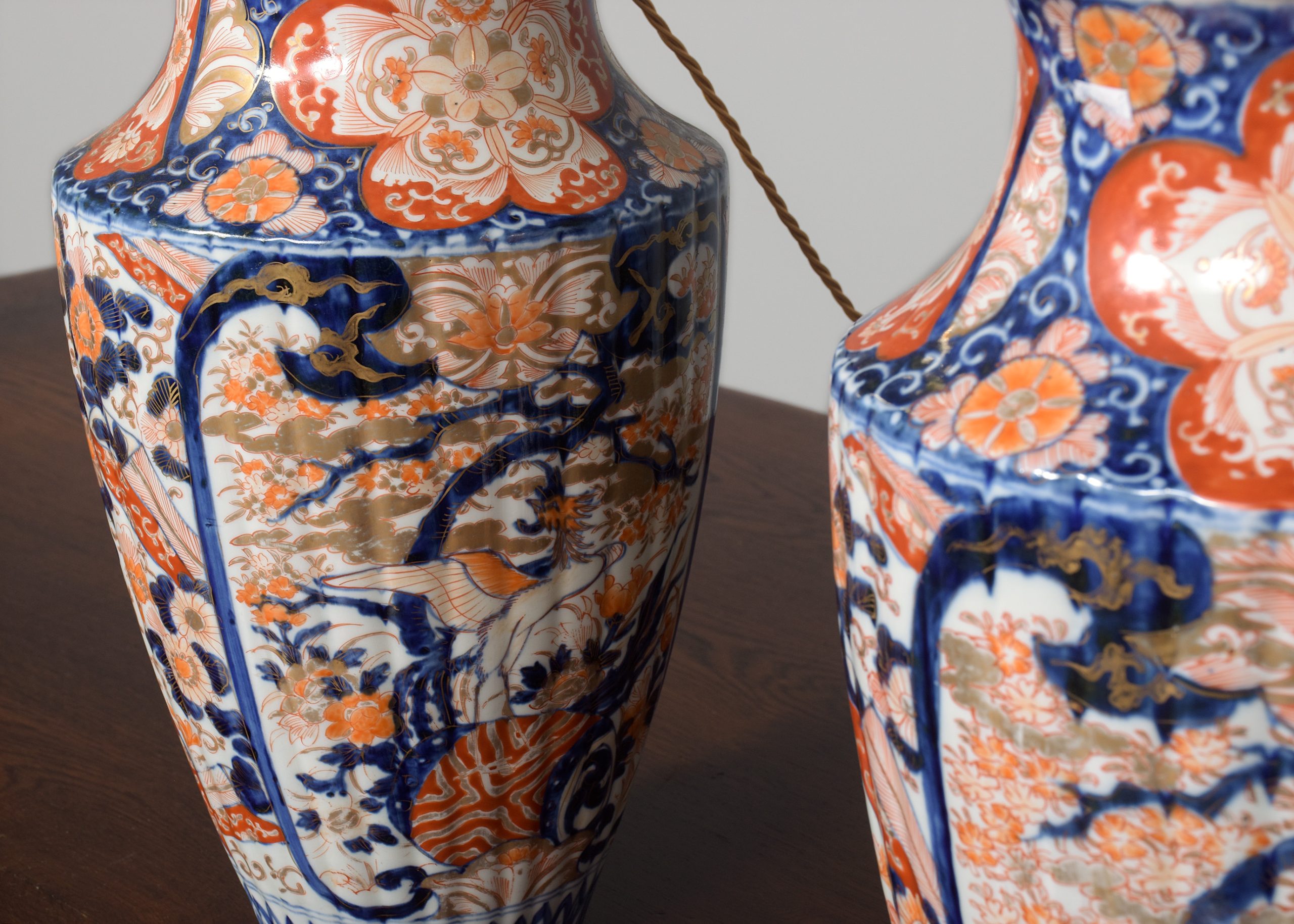 Circa 1880. Pair of Meiji period Imari vases recently converted to lamps, the tapering fluted bodies with a curvaceous neck with classic Imari patterns throughout using bold colours of red and cobalt blue, the top with a stepped brass cap and fluted upright with lamp holder, finished with gold fabric covered flex with an inline switch.