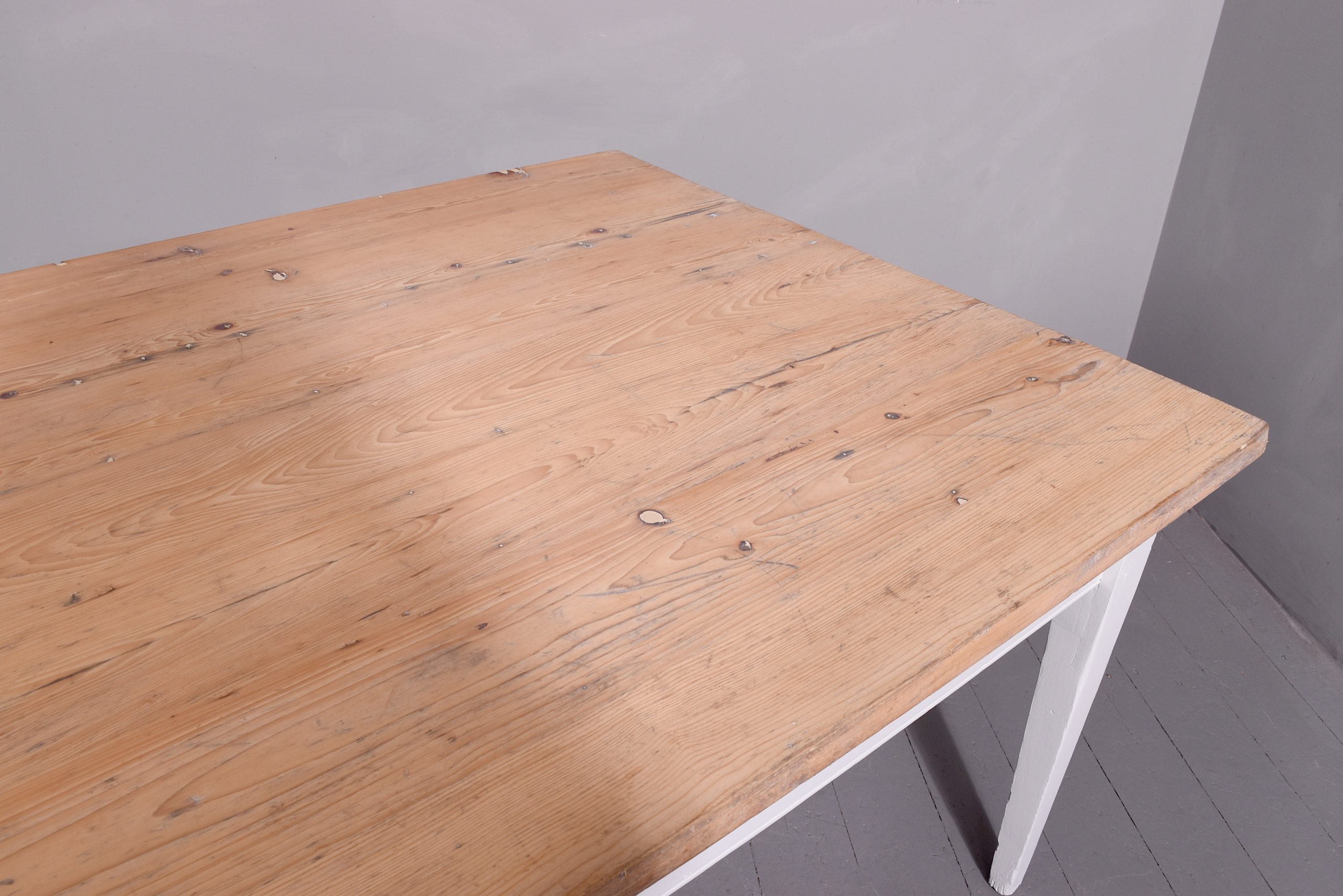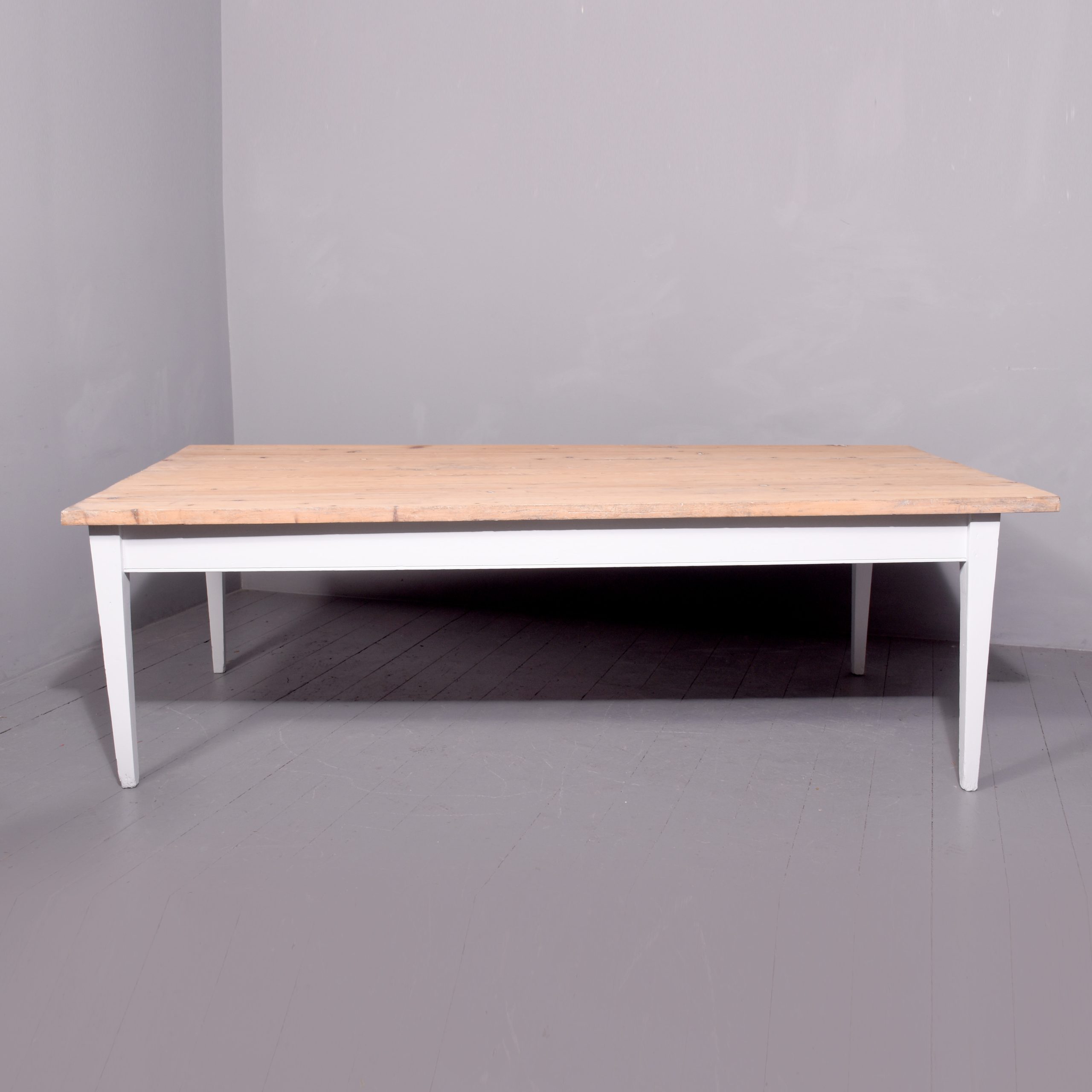 Circa 1870. A massive pine and painted kitchen table, the solid top made with several boards with a simple fore-edge, the top is 3.5cm thick, resting on a painted base with frieze, supported on four square tapering legs. Recently painted.