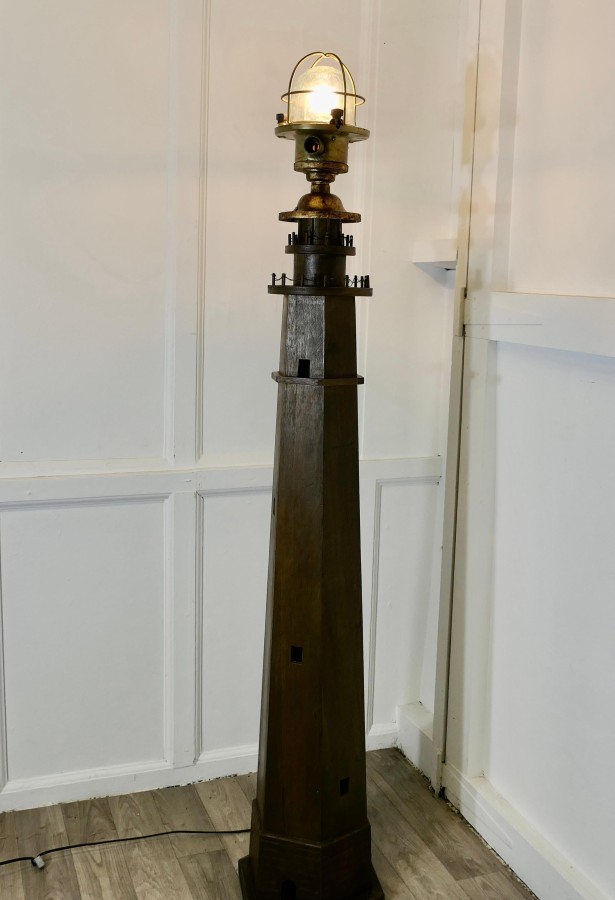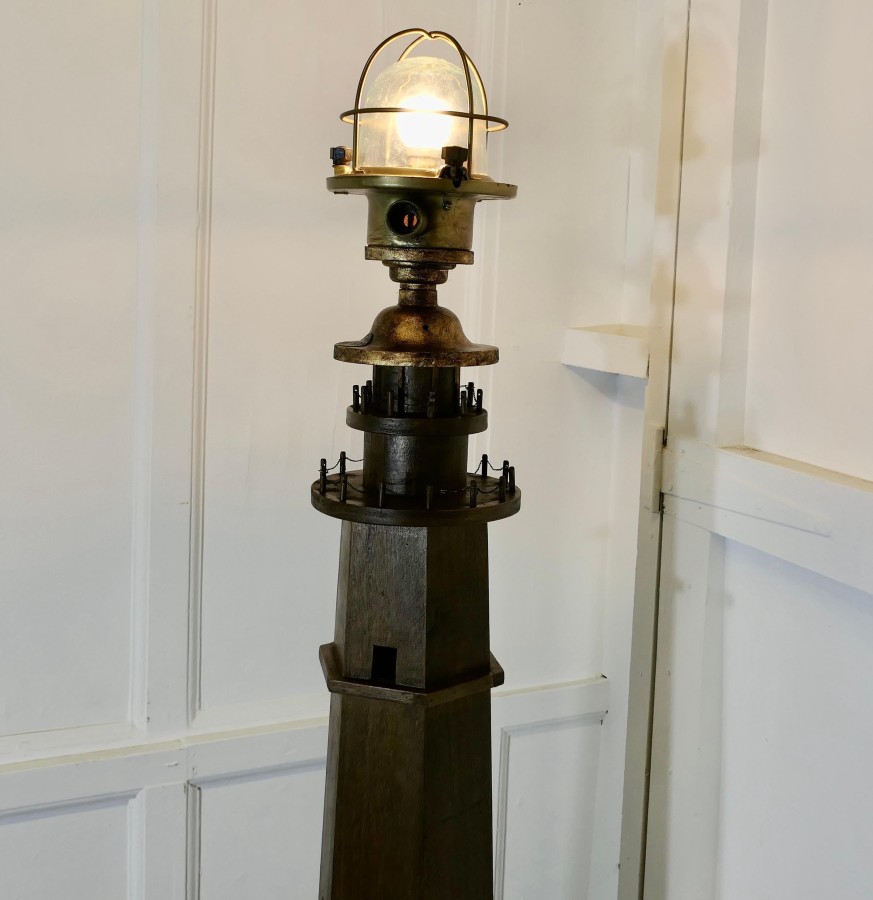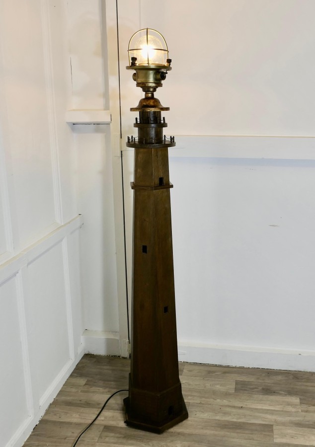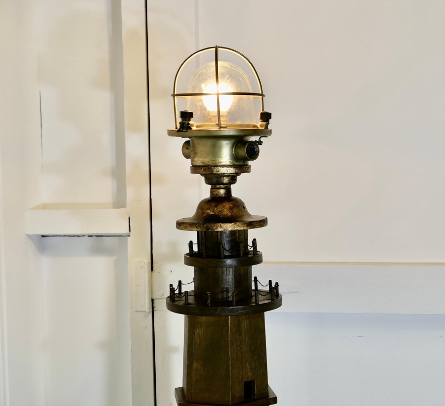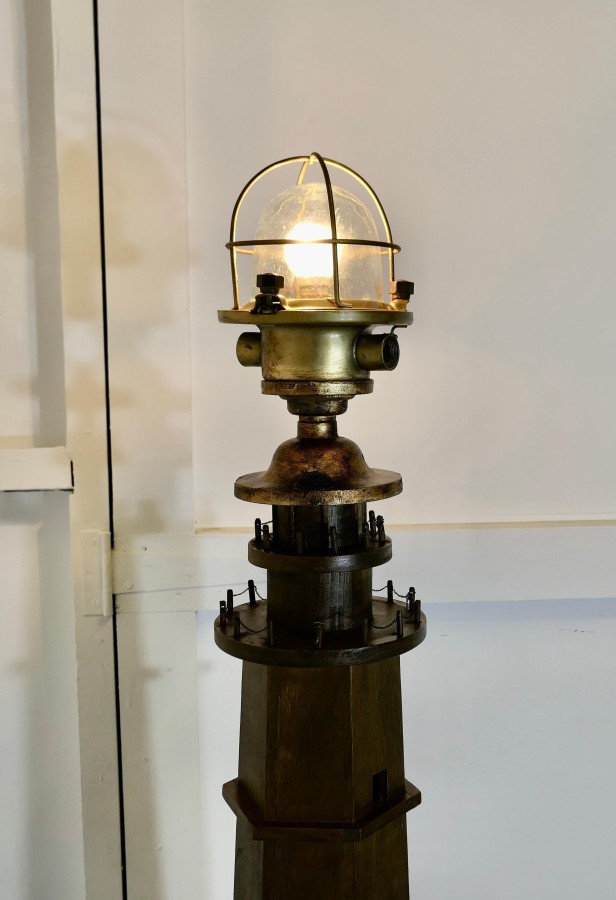 A Novelty Lighthouse Floor Lamp Great fun and the ideal piece for a seaside theme, this one off piece is made in wood and has an old reconditioned brass Nautical Post light at the top The Lamp is 65” tall and 11” diameter at the floor TZX56 Manufacture Date : 1960 Materials : Brass