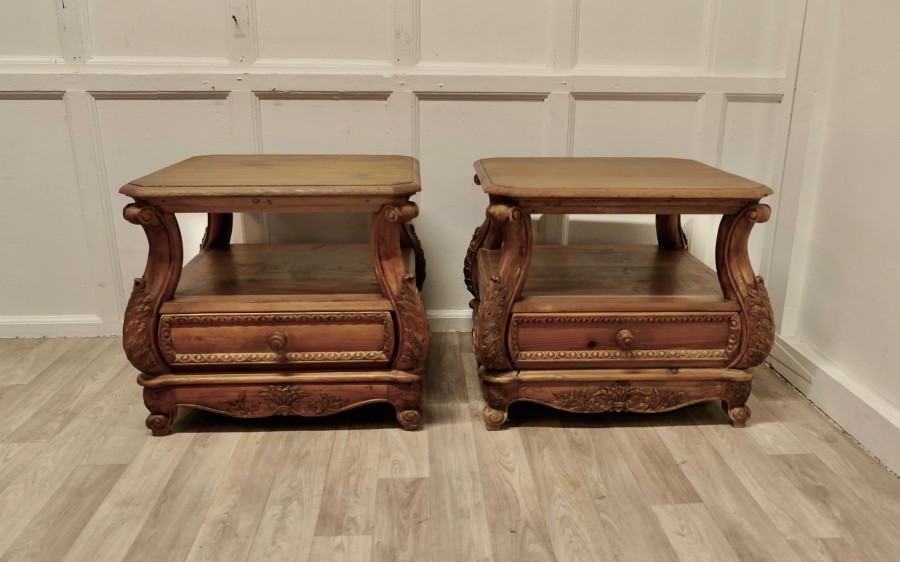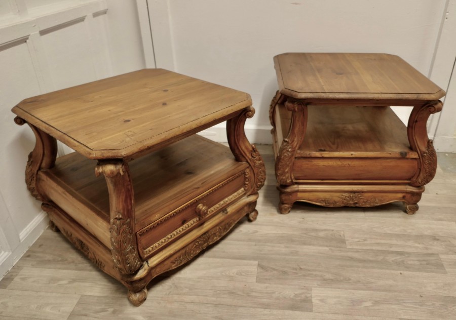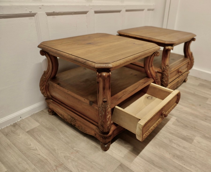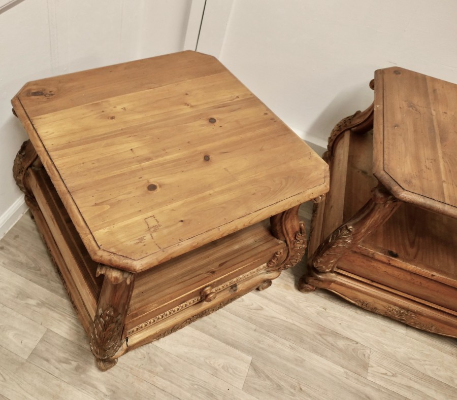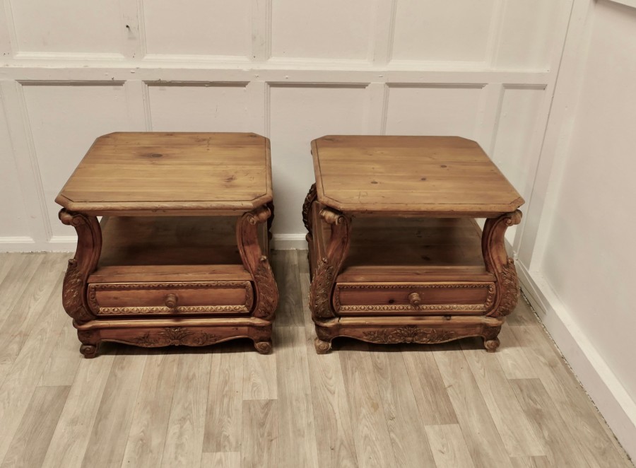 A Pair of Heavy Pine Low Side Tables or Bedside Cabinets These are a good quality pair of tables, the tops are square and they have a slightly bowed front which has a long drawer and they are set on chunky carved legs The tables have an attractive acanthus carving decoration, they are in good condition, with minor blemishes only, these would work well in any room as side or coffee tables, or as they are a pair even as bedside cabinets The tables are 29” high and 25” square ZX208 Manufacture Date : 1960 Materials : Pine