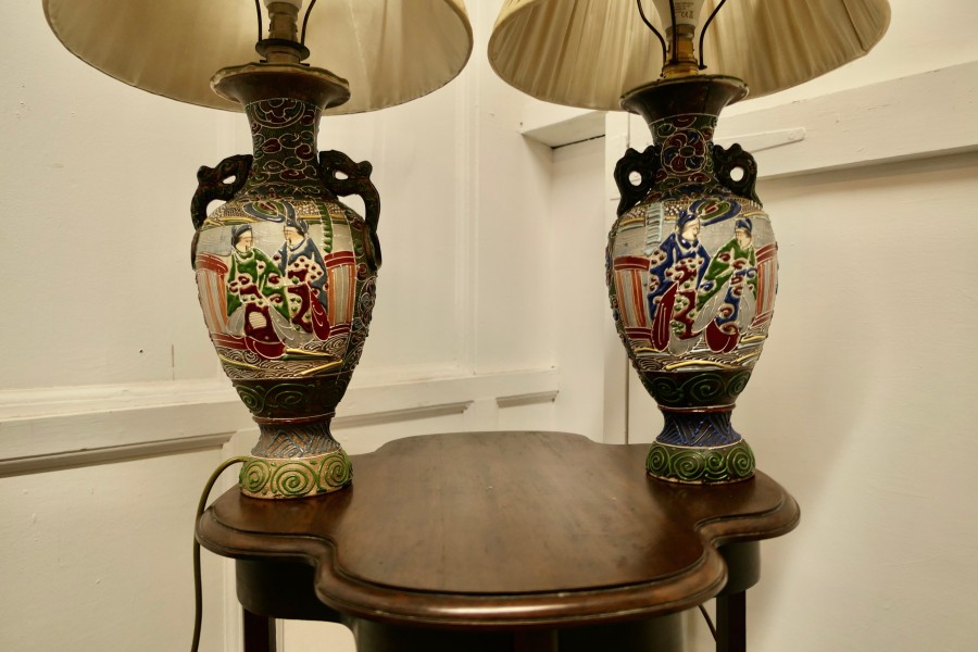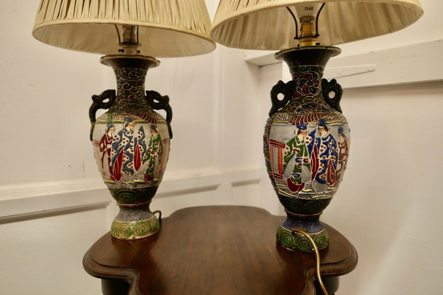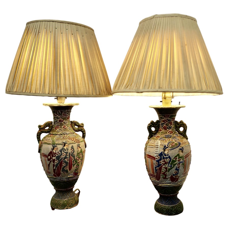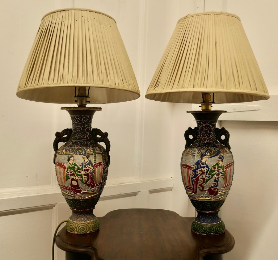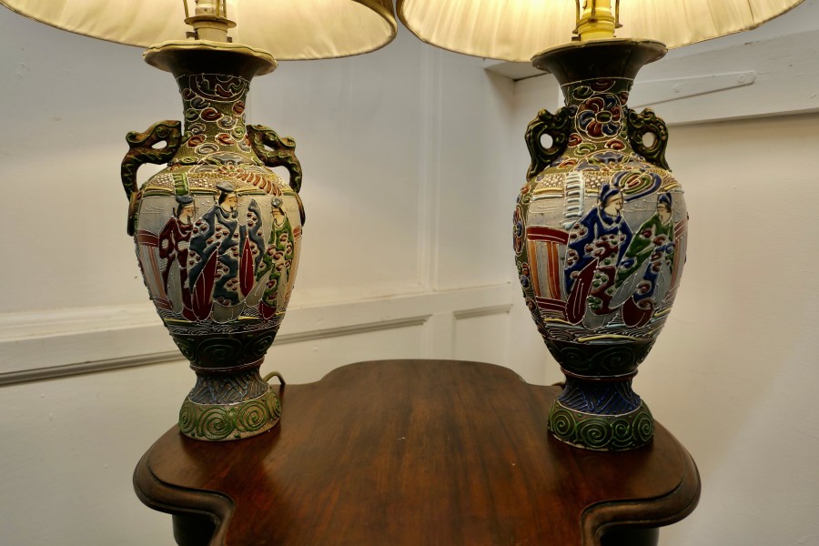 A Pair of Large Japanese Satsuma Lamps A pair of large Japanese Moriage Satsuma Handpainted Lamps dating from the Early 20th The lamps are not exactly identical they have scenes which mirror each other The Lamps are all working, there is a repair to the base of one of the lamps, this can be seen from beneath, they come with their pleated linen shades if wanted The Lamps are 26” high and 15”in diameter TJK132 Manufacture Date : 1920 Materials : Ceramic