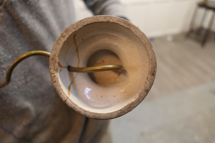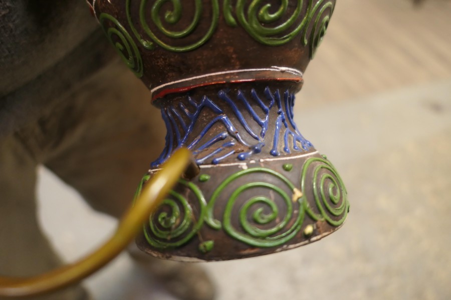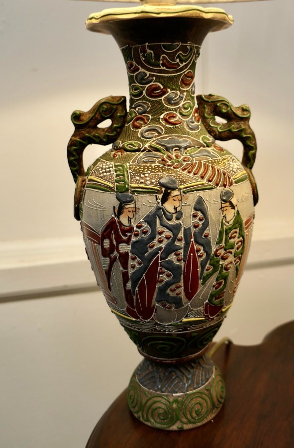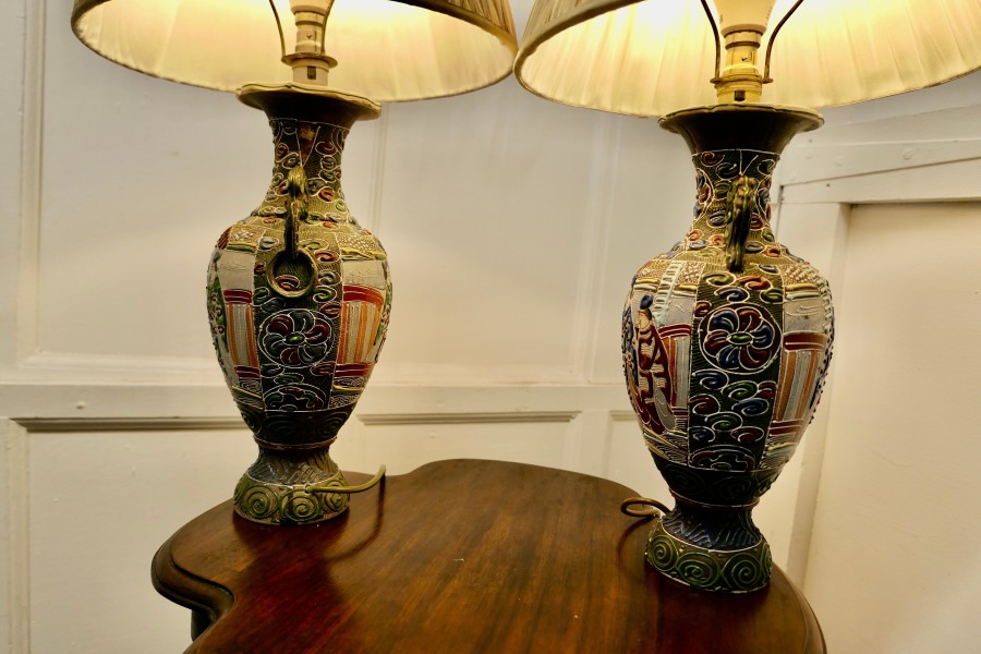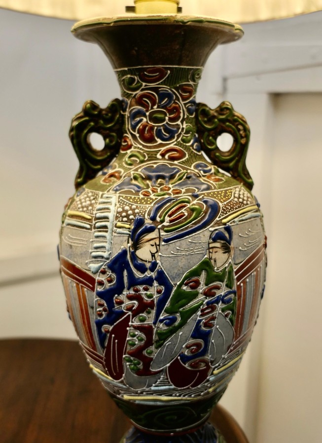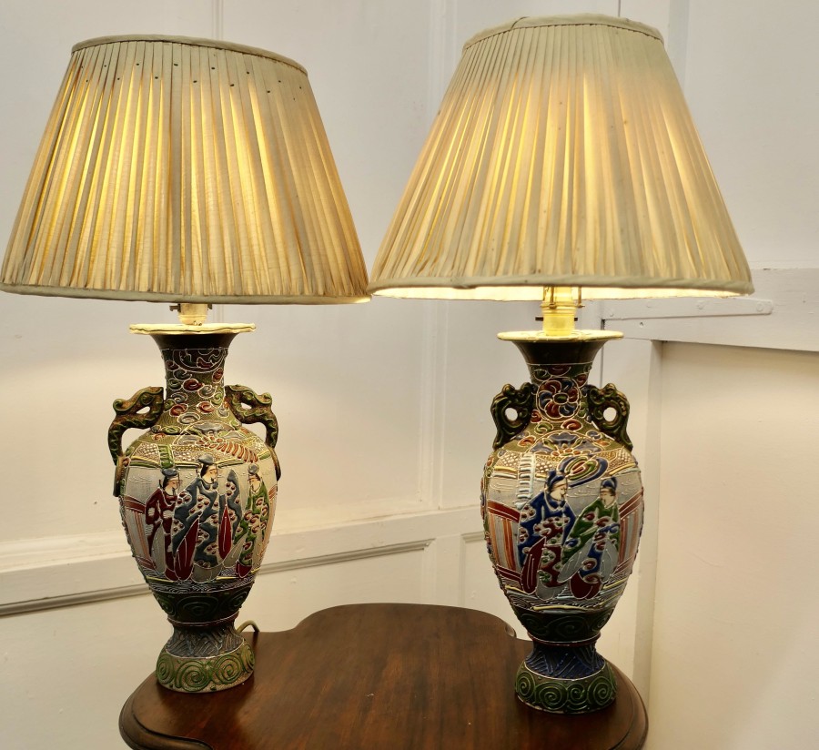 A Pair of Large Japanese Satsuma Lamps A pair of large Japanese Moriage Satsuma Handpainted Lamps dating from the Early 20th The lamps are not exactly identical they have scenes which mirror each other The Lamps are all working, there is a repair to the base of one of the lamps, this can be seen from beneath, they come with their pleated linen shades if wanted The Lamps are 26” high and 15”in diameter TJK132 Manufacture Date : 1920 Materials : Ceramic