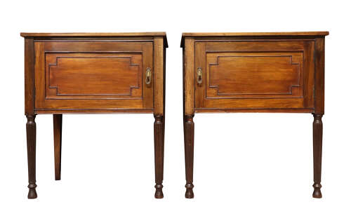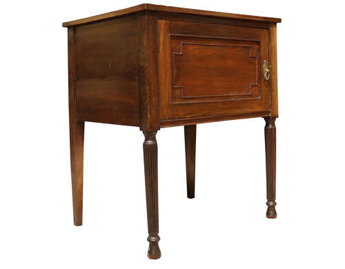 A large pair of mahogany bedside cupboards of elegant, understated design, each raised on finely turned and fluted legs terminating in neat bun feet. The proportions are particularly pleasing, with the slender reeded supports lending a lightness that contrasts beautifully with the solid cabinet form above.