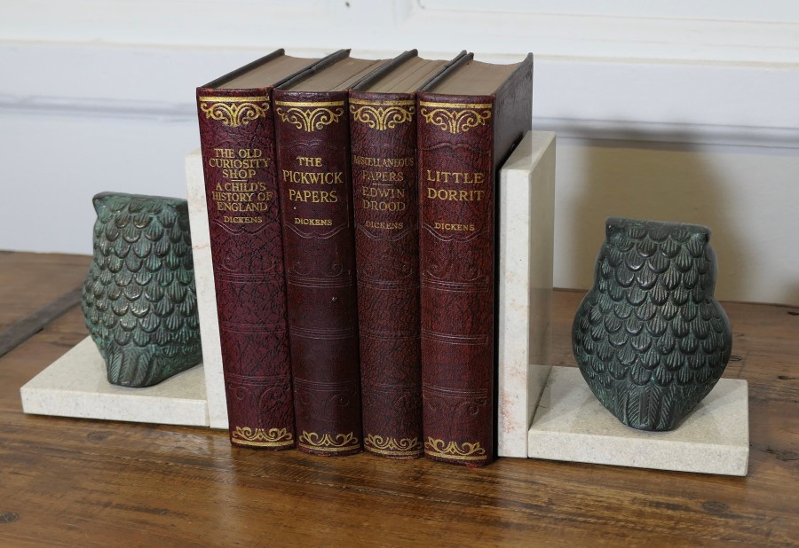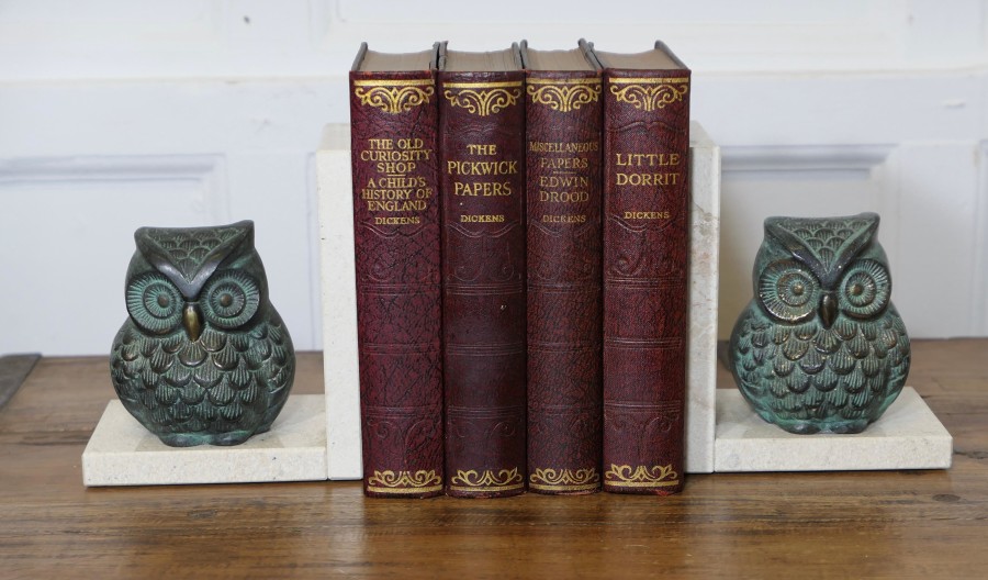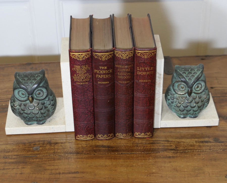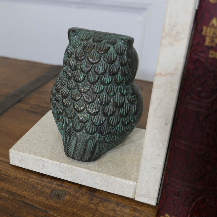 A Pair of Mid Century Marble and Bronze Bookends A very attractive set, the ends are heavy and made in marble, set on each one we have a bronze owl they are well balanced to hold books securely The bookends are 5” wide, 6 ” high and 4” deep ZX83 Manufacture Date : 1950 Materials : Marble