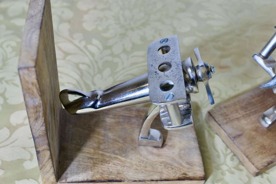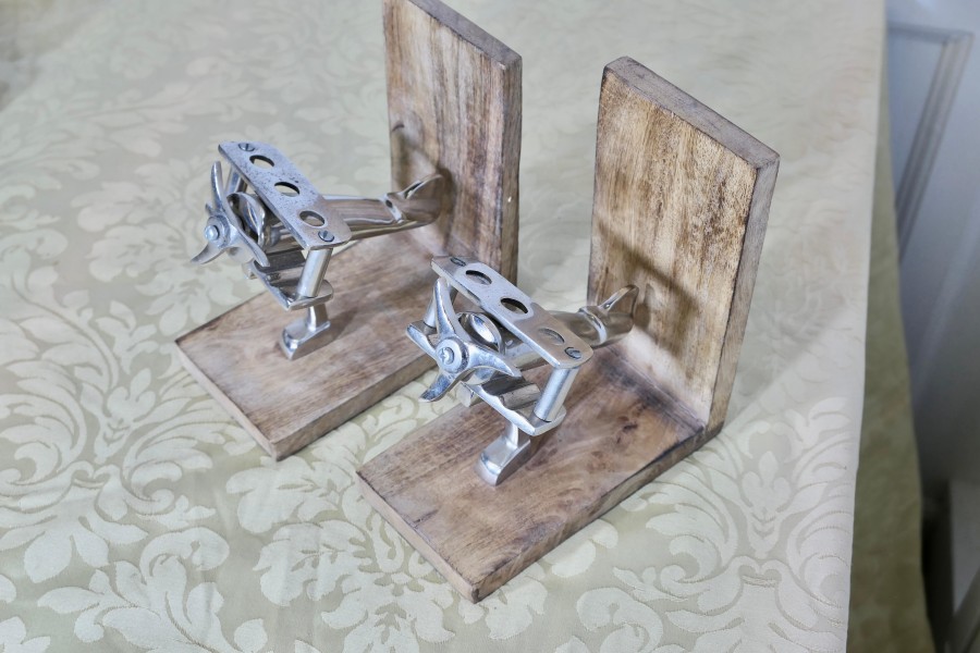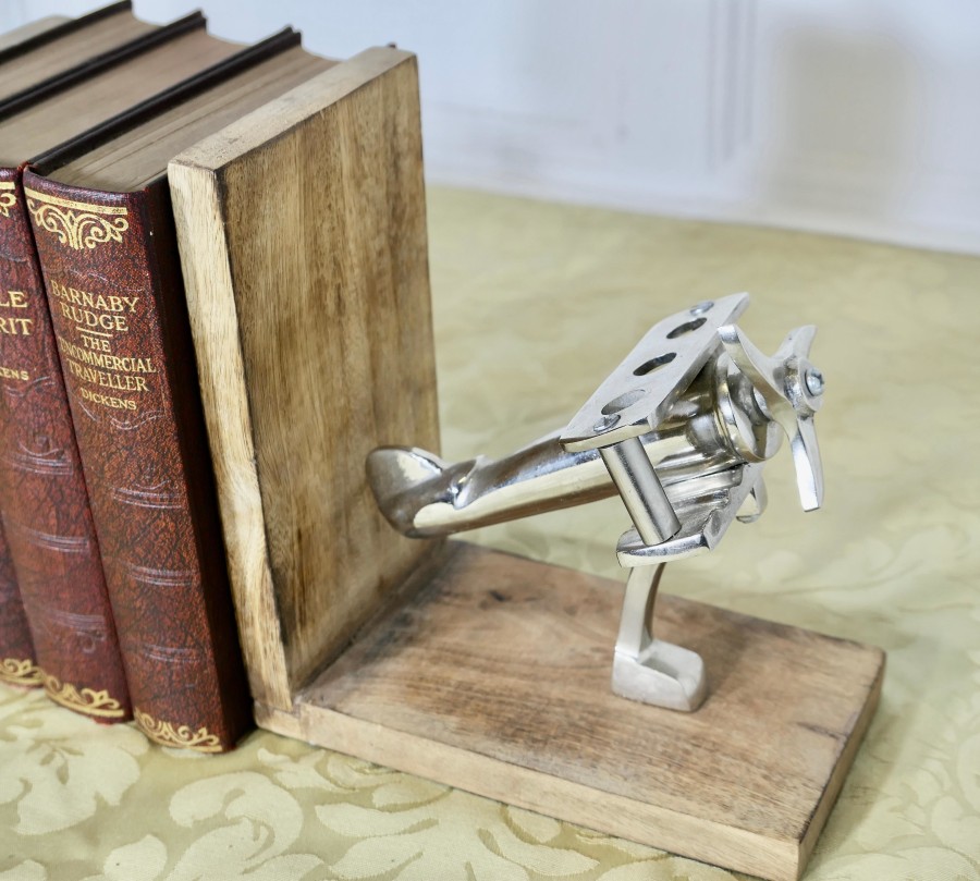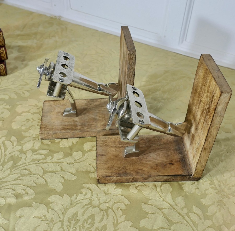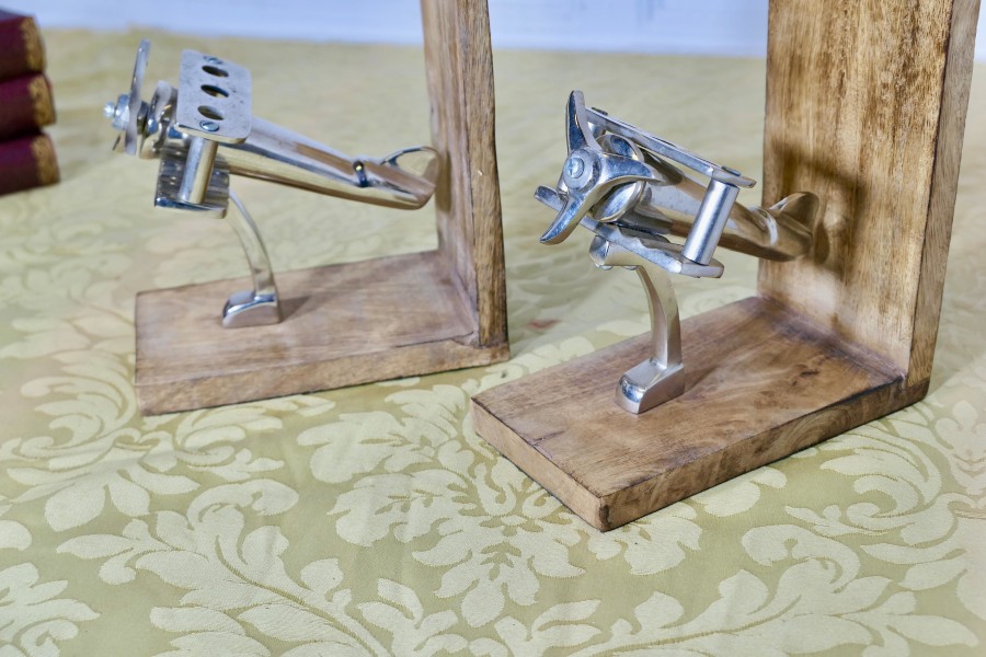 A Pair of Mid Century Quirky Bookends on an Aeronautical Theme Quirky and Fun an attractive set, the ends are finished in chrome and have a model biplane with an articulated propellor on each end they are well balanced to hold books securely The Bookend are in good used condition The bookends are 4” wide, 7.5 ” high and 7” deep ZX309 Manufacture Date : 1960 Materials : Chrome