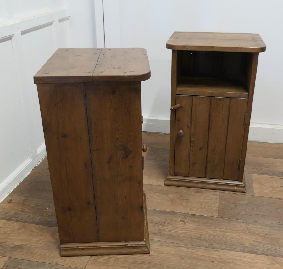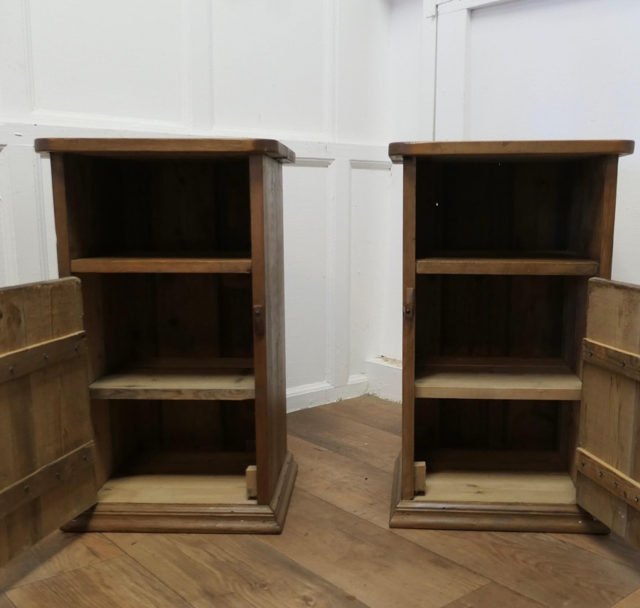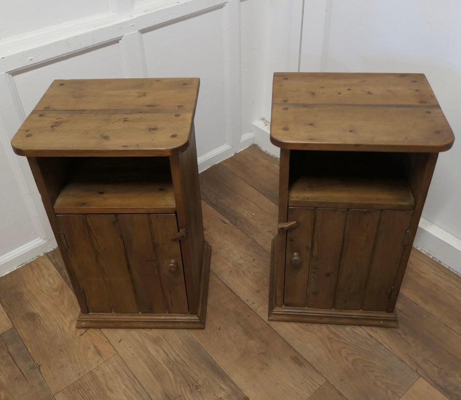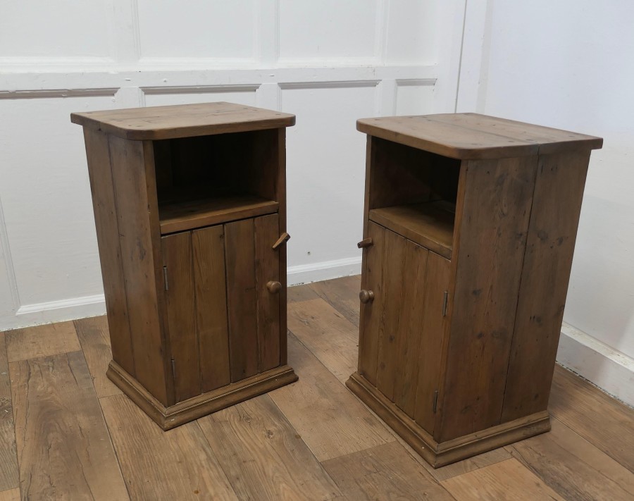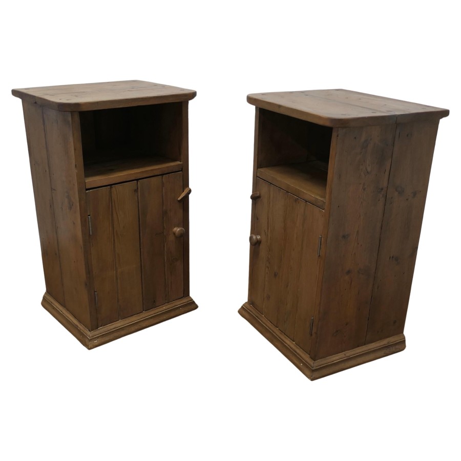 A Pair of Rustic Pine Bedside Cupboards, Night Tables These attractive rustic pieces are made in pine, they have planked doors with a storage space over and they are shelved inside, The Night Tables are good and sturdy they are 27” tall, 16” wide and 13” deep TSW320 Manufacture Date : 1900 Materials : Pine