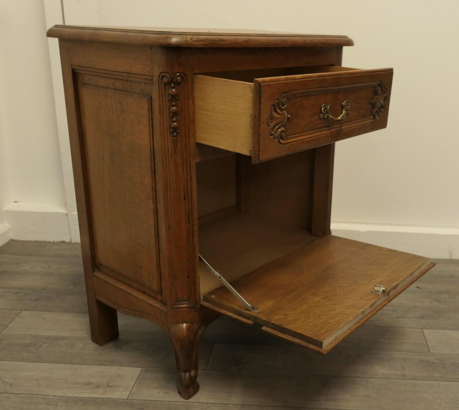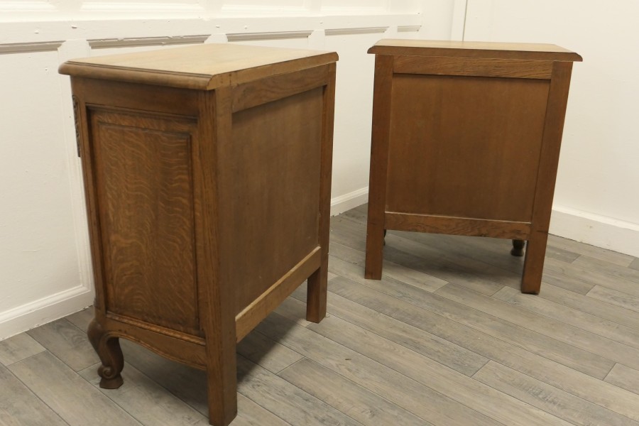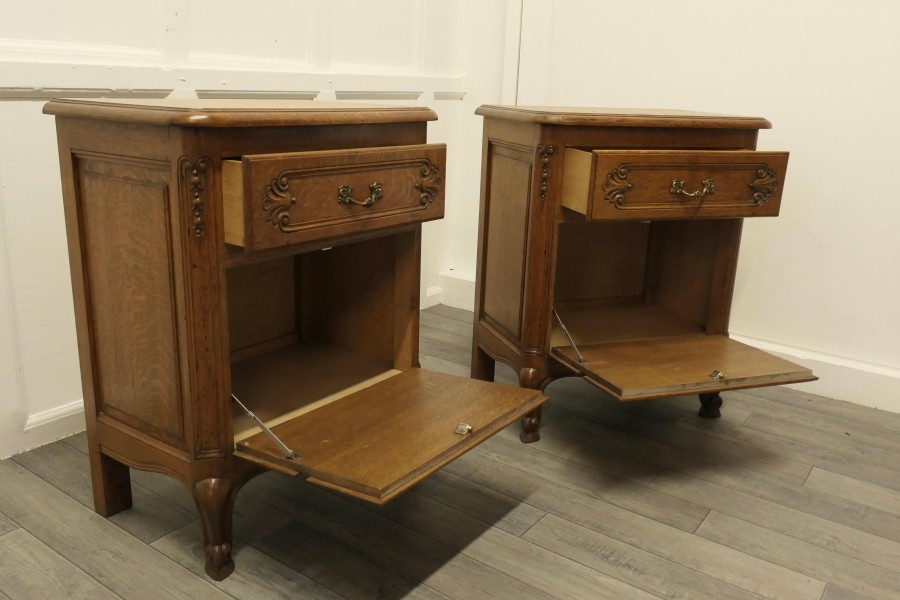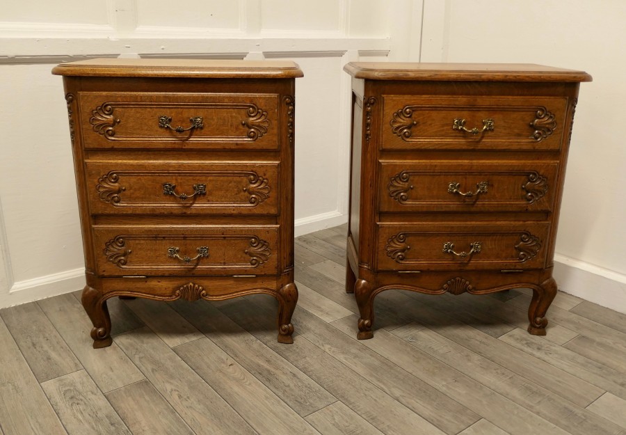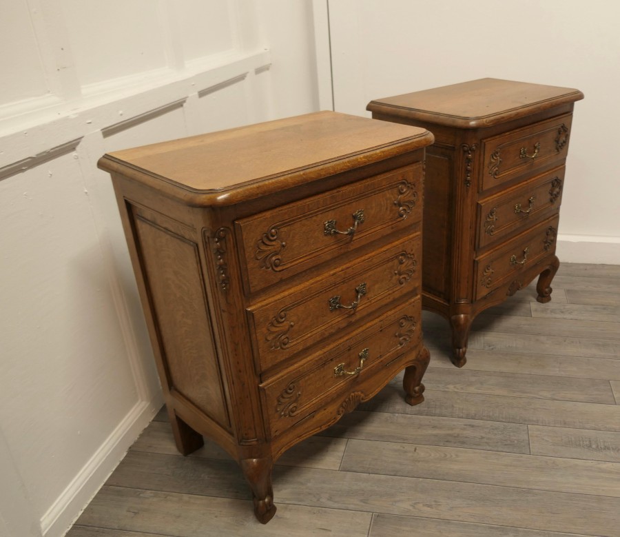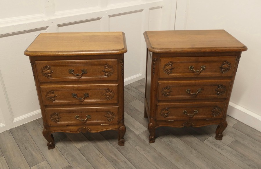 A Pair of Small French Golden Oak Chests of Drawers These are wonderful little chests, they appear to have 3 drawers to the front, the bottom 2 drawer fronts have a combined fall front they all have brass ormolu handles and are carved in the French style The drawers and doors open smoothly, they each stand on small cabriole legs and they have an attractive moulded edge to the top. The chests are of good solid construction and have no creaks, splits or woodworm The chests measures 27” high 22” wide and 14” deep TCC248 Manufacture Date : 1960 Materials : Oak