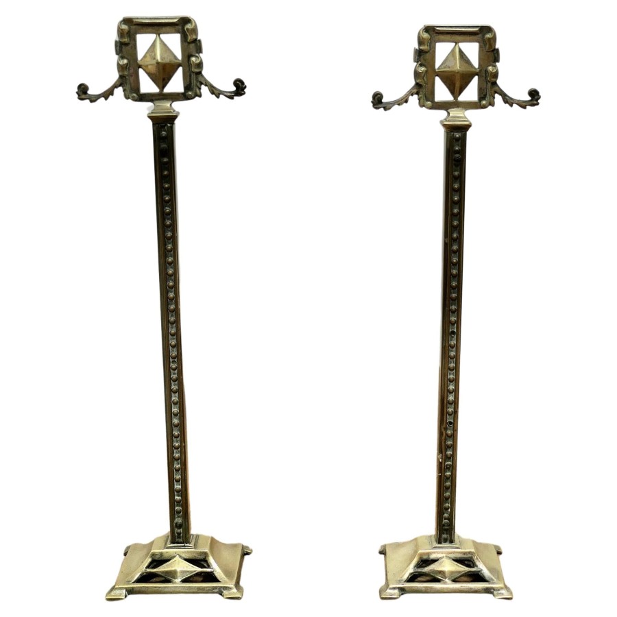 A Pair of Tall Victorian Brass Andirons or Tool Rests This very attractive pair of brass Andirons are 21” high, 4.5” long and 6” wide across the front, they are in excellent but used condition, just what your fire tools need to keep them safe and handy TSC73 Manufacture Date : 1890 Materials : Brass