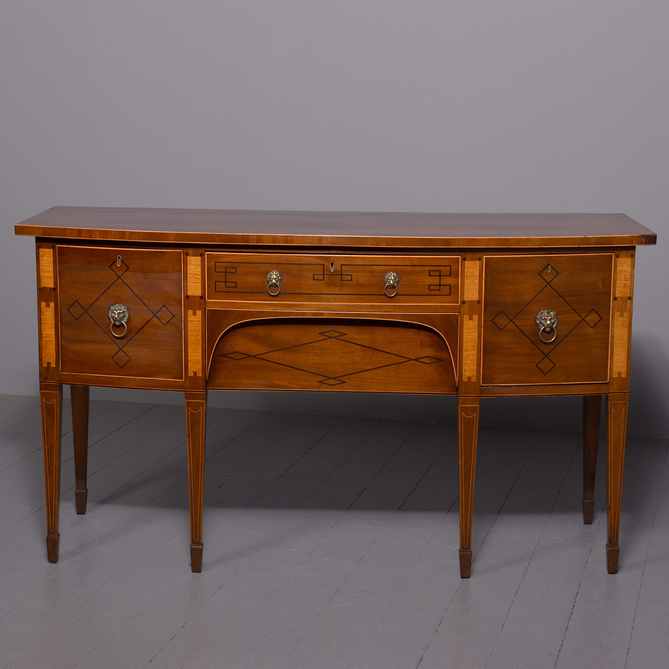 Circa 1790. A large stylish bow fronted mahogany and inlaid George III sideboard, the top with fine figured mahogany with triple string inlay, broad banding and a boxwood banded fore edge, the front with a configuration of one curved drawer with stylish geometric inlay with a pair of brass lion mask handles with ring pulls through the mouth, beneath this there is a drawer in the frieze with inlaid quarter sections and geometric inlay, flanked by a full length drawer on the right fitted for wine bottles, with large cast brass lion mask handles, the other side has a faux drawer which opens to reveal a cupboard with uninterrupted space with similar handle and inlay, all resting on six stout legs with the ones at the front with satinwood and various inlaid panels and inlay, the tops of the legs with inverted arches and finishing on extended toes, all with great colour and patination, in excellent condition.