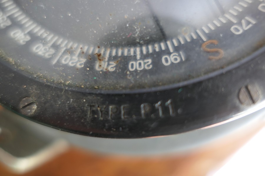 A Royal Air Force P11 Aircraft Compass No. 11242 D The compass has a brass body finished in black, it comes in its battleship grey painted wooden box The P11 Compass was used in the Spitfire and was standard issue compass for the Royal Air Force during the Second World War CW34 Manufacture Date : 1930 Materials : Brass