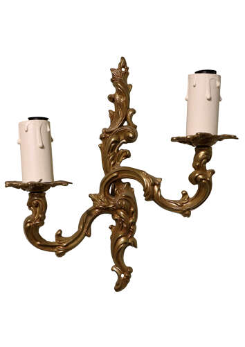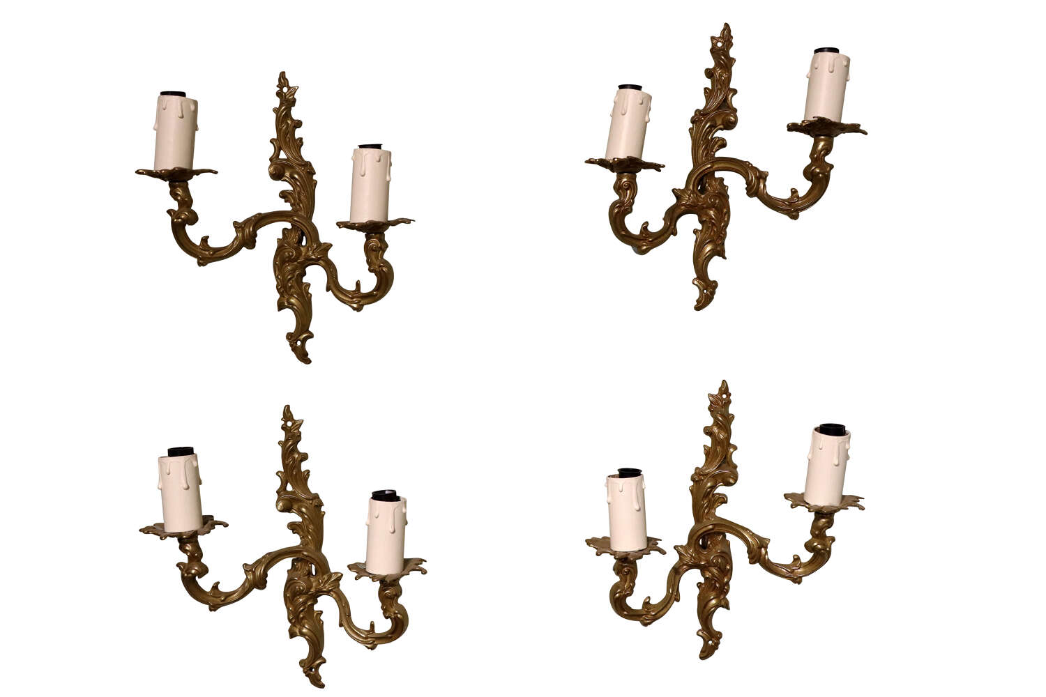 A quality set of four twin-branch gilt brass wall sconces in the Louis XVI style. Each backplate finely cast with scrolling acanthus leaves and rocaille ornament, the curving candle arms supporting shaped drip pans with faux candle fittings. Beautifully detailed with a rich, warm patina, these sconces exude classical French elegance and would suit both traditional and decorative interiors.