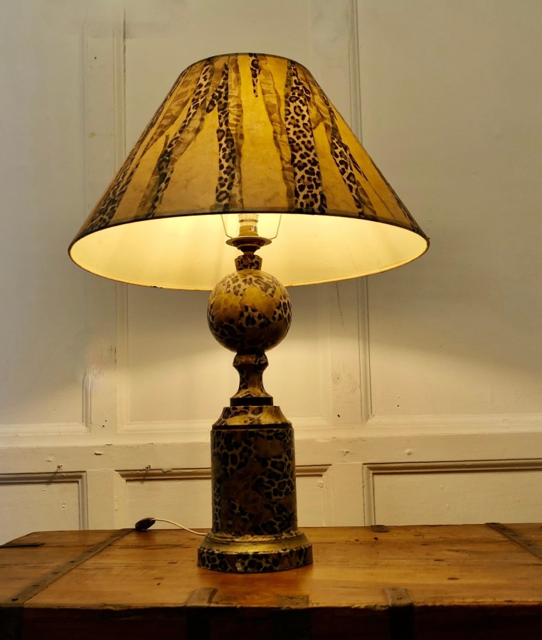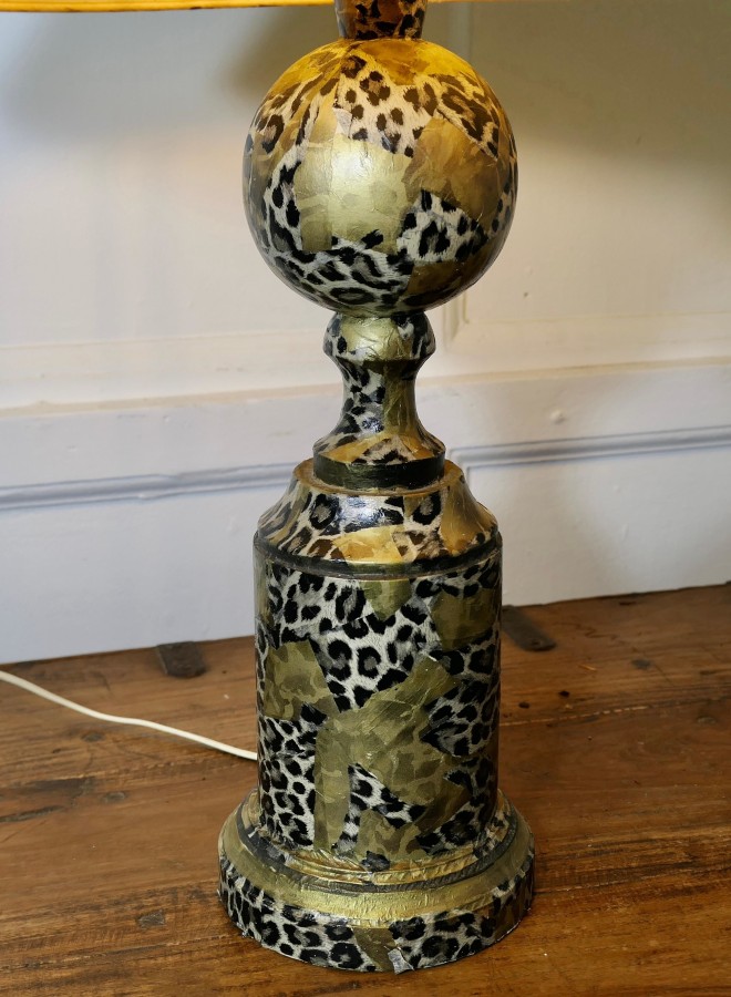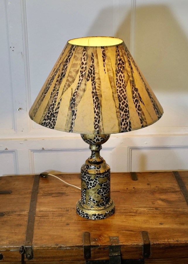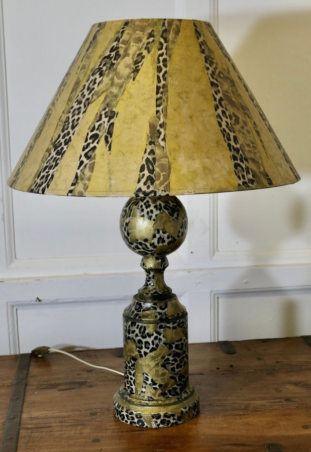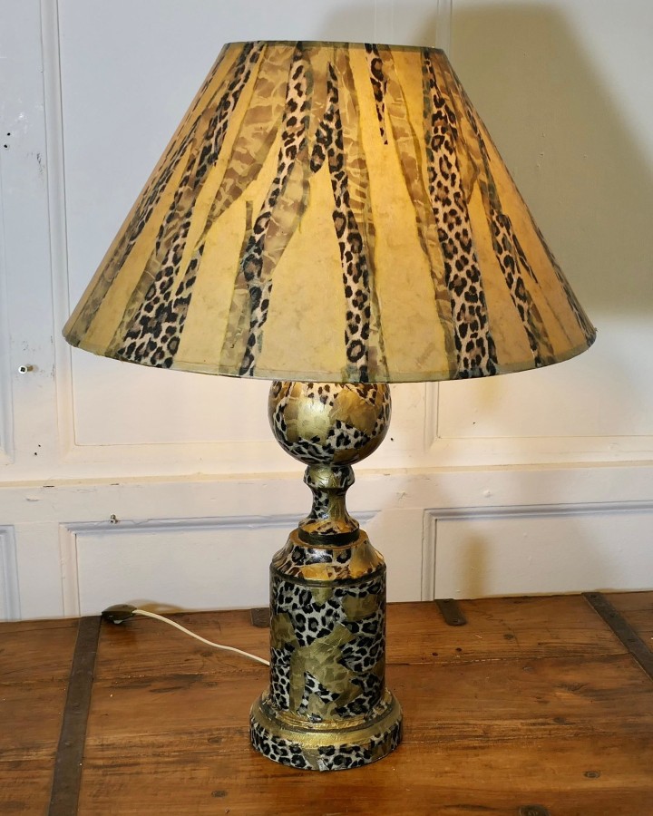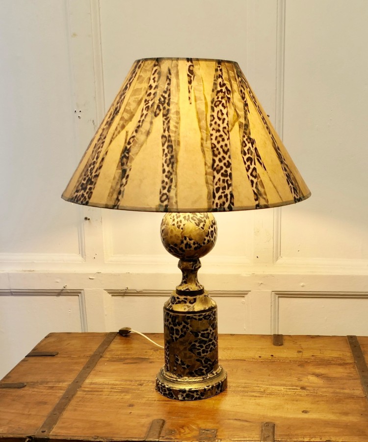 A Stunning French Leopard Print Table Lamp This is a one off Artisan Made piece, the lamp is overlaid with fine tissue which is patterned with gold leaf and leopard fur markings, both the shade and the lamp base have been exquisitely designed A superb looking piece and a real stand alone, good working condition The lamp is 24” high and 18” in diameter TZX103 Manufacture Date : 1970 Materials : Paper