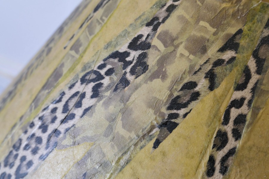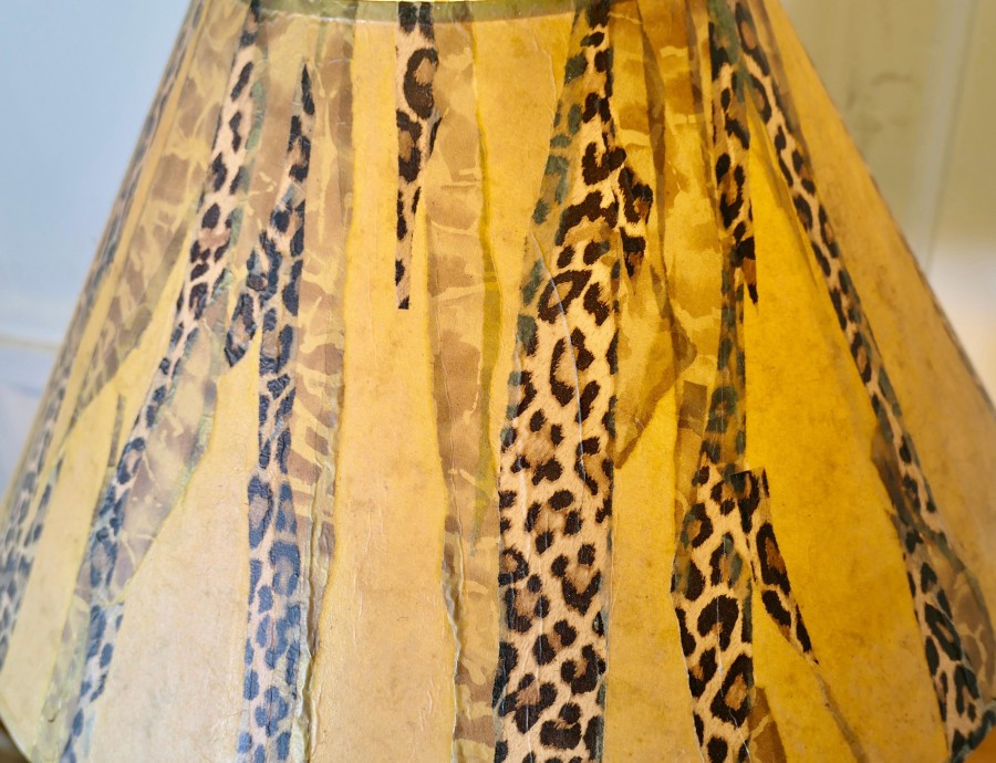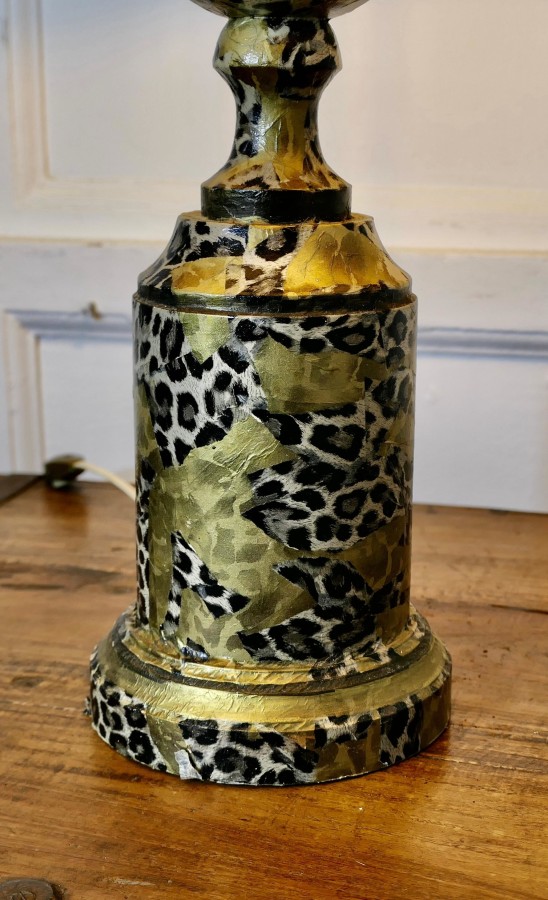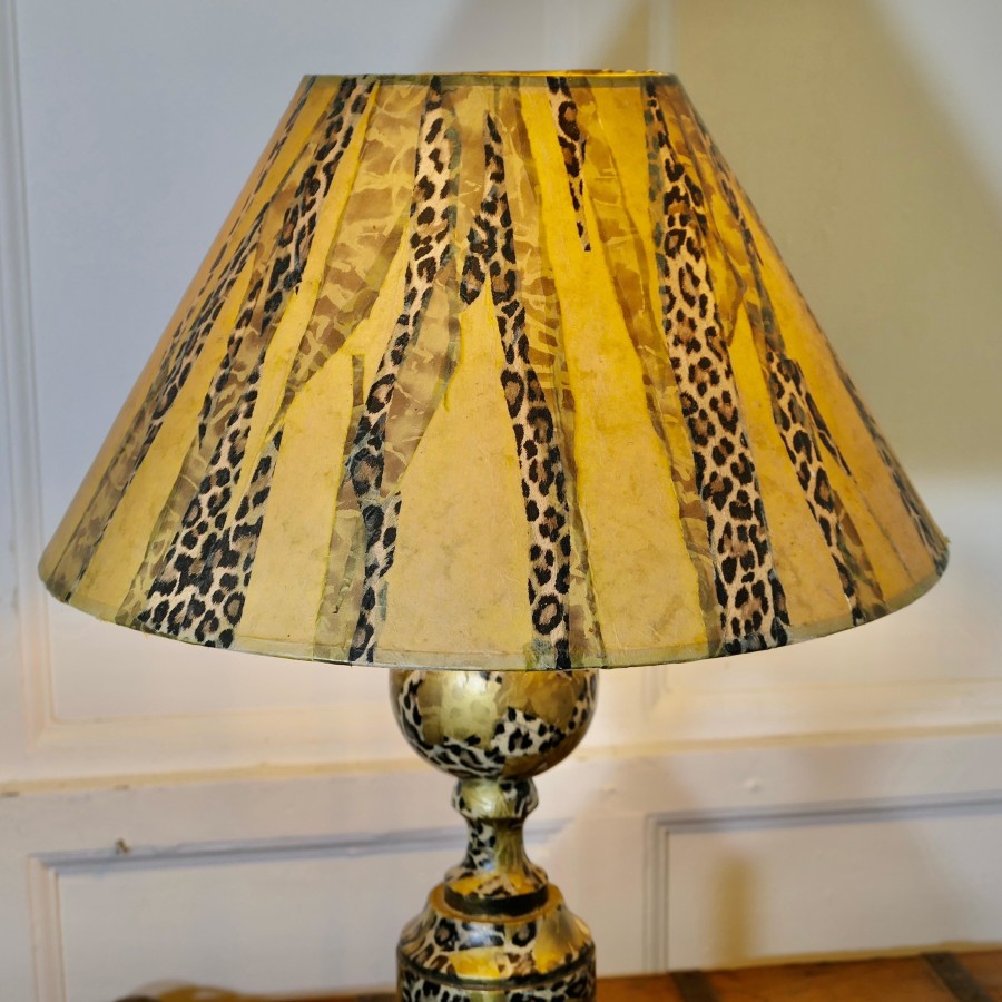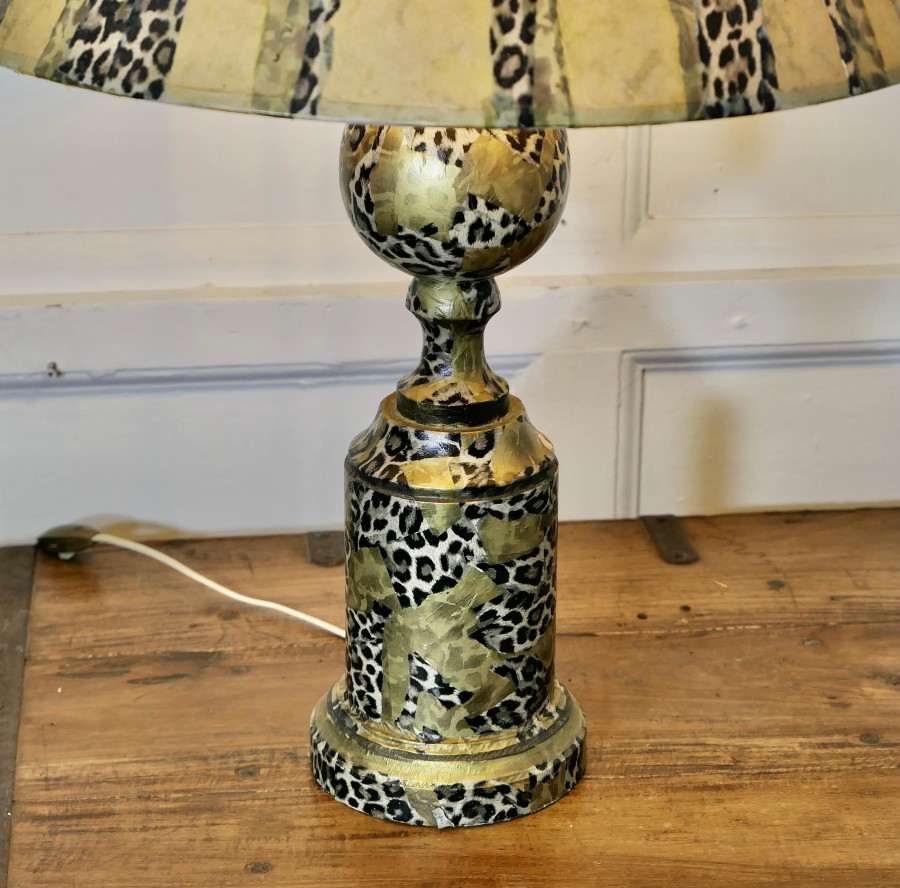A Stunning French Leopard Print Table Lamp This is a one off Artisan Made piece, the lamp is overlaid with fine tissue which is patterned with gold leaf and leopard fur markings, both the shade and the lamp base have been exquisitely designed A superb looking piece and a real stand alone, good working condition The lamp is 24” high and 18” in diameter TZX103 Manufacture Date : 1970 Materials : Paper