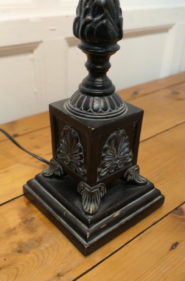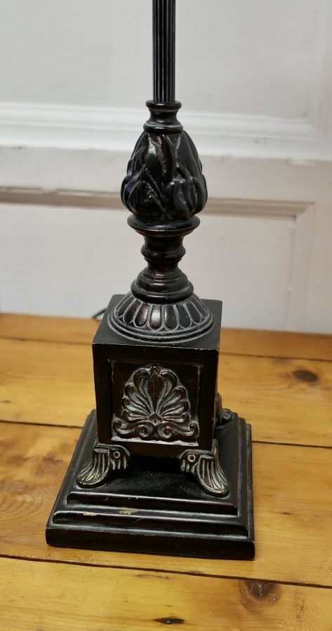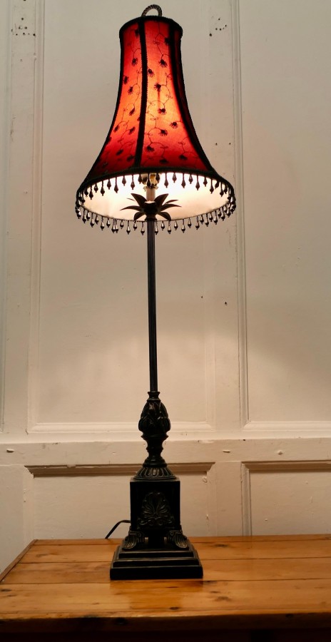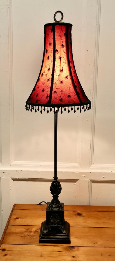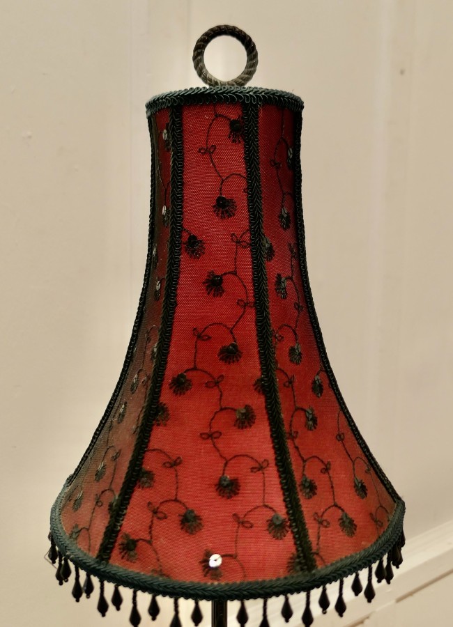 A Very Scary Gothic Looking Tall Witches Lamp A tall piece with a gothic look the lamp is 37” tall including the red sequinned shade decorated with Spiders The lamp is 37” tall and 10” across at the shade VY82 Manufacture Date : 1960 Materials : Linen