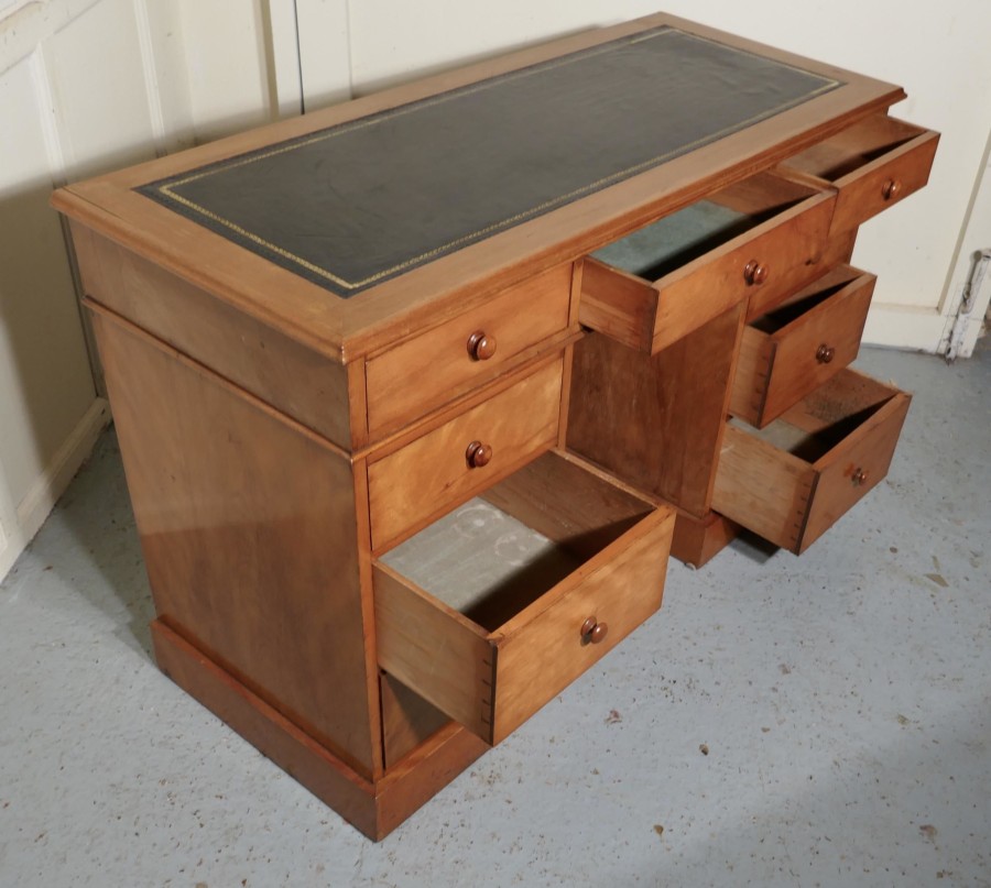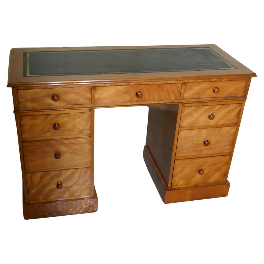 A Victorian Good Quality Pedestal Desk The desk is made in one of the loveliest woods, figured Birch which has a wonderful dark gold colour, each of the pedestals has three graduated drawers and the top section also has three drawers across the front the desk breaks down into three for transportation The desk has a black inset and tooled leather top, the drawers have wooden turned knobs The desk is in very tidy condition and any blemishes are minor The desk is 30” high, 45” long, 19” deep, the knee hole is 24” high and 15” wide SH173 Manufacture Date : 19th Century Materials : Birch