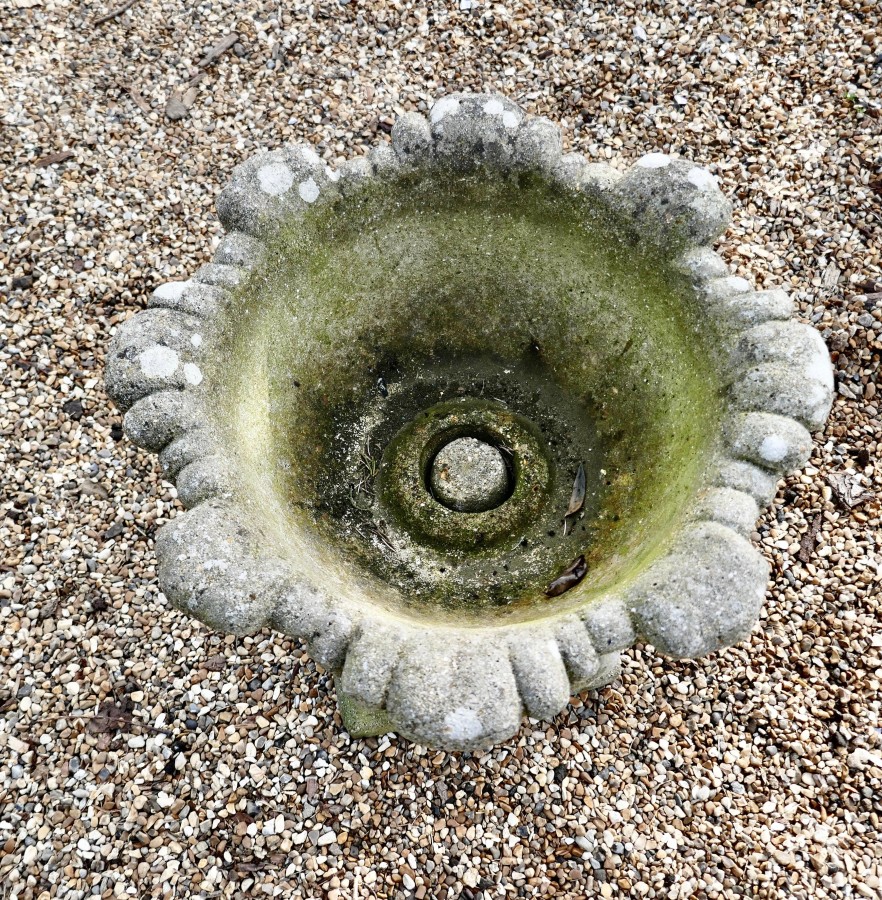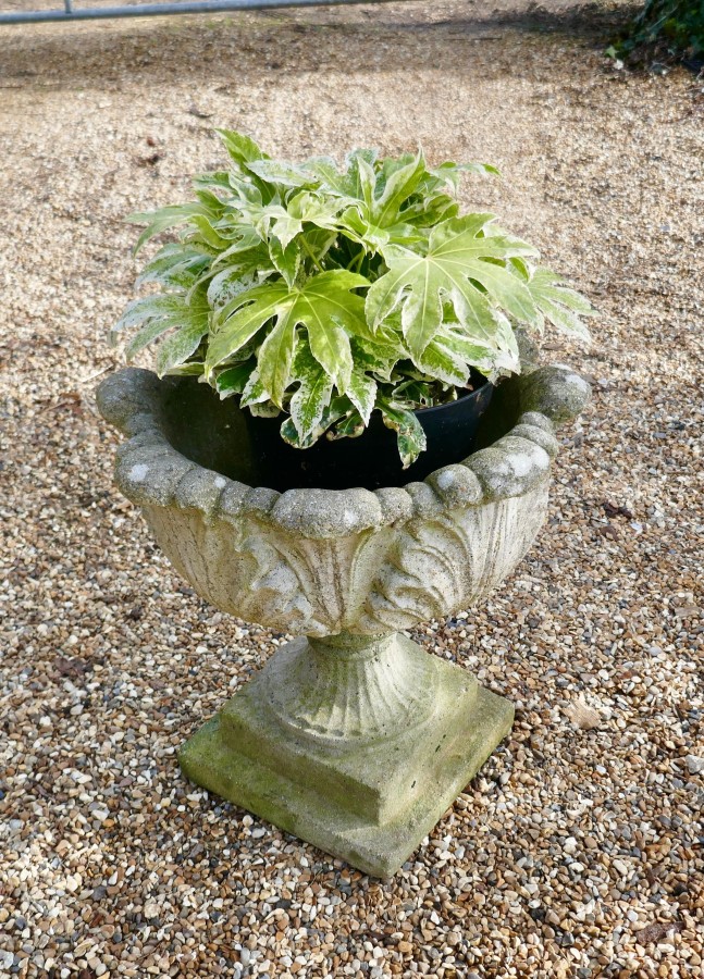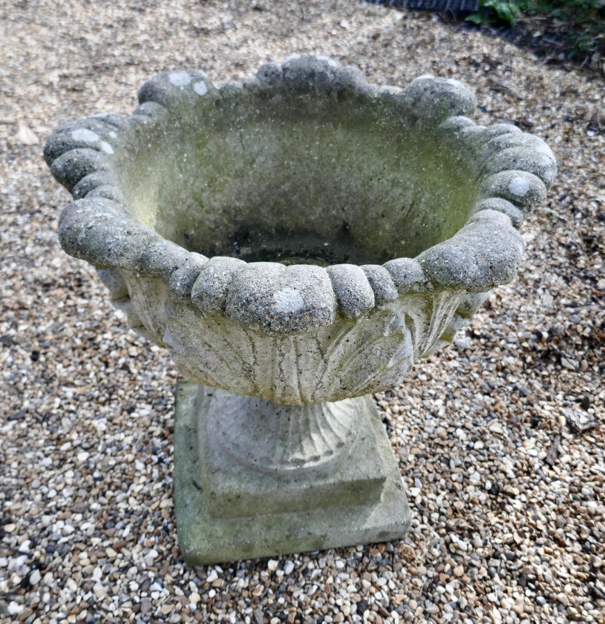 Acanthus leaf weathered garden planter A good early 20th century planter, it is well weathered and has drainage in the centre, the urn separates into 2 for transportation In good sound weathered condition, it is 20” high, 20” in diameter AC119. Manufacture Date : 1930 Materials : Cement