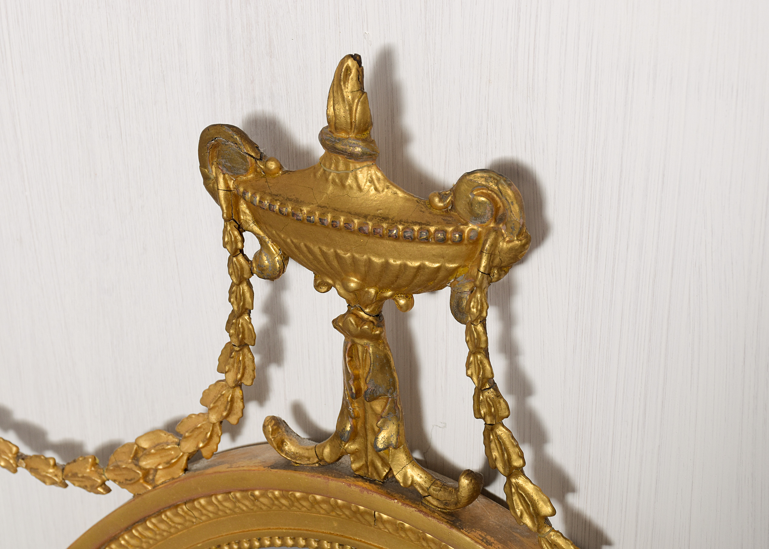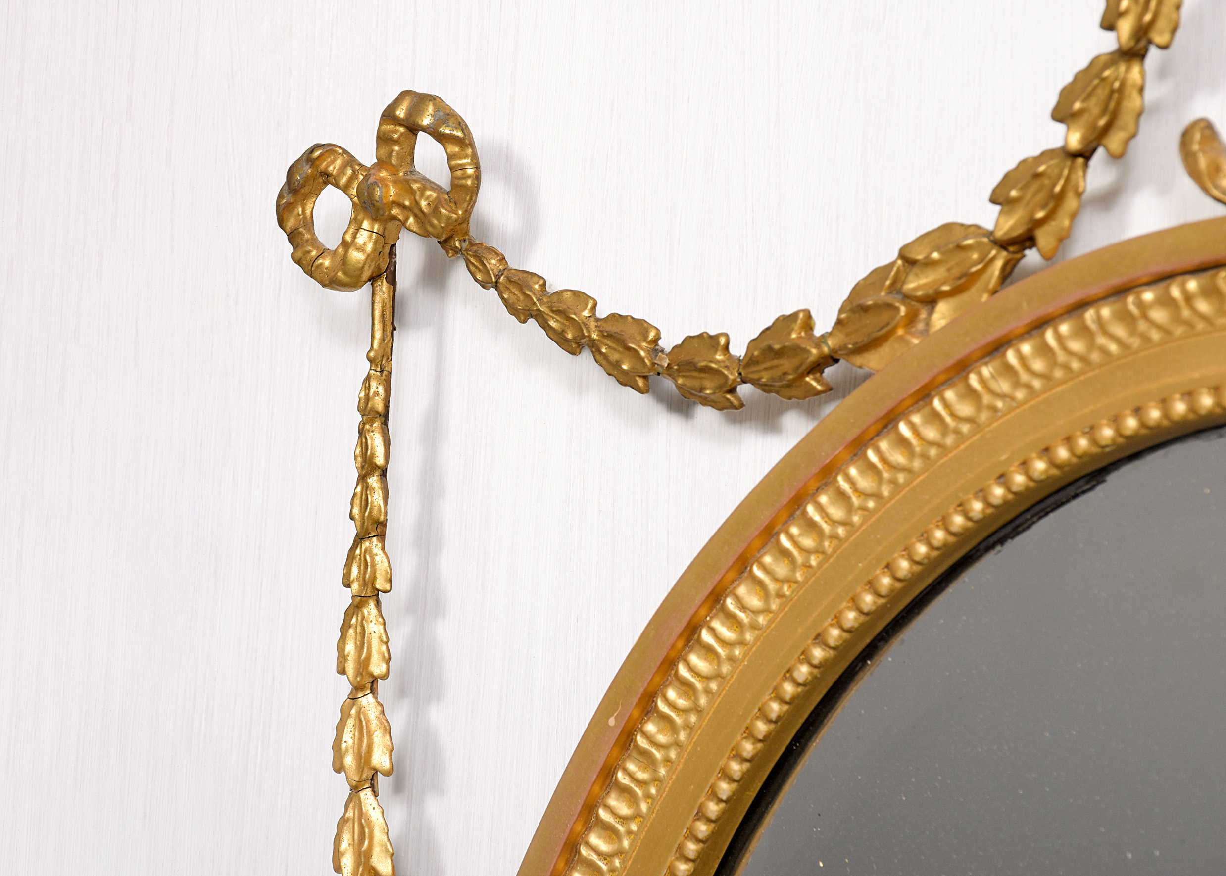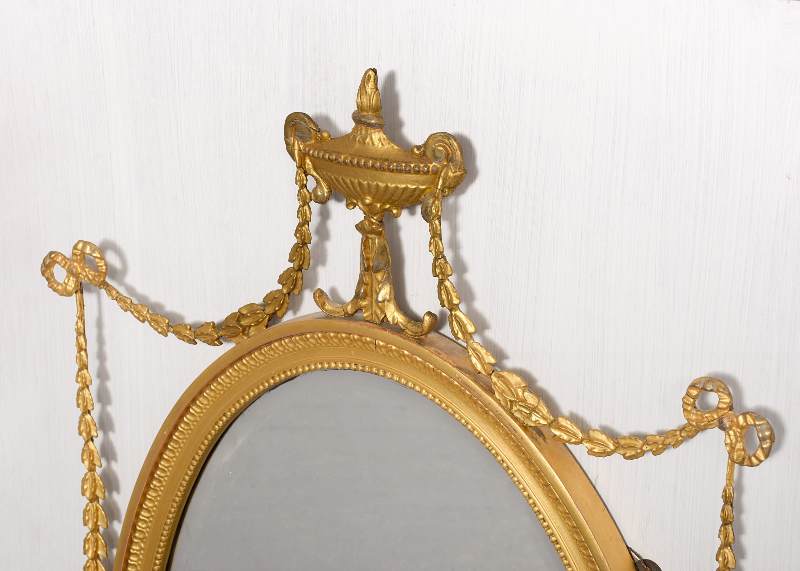Circa 1900. A stylish gilded oval Adam style mirror, the oval frame surmounted by a flaming urn supported on a foliate upright with swags of harebells extending to form a ribbon and trailing down the sides, the original bevel edged mirror contained in a beaded gilded frame with a flat section and a carved and gilded area, the base of the frame with a swag of foliate carving with a cartouche in the center and downward facing flowers.