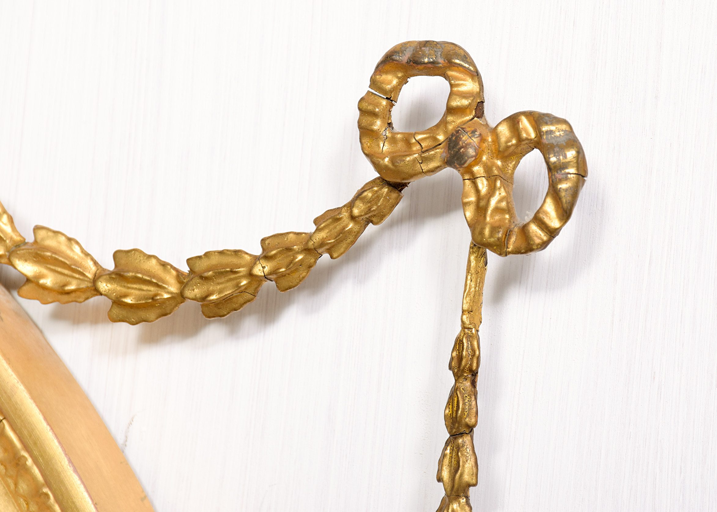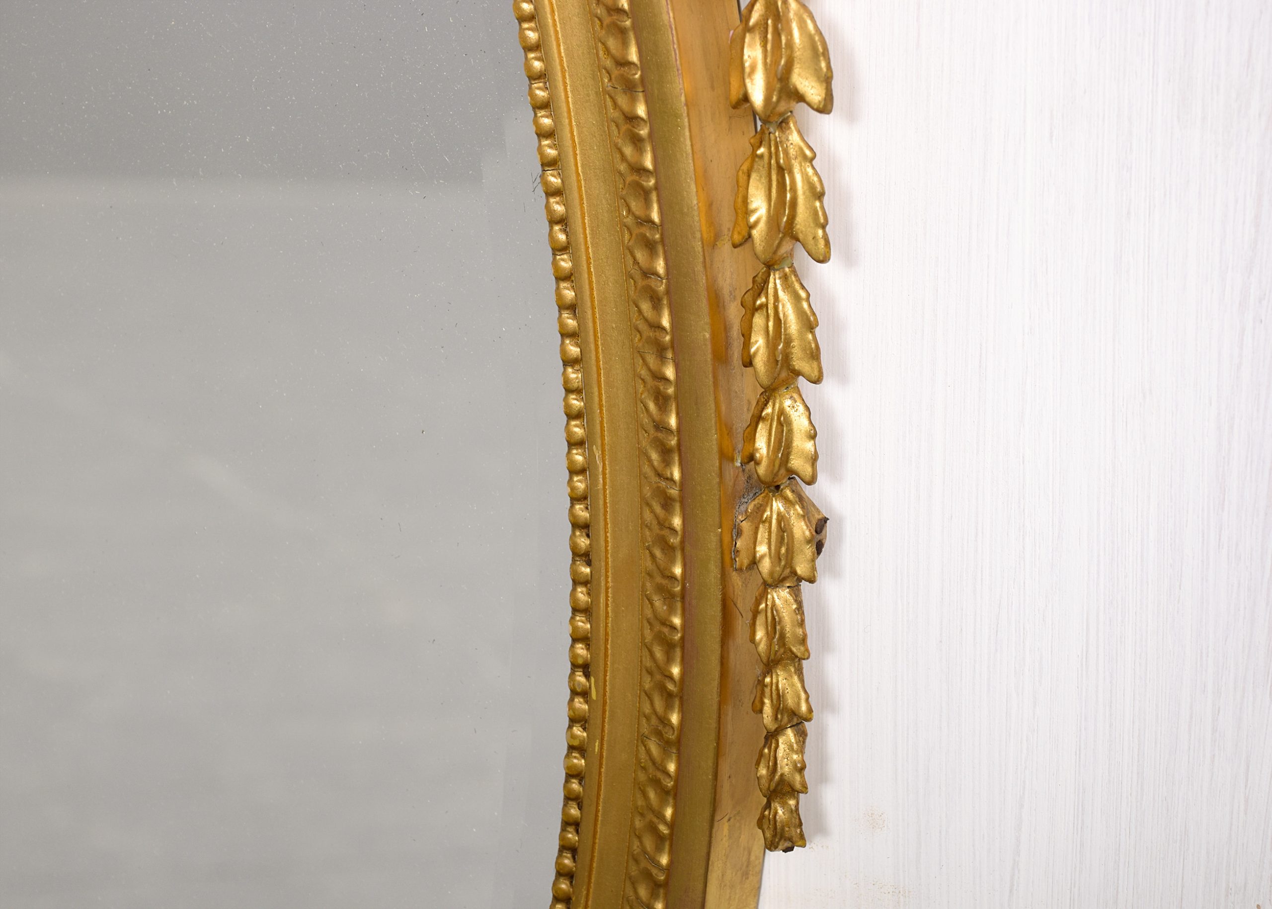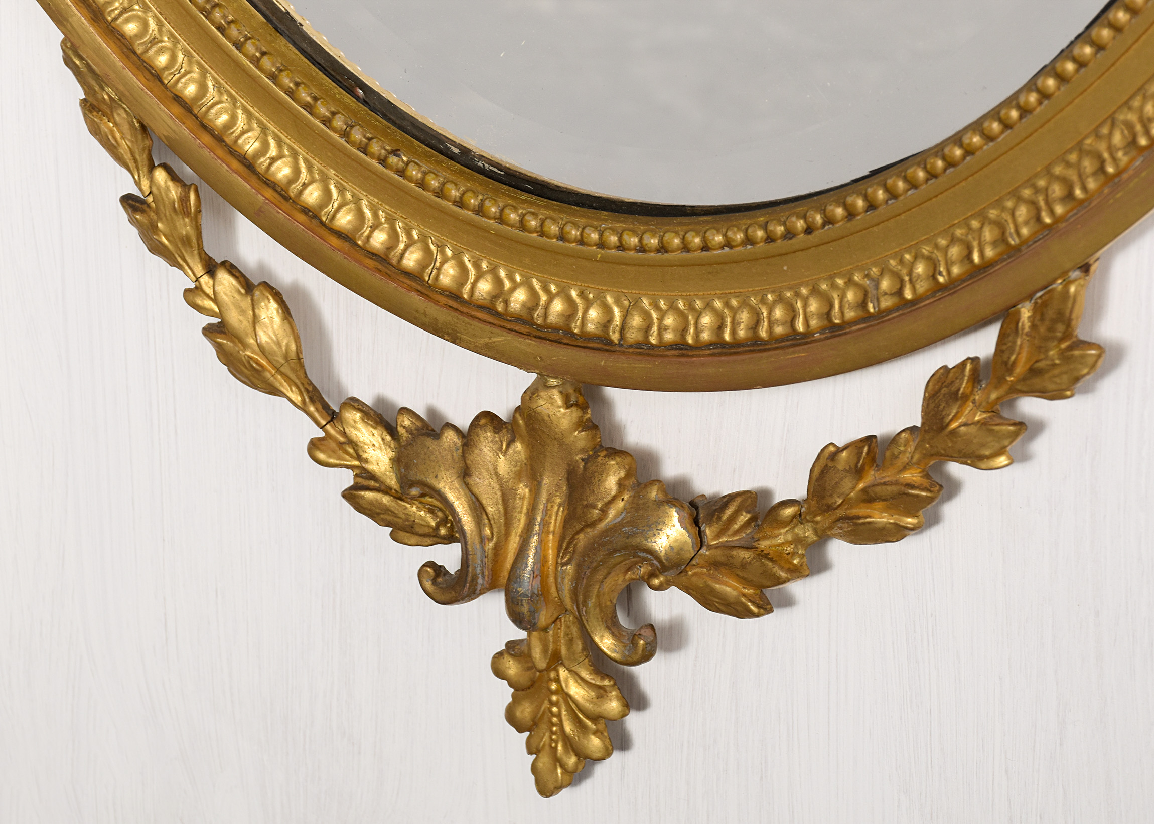 Circa 1900. A stylish gilded oval Adam style mirror, the oval frame surmounted by a flaming urn supported on a foliate upright with swags of harebells extending to form a ribbon and trailing down the sides, the original bevel edged mirror contained in a beaded gilded frame with a flat section and a carved and gilded area, the base of the frame with a swag of foliate carving with a cartouche in the center and downward facing flowers.