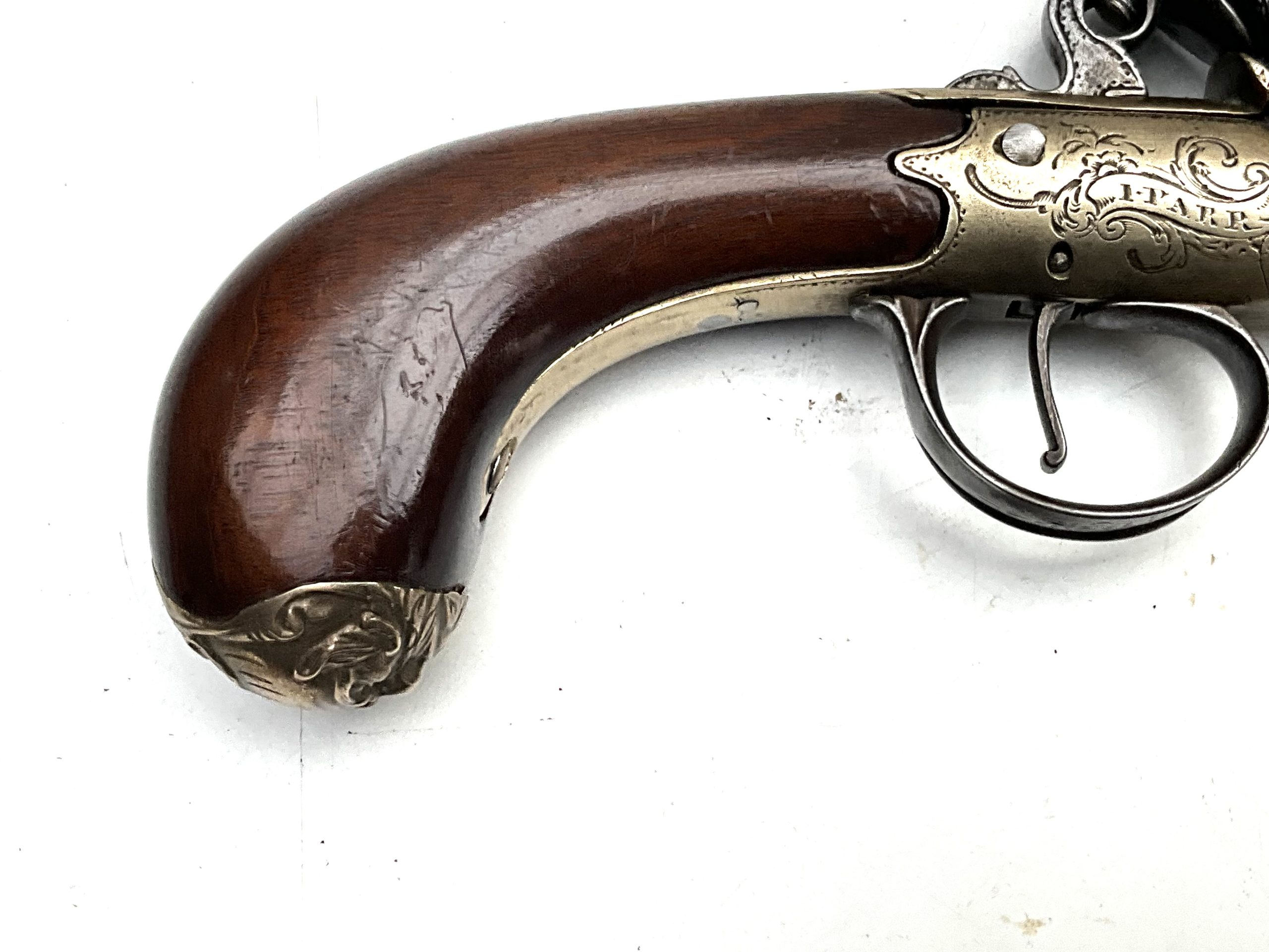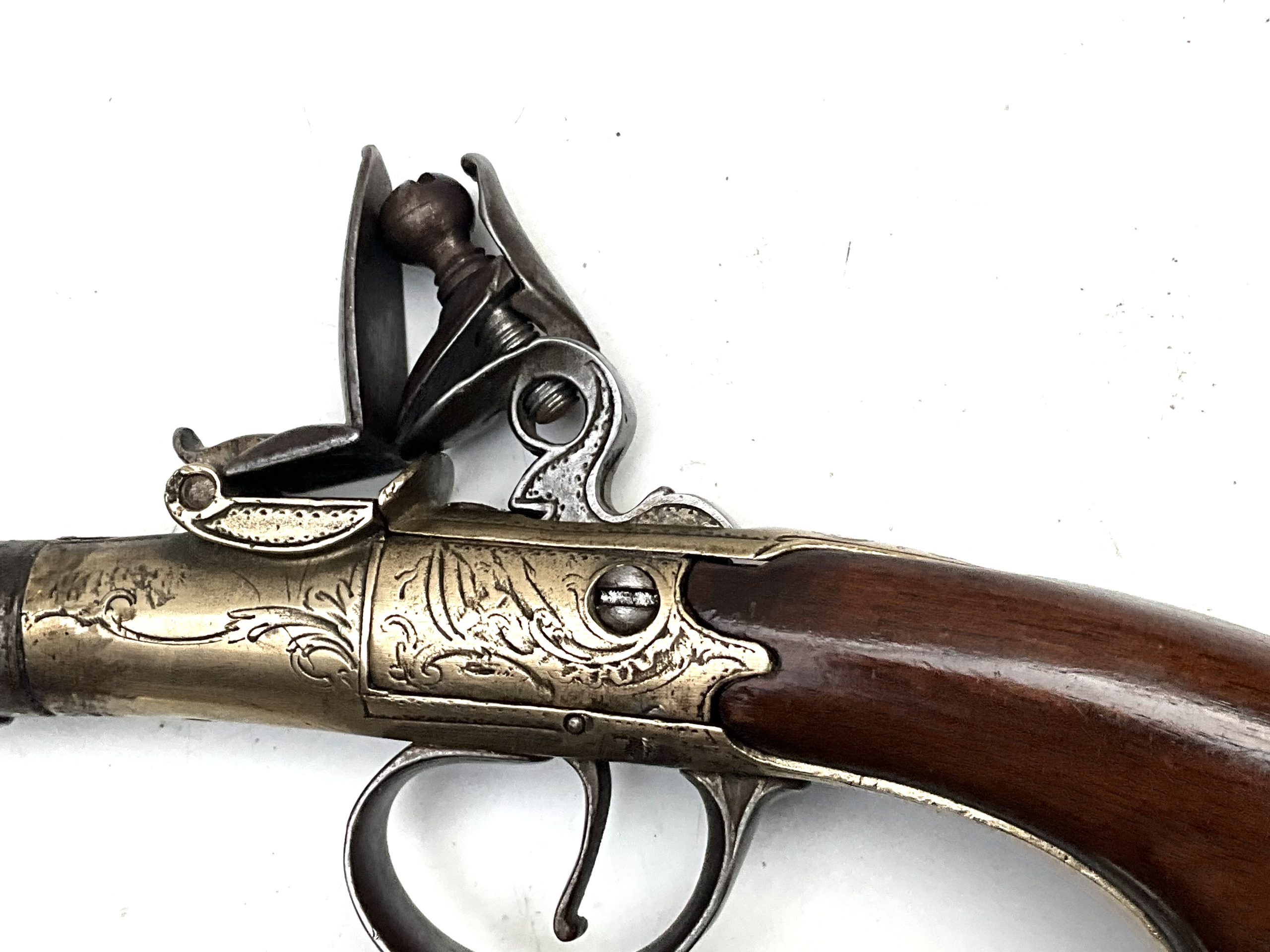 An 18th Century Flintlock Queen Anne-type Greatcoat Pistol by I Parr, London with 6.5cm turn-off cannon barrel, length total 23 cm height 12 cm depth 3 cm London proof marks, signed and foliate engraved rounded box lock, walnut bag butt with brass grotesque mask pommel in excellent condition and fully working order, offering free UK delivery reference DBSS Tel: +44 7505 165 843 We accept online payments for all our items listed: Bank transfer cash on collection personal cheques or if wishing over the phone using your debit or credit cards, also doing layby payments plan, or email giving your address details & contact number and we shall send you your items invoice to make payment with your card. Send your request to – john.strong2@gmail.com