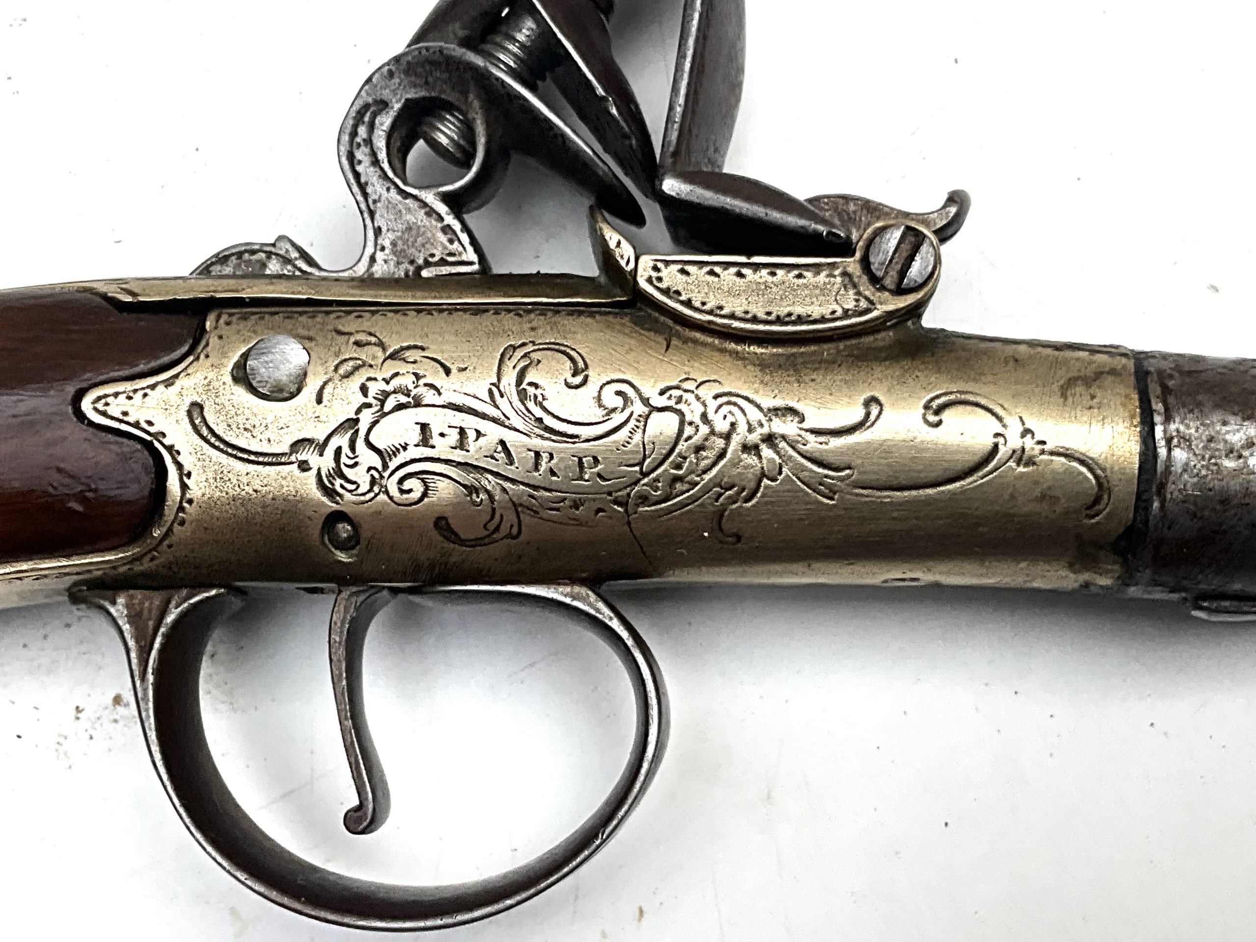 An 18th Century Flintlock Queen Anne-type Greatcoat Pistol by I Parr, London.