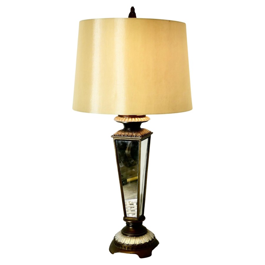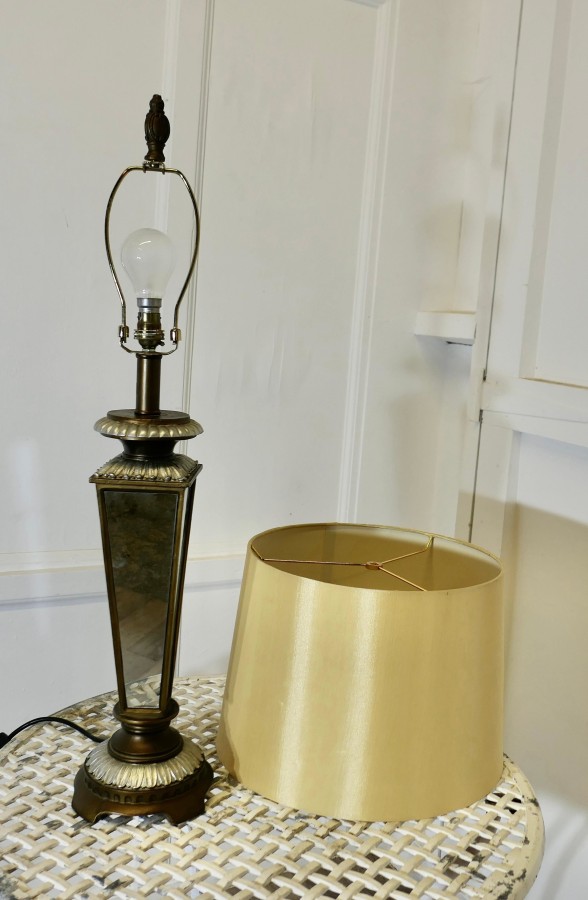 An Art Deco Style Mirror Table Lamp The lamp stands on a circular bronzed and silvered foot, it has a 4 sided mirrored central column set in brass with further decoration matching the base This is a stunning lamp and it has a gold linen shade The lamp is in good condition, the wiring is relatively new The lamps is 30” high including the shade and 15” in diameter, 7” at the base ZX332 Manufacture Date : 1970 Materials : Mirror