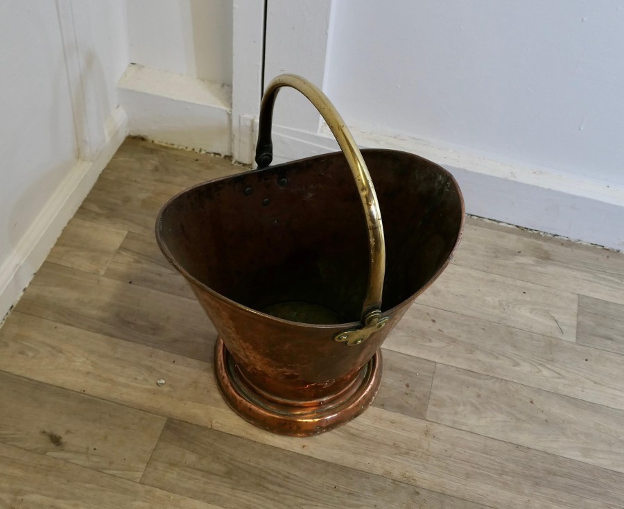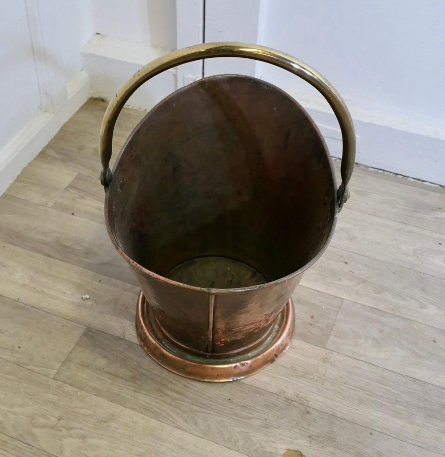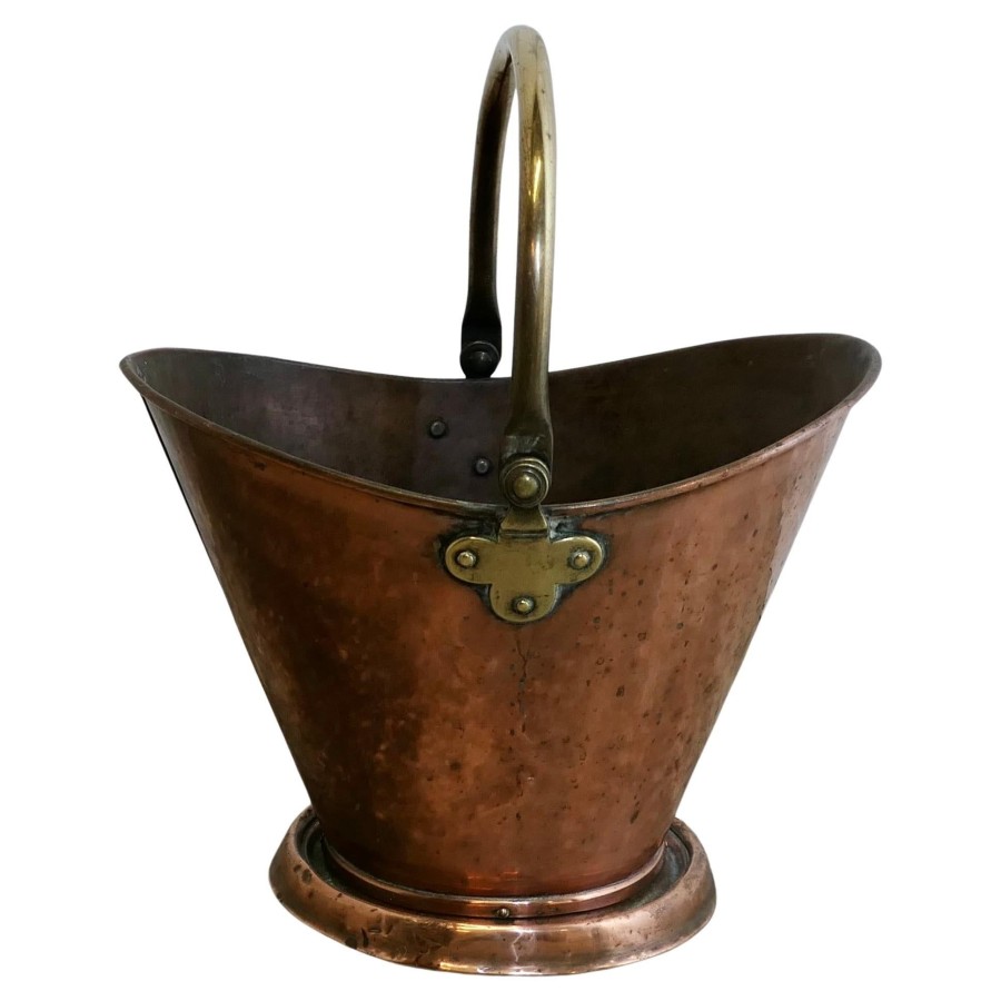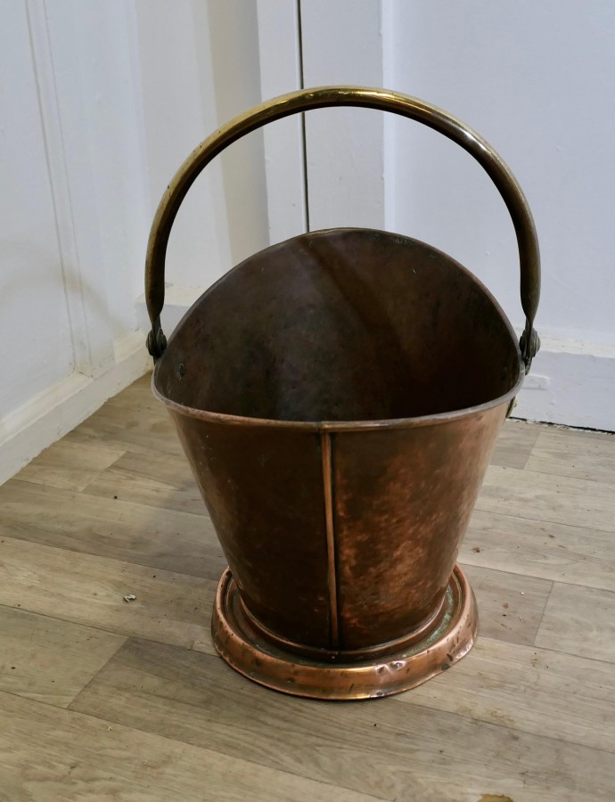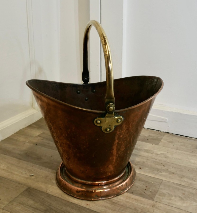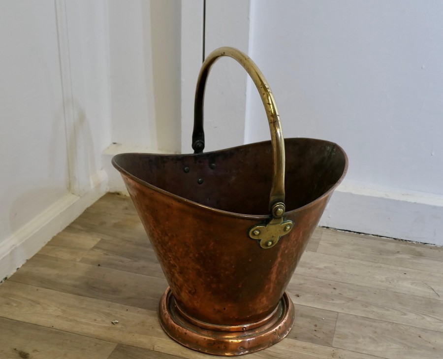An Arts and Crafts Copper Helmet Coal Scuttle This bucket is a very attractive Oval shape, it is made in beaten Copper with a brass swing handle The Scuttle is in very good used condition, and is ready to go to work and grace your fireside at the same time The Bucket is 18” tall, 15” long and 12” wide ZX243 Manufacture Date : 19th Century Materials : Copper