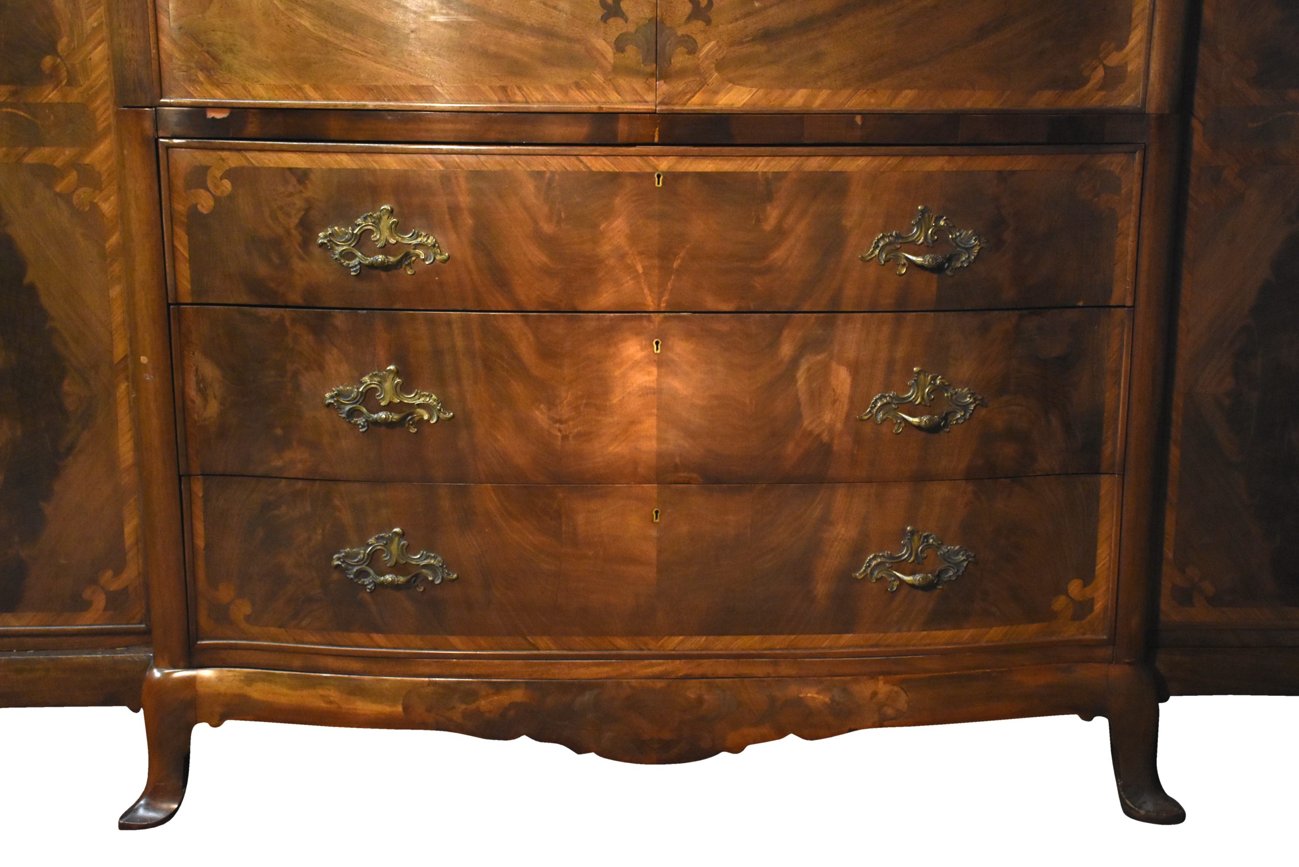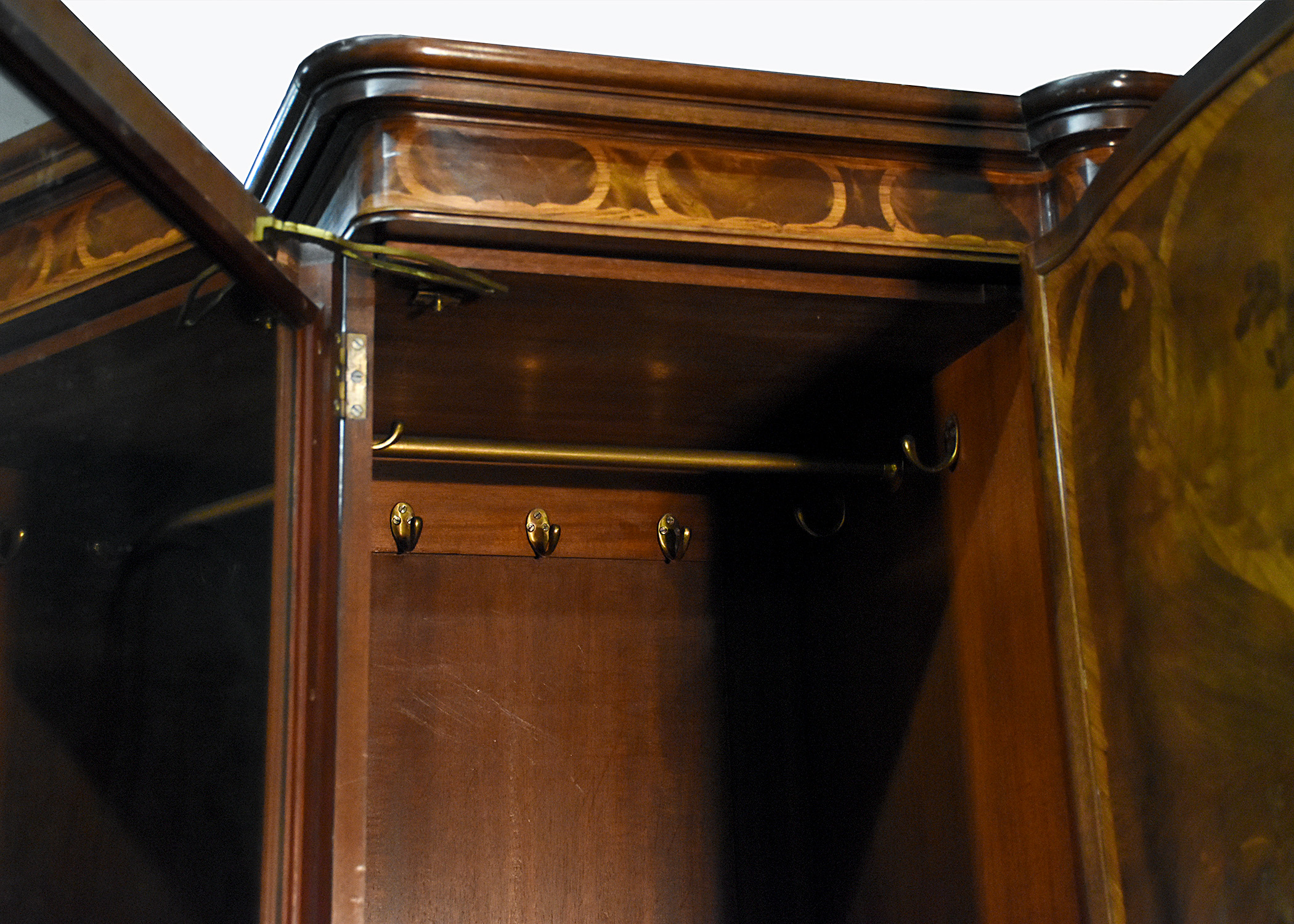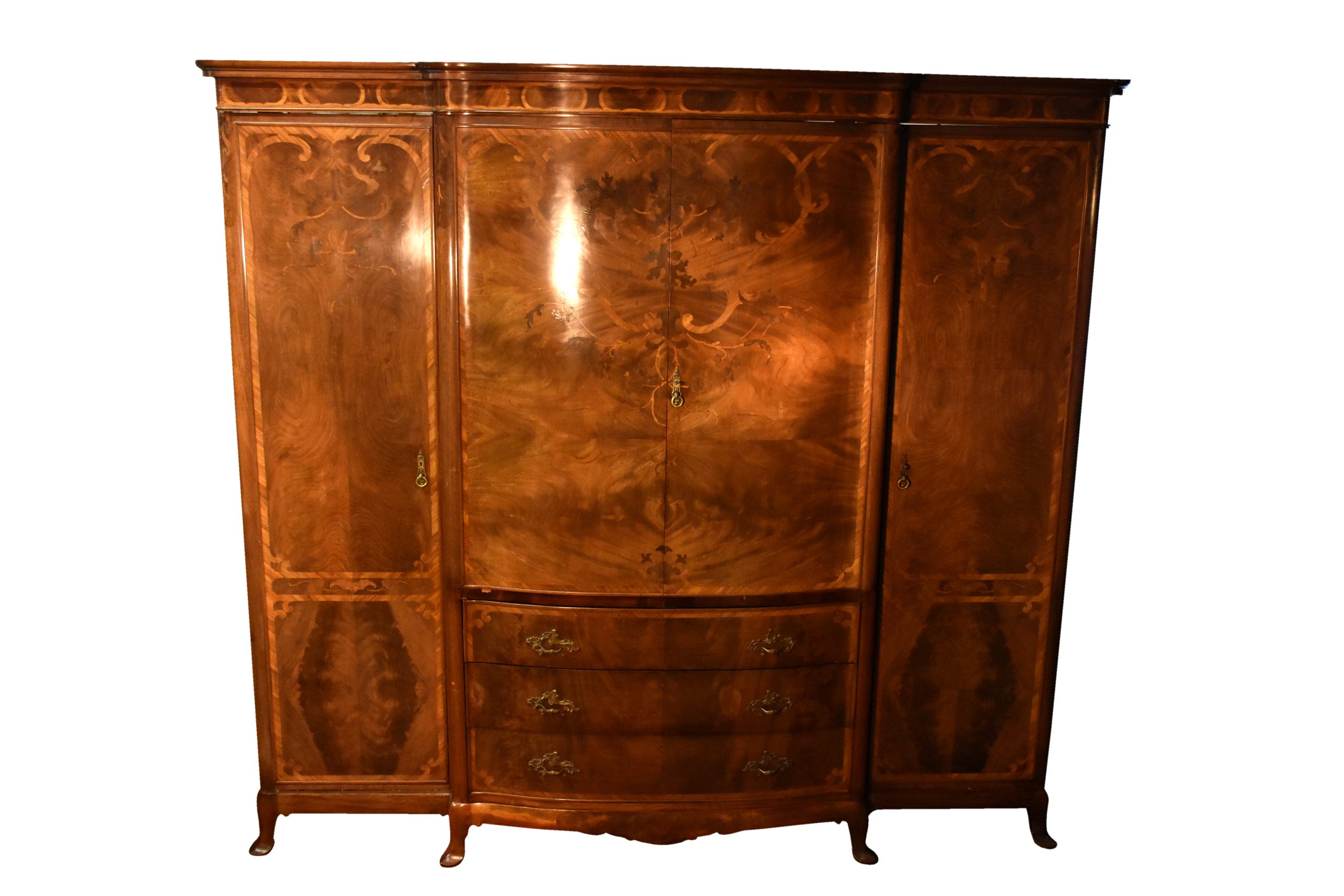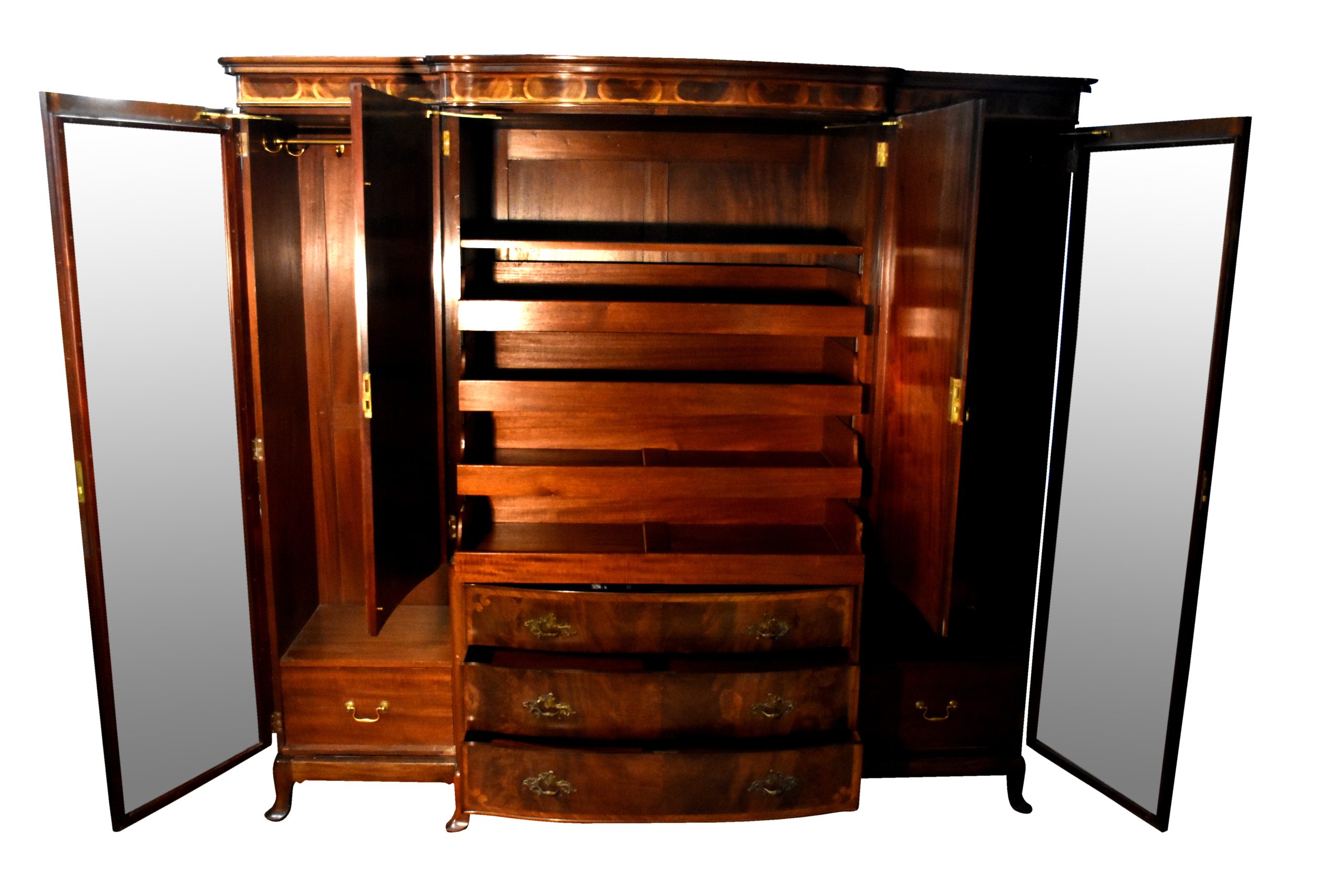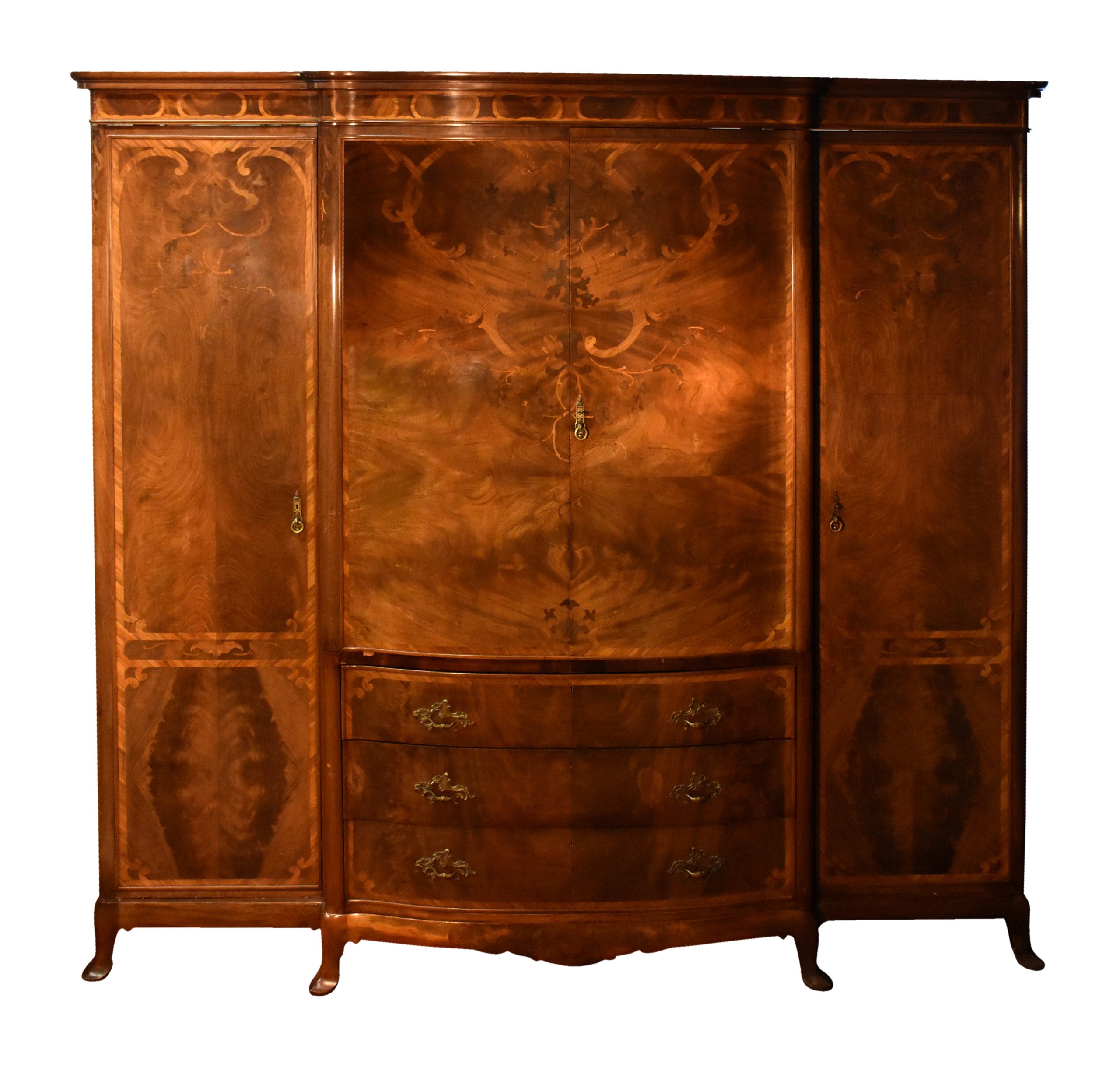 Circa 1900, an exhibition quality walnut wardrobe by Whytock & Reid of Edinburgh, of serpentine breakfront outline with an elegant stylish moulded cornice above a pair of doors with strap work and foliate inlay, opening to sliding trays, above three long drawers with elegant hardware, flanked by long cupboards with hanging spaces and a base drawer with mirror-backed doors, all resting on an elegant base with a shaped apron, raised on classic ‘Sir Robert Lorimer’ feet finishing with an elegant pad foot.