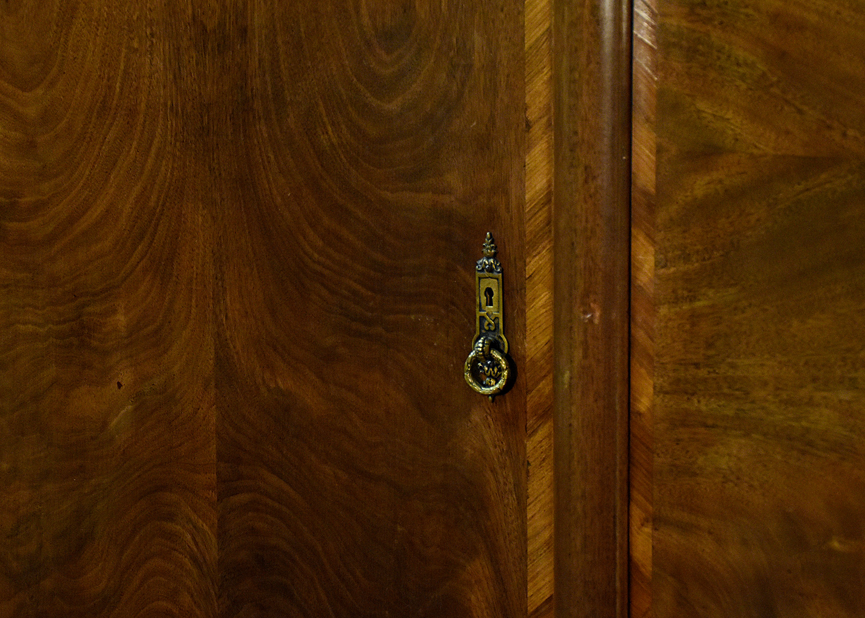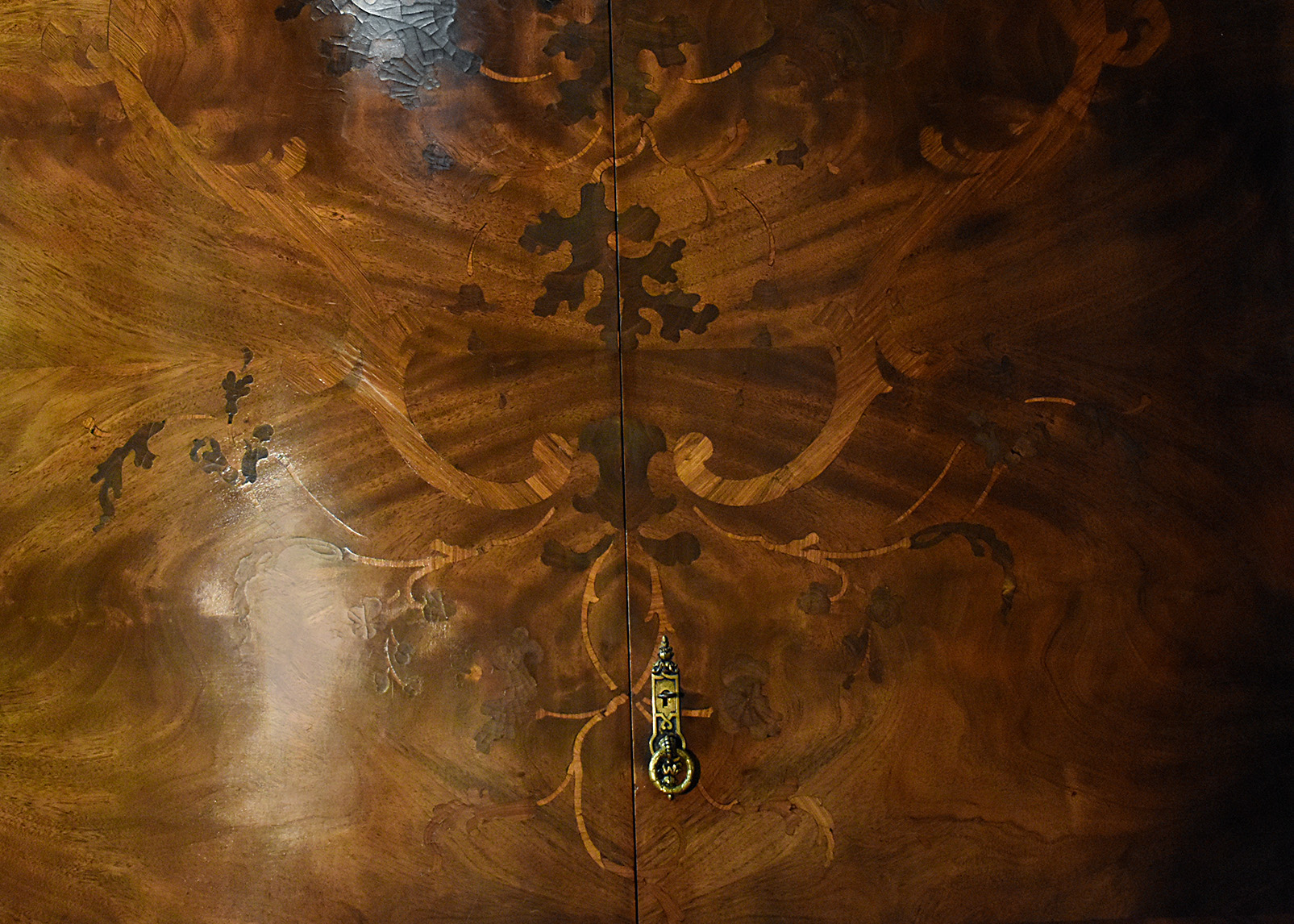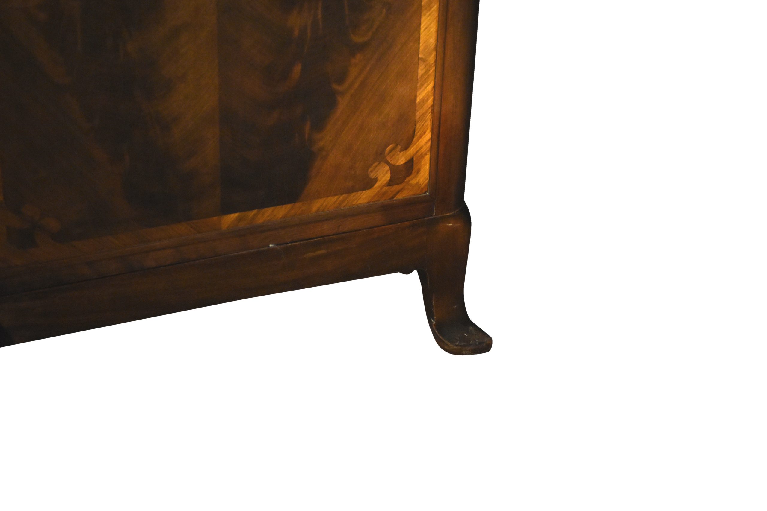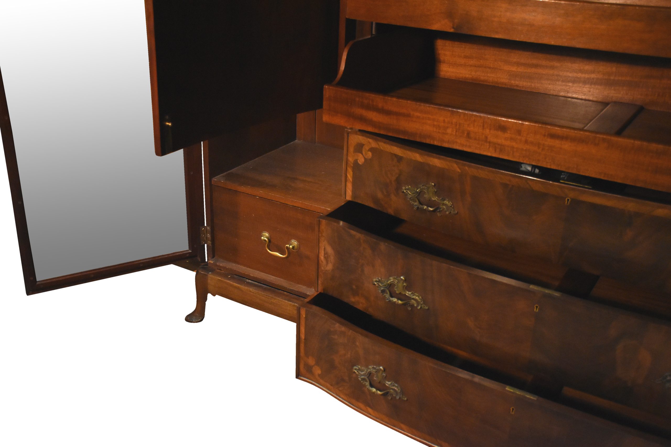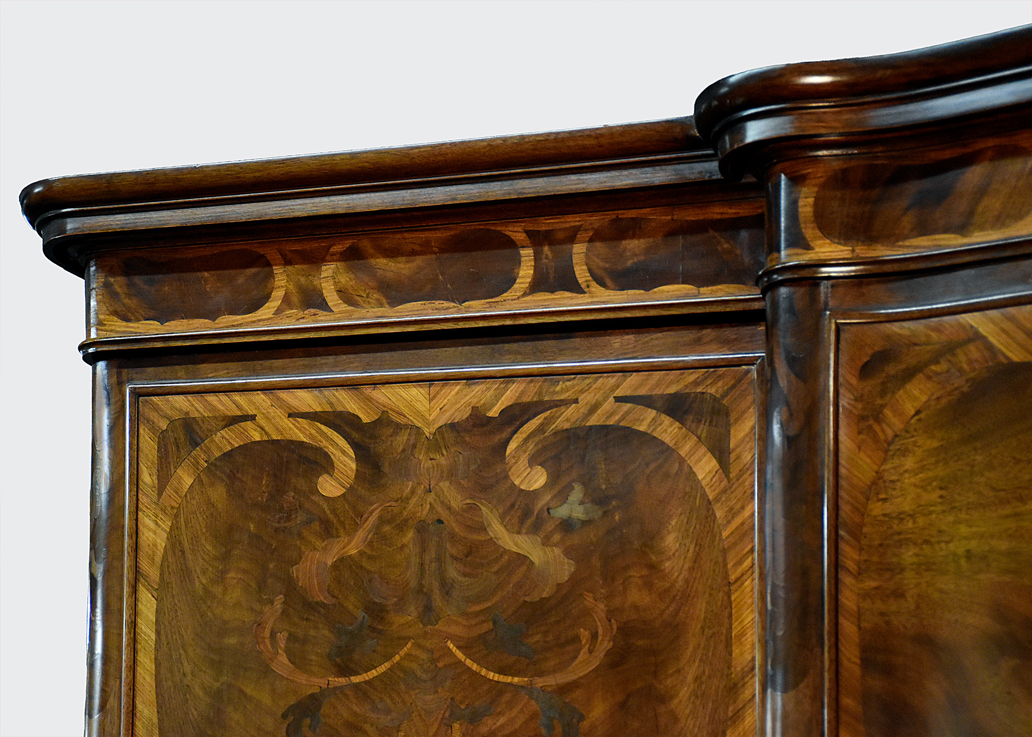 Circa 1900, an exhibition quality walnut wardrobe by Whytock & Reid of Edinburgh, of serpentine breakfront outline with an elegant stylish moulded cornice above a pair of doors with strap work and foliate inlay, opening to sliding trays, above three long drawers with elegant hardware, flanked by long cupboards with hanging spaces and a base drawer with mirror-backed doors, all resting on an elegant base with a shaped apron, raised on classic ‘Sir Robert Lorimer’ feet finishing with an elegant pad foot.