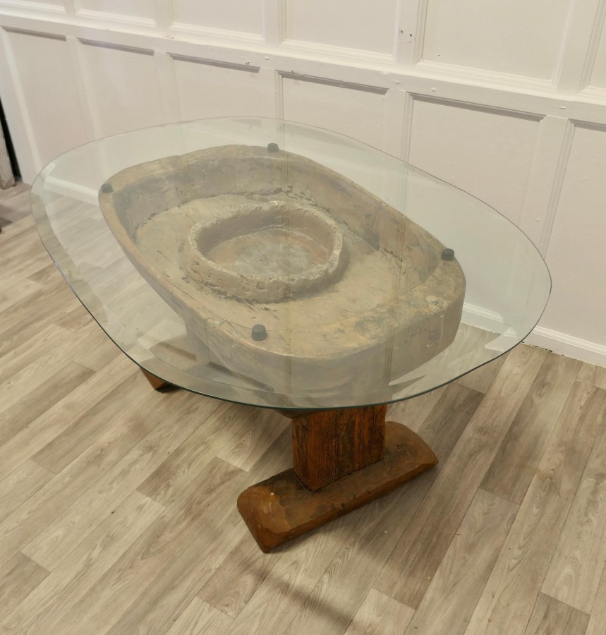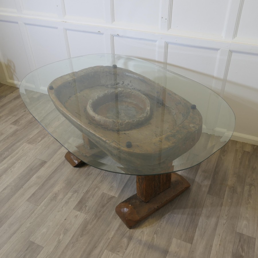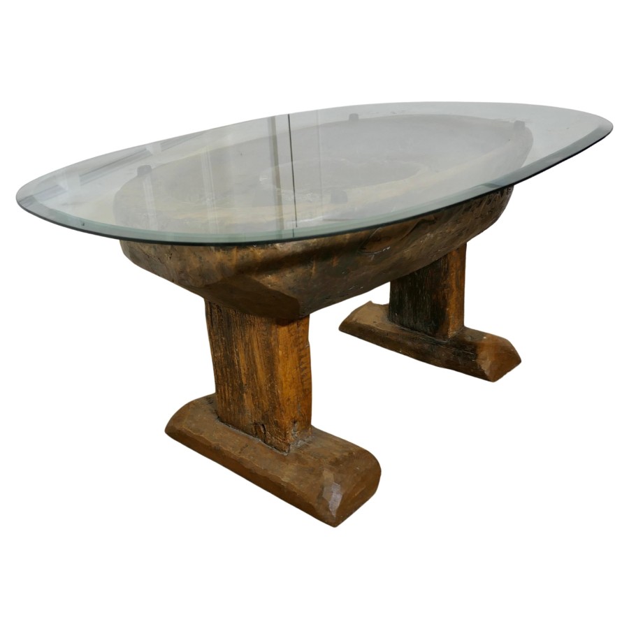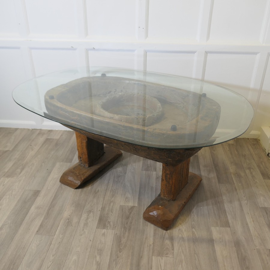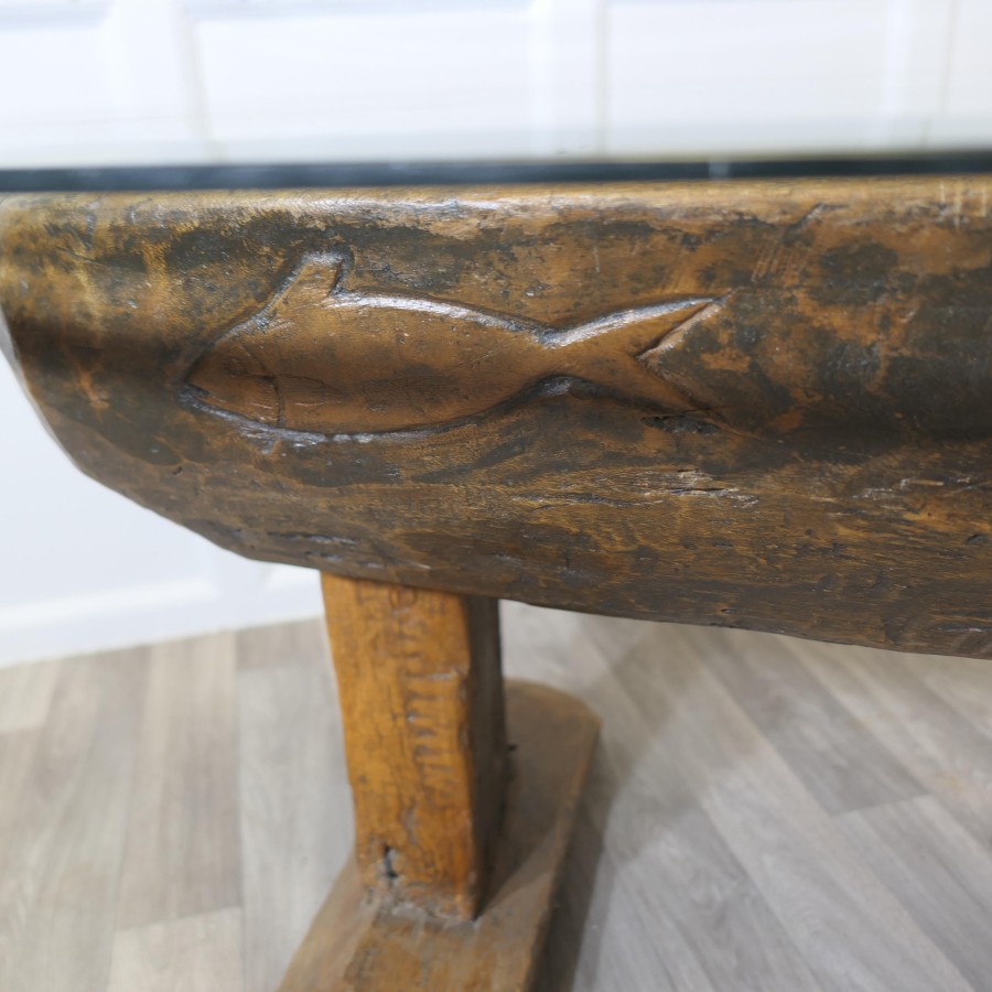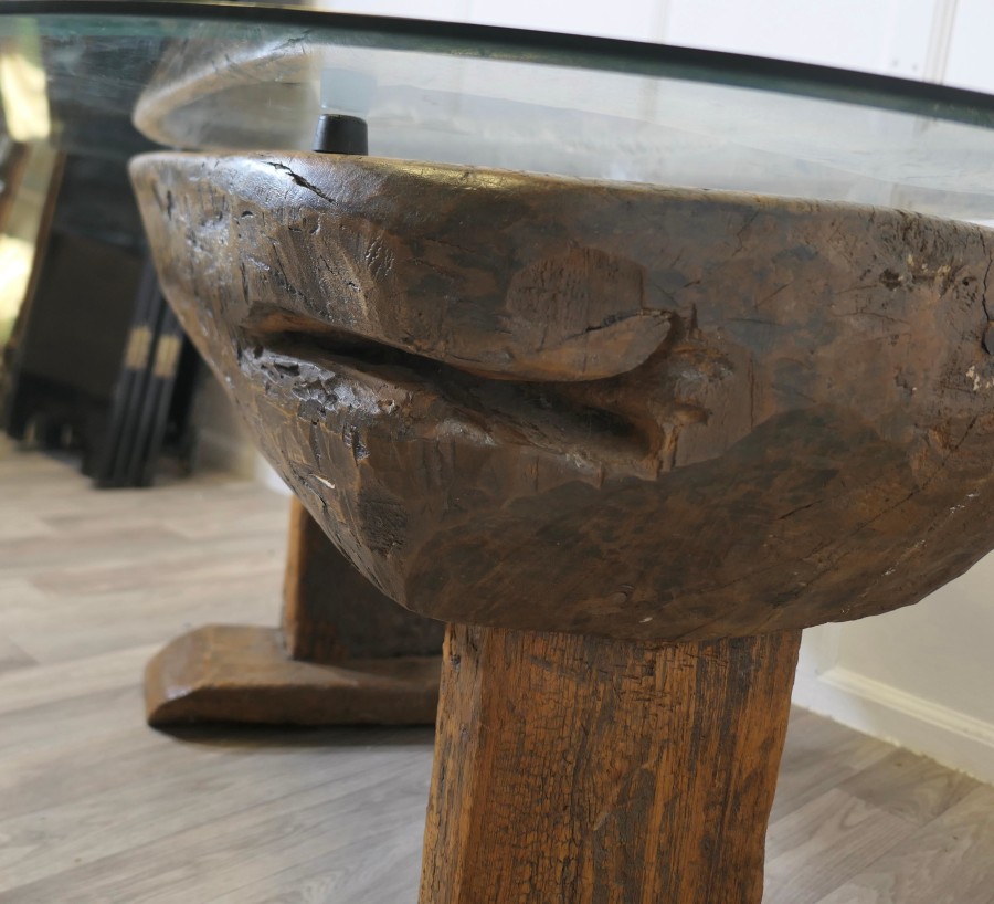 Ancient Preparation Table, Now Rustic Coffee Table This is a splendid ancient piece, it is very heavy and carved from the tree, it has a large bath and a smaller central bowl, all set on very strong and chunky legs. The table has been made for the preparation of food and assuming from the carvings on the outside it was designed to prepare fish, possibly cheese, it may also be for serving food like rice in the outer ring The sides of the table top have carvings and at least 1 very deep crevice formed by the natural growth of the tree, we have added a thick plate glass top with a bevelled edge to convert the table into a useable coffee table without concealing its original look The Coffee table is oval it is 24” high, 50” long and 35” wide TNG51 Manufacture Date : 18th Century Materials : Oak