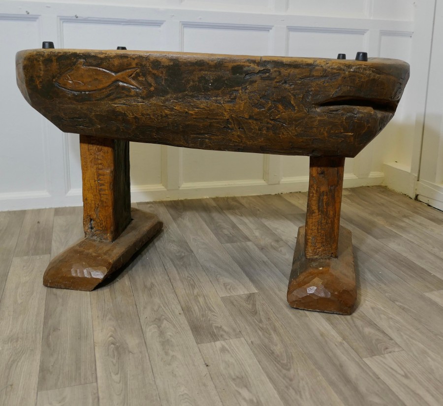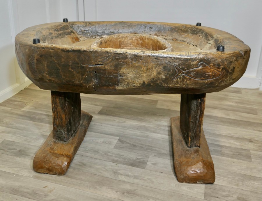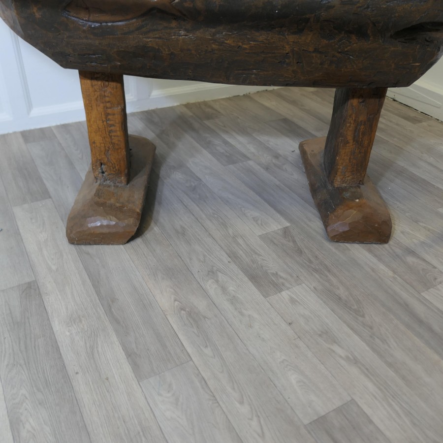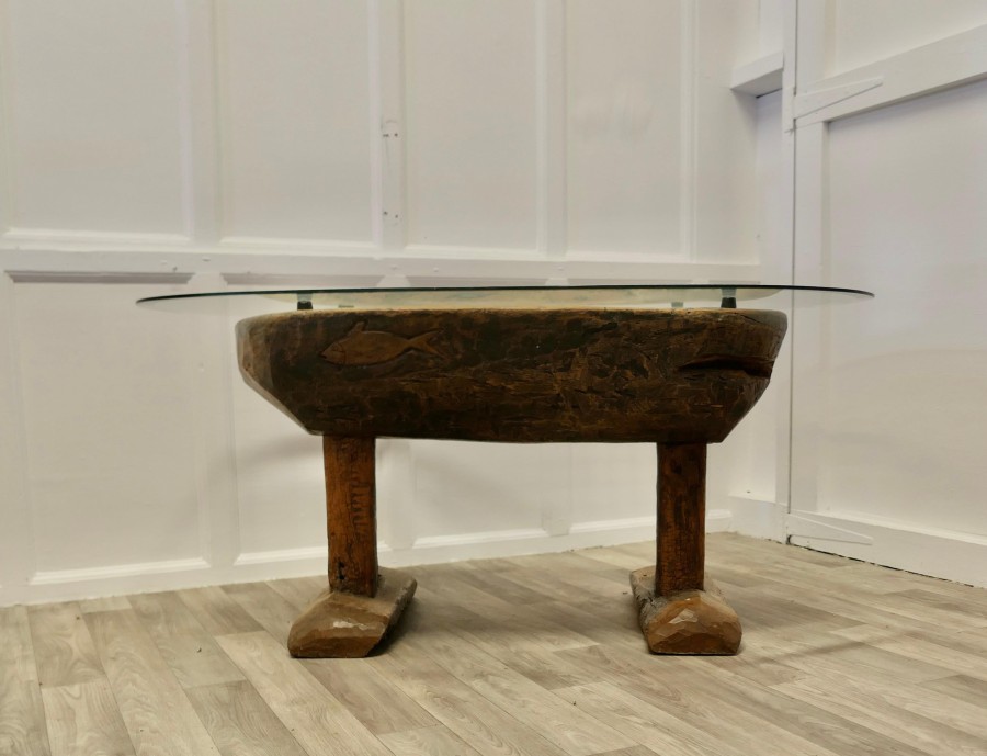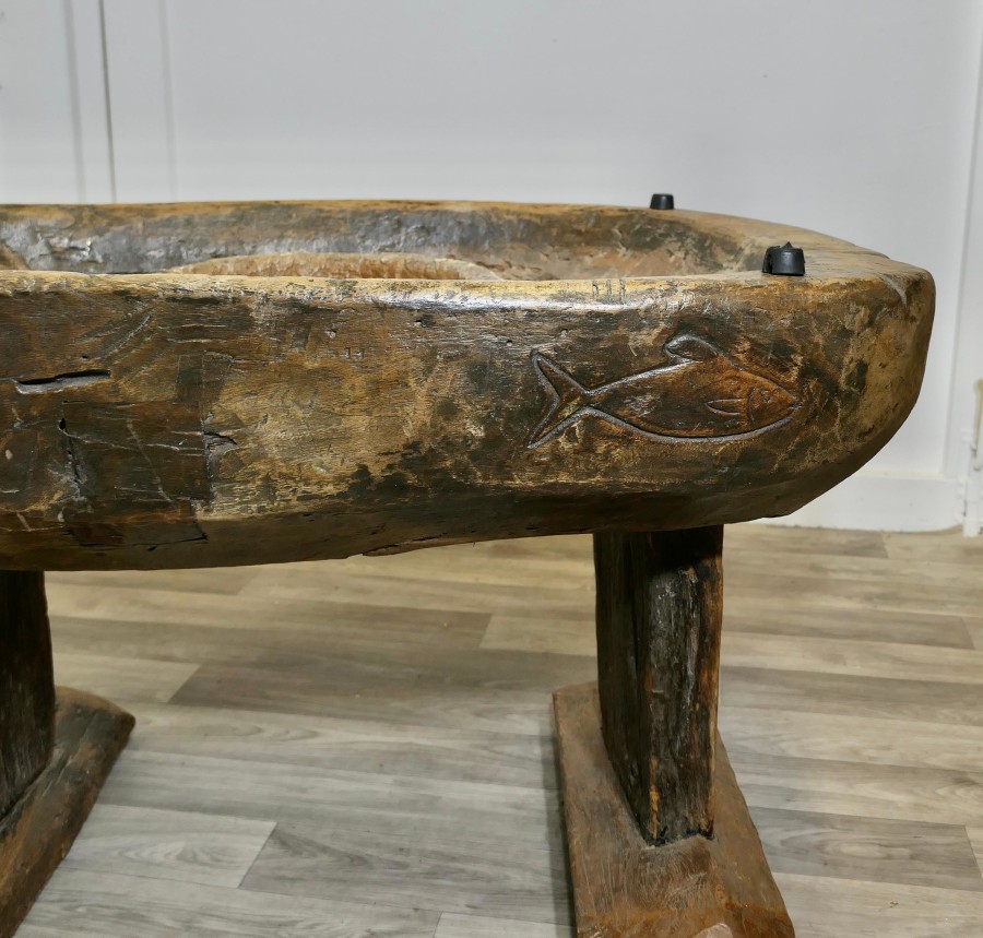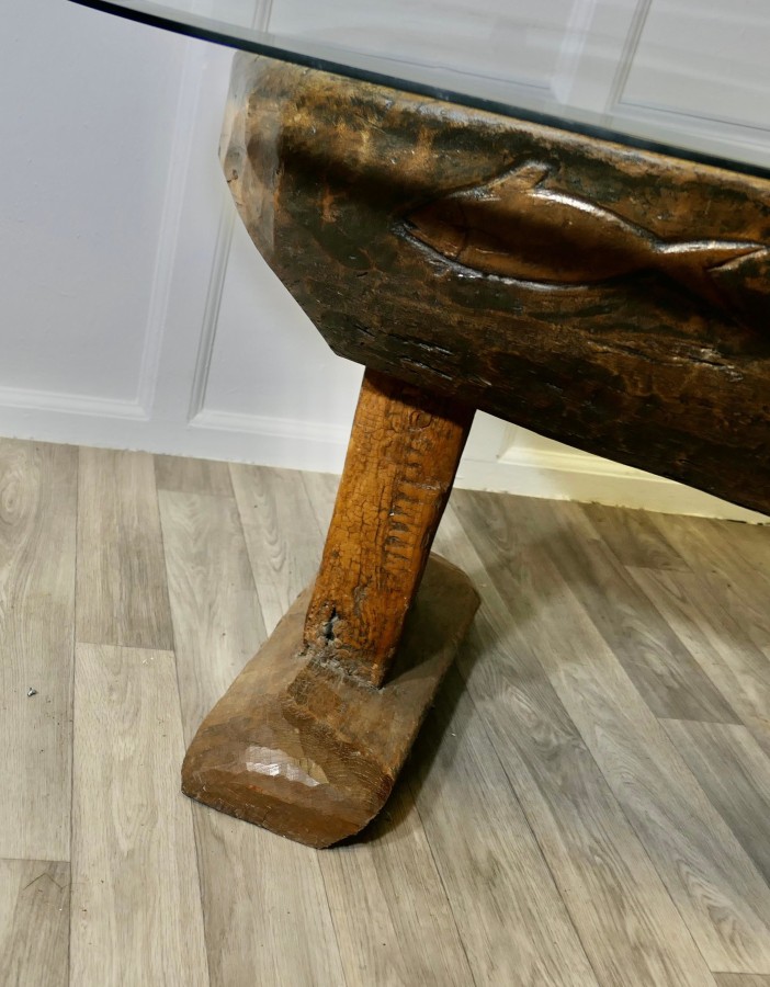 Ancient Preparation Table, Now Rustic Coffee Table This is a splendid ancient piece, it is very heavy and carved from the tree, it has a large bath and a smaller central bowl, all set on very strong and chunky legs. The table has been made for the preparation of food and assuming from the carvings on the outside it was designed to prepare fish, possibly cheese, it may also be for serving food like rice in the outer ring The sides of the table top have carvings and at least 1 very deep crevice formed by the natural growth of the tree, we have added a thick plate glass top with a bevelled edge to convert the table into a useable coffee table without concealing its original look The Coffee table is oval it is 24” high, 50” long and 35” wide TNG51 Manufacture Date : 18th Century Materials : Oak