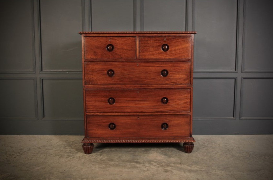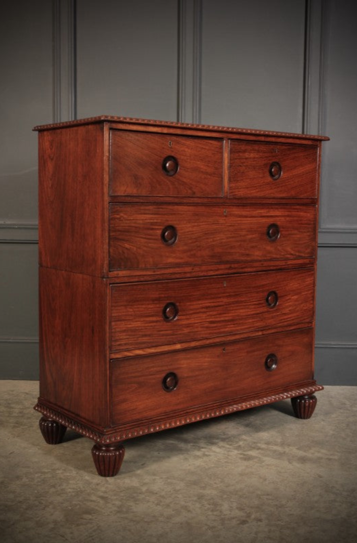 Its top surface is finished with a beautifully carved gadrooned edge, adding a refined decorative element that continues around the base. The front is arranged with two short drawers over three long ones, providing generous and practical storage. Each drawer is finely constructed with traditional hand-cut dovetail joints, cockbeaded fronts, and carved recessed handles.