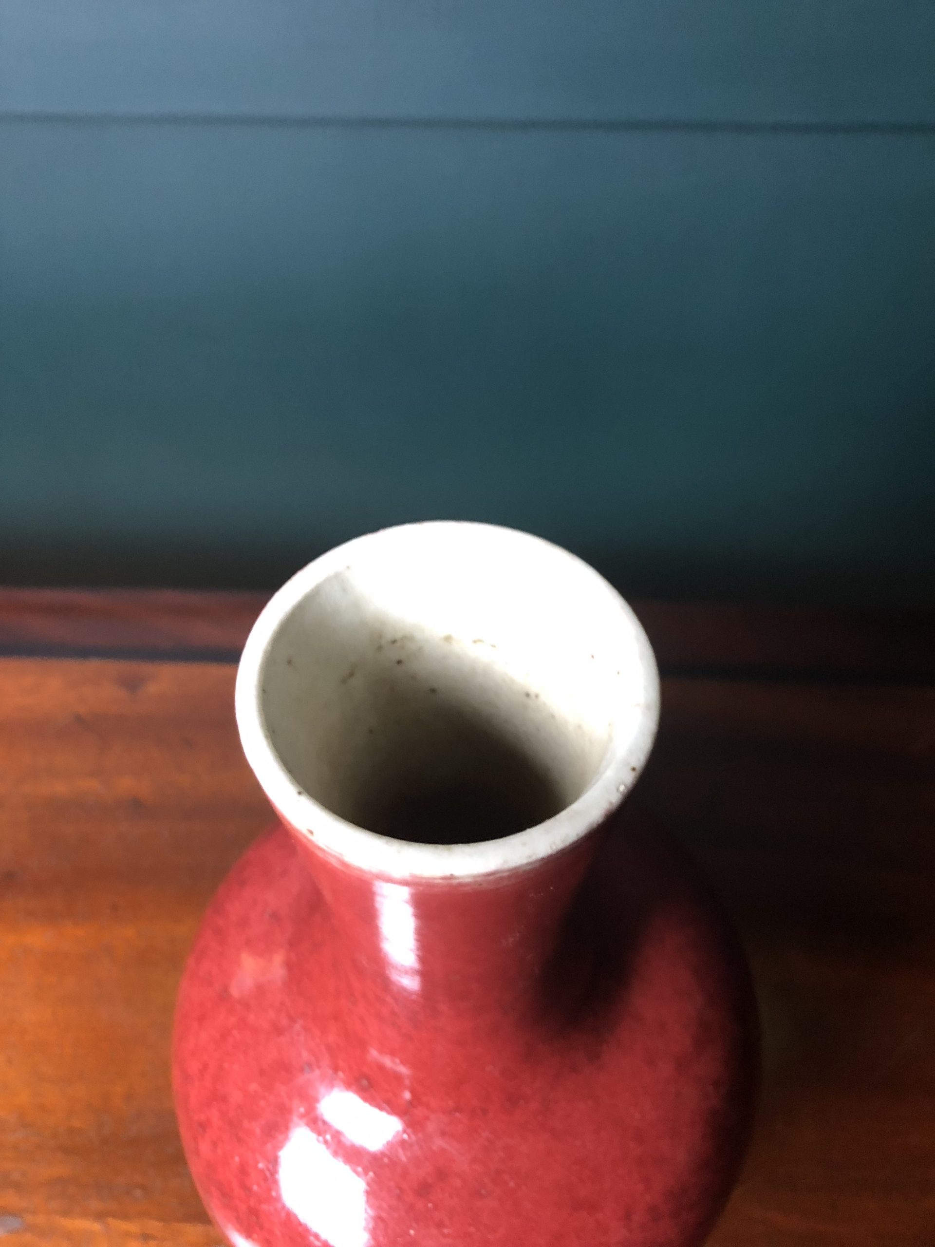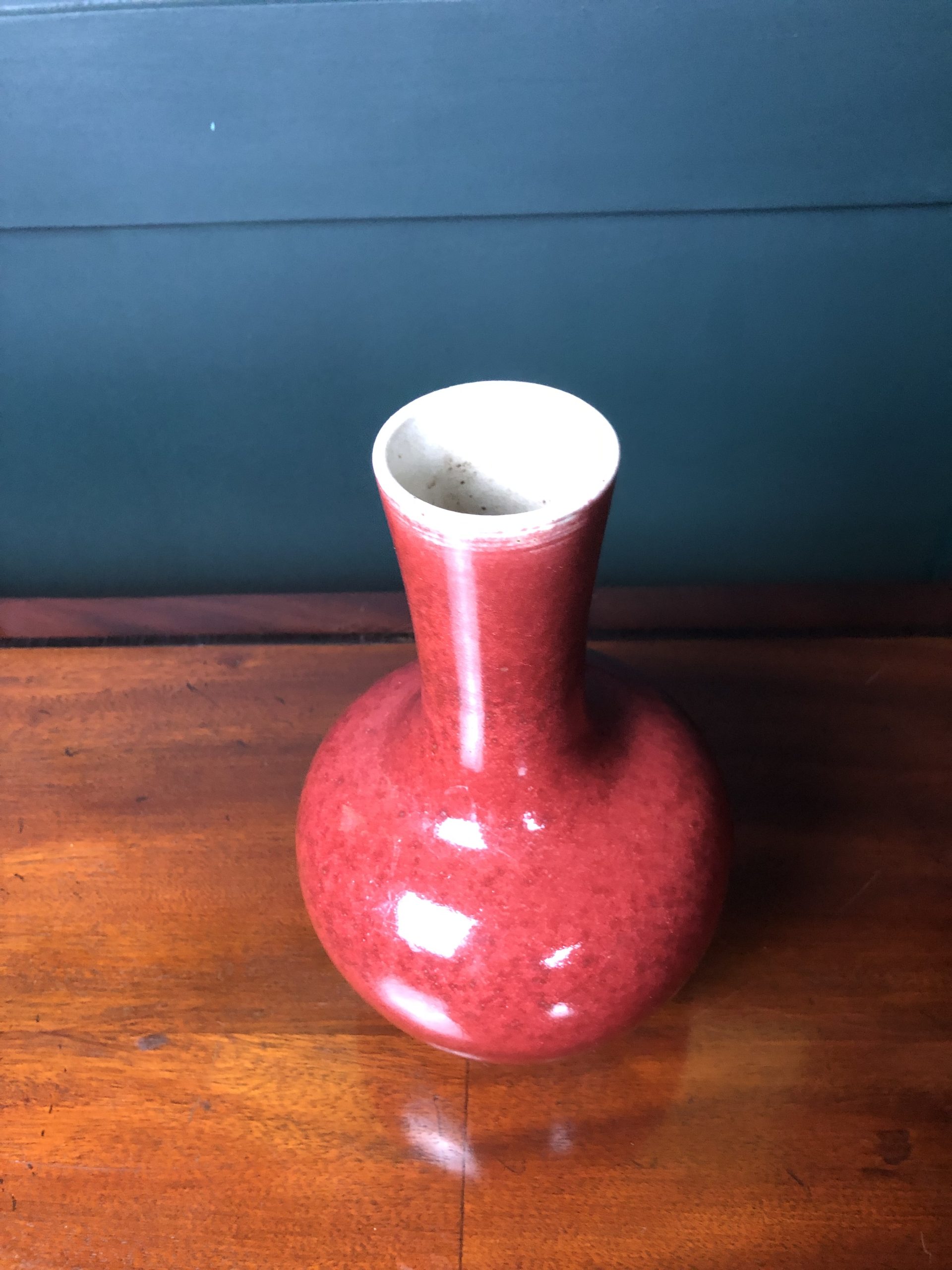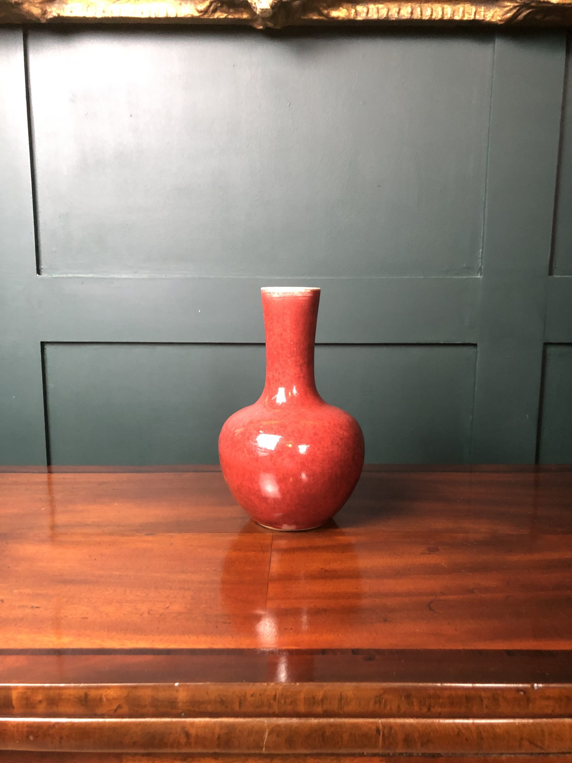 A superb example of Qing dynasty craftsmanship, this antique Chinese *tianqiuping*-form bottle vase showcases the iconic *sang de boeuf* (“ox-blood”) flambé glaze—rich, deep crimson with subtle mottling and beautiful tonal variations created through the oxidation of iron and copper. The glaze pools and transitions organically across the rounded body, reflecting the highly prized unpredictability that made flambé wares so desirable from the Kangxi reign onward.