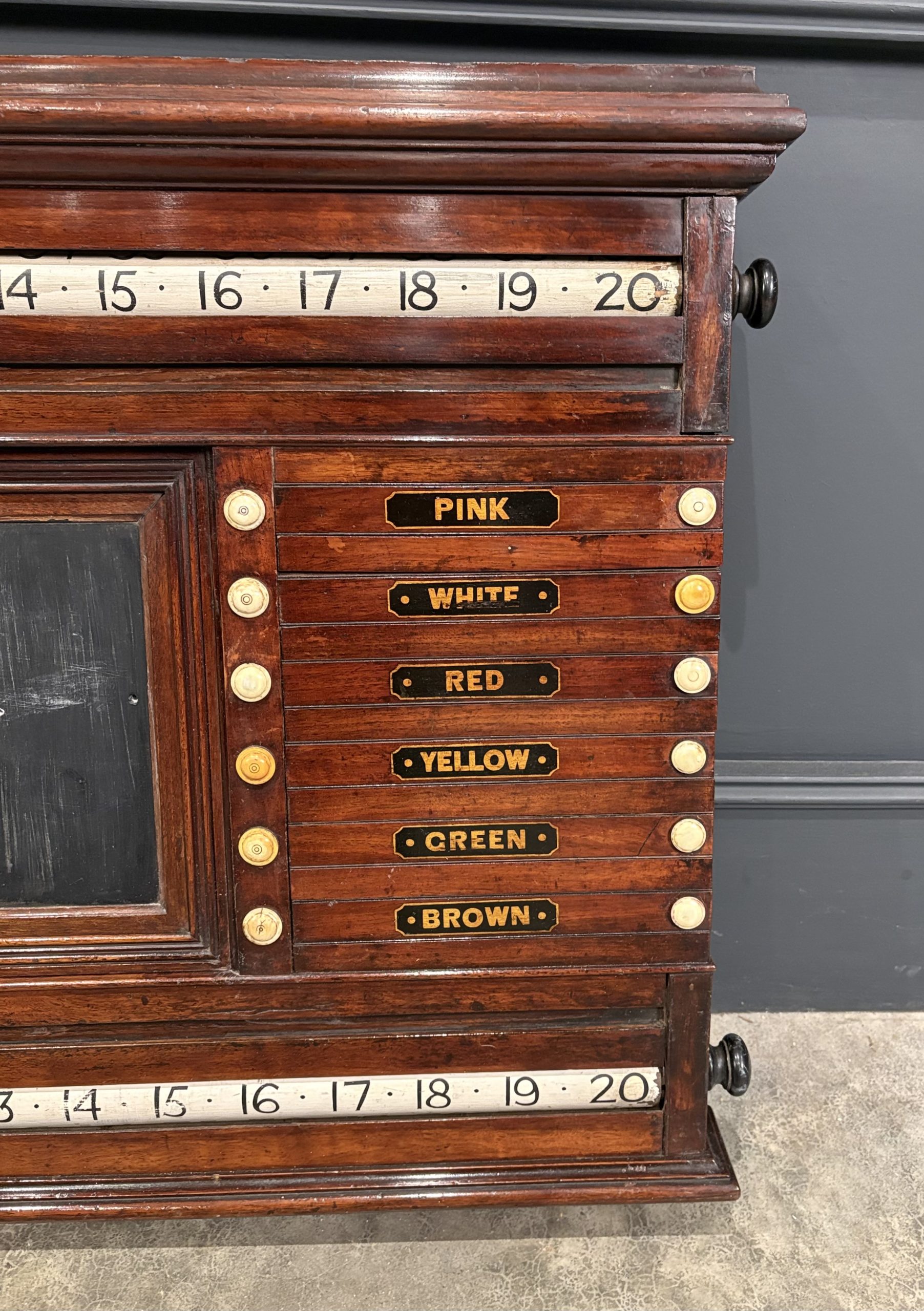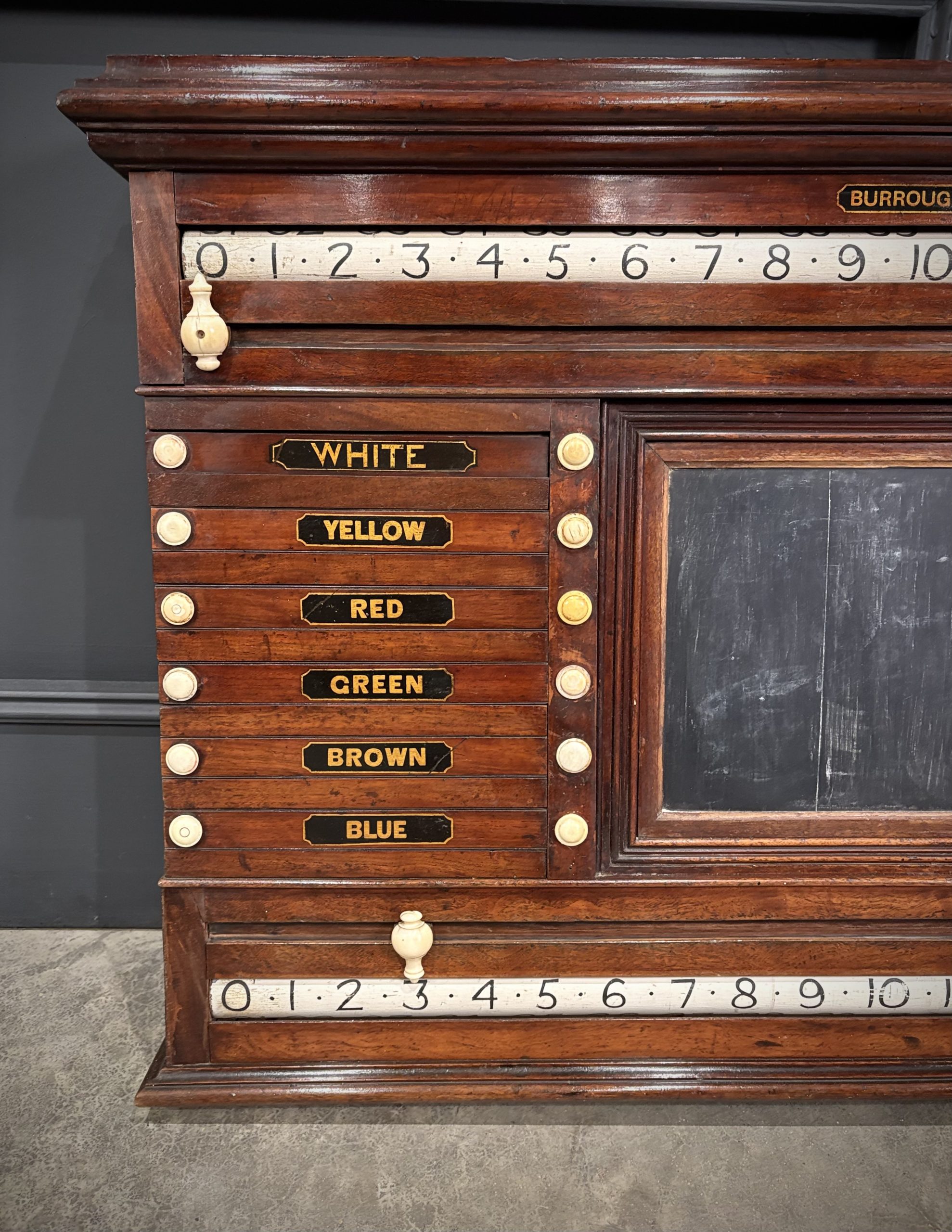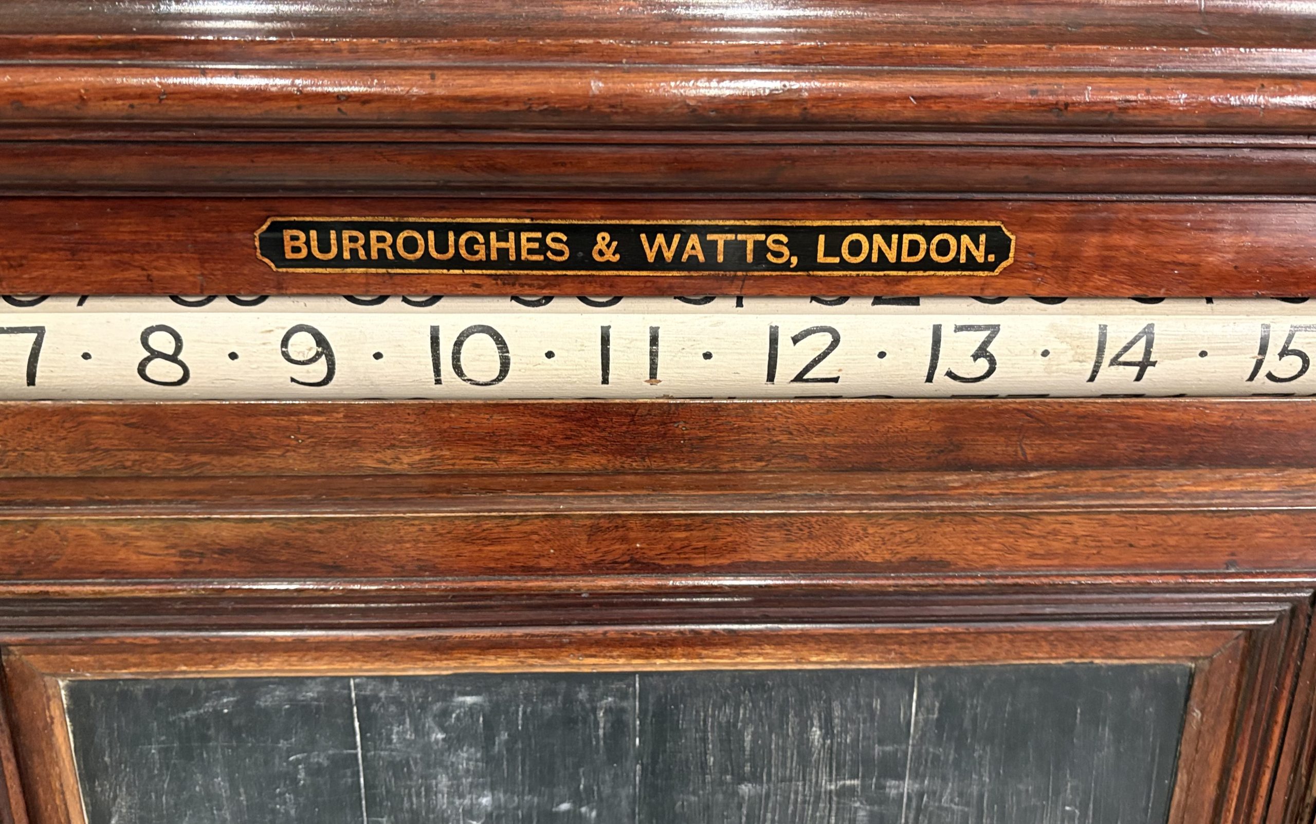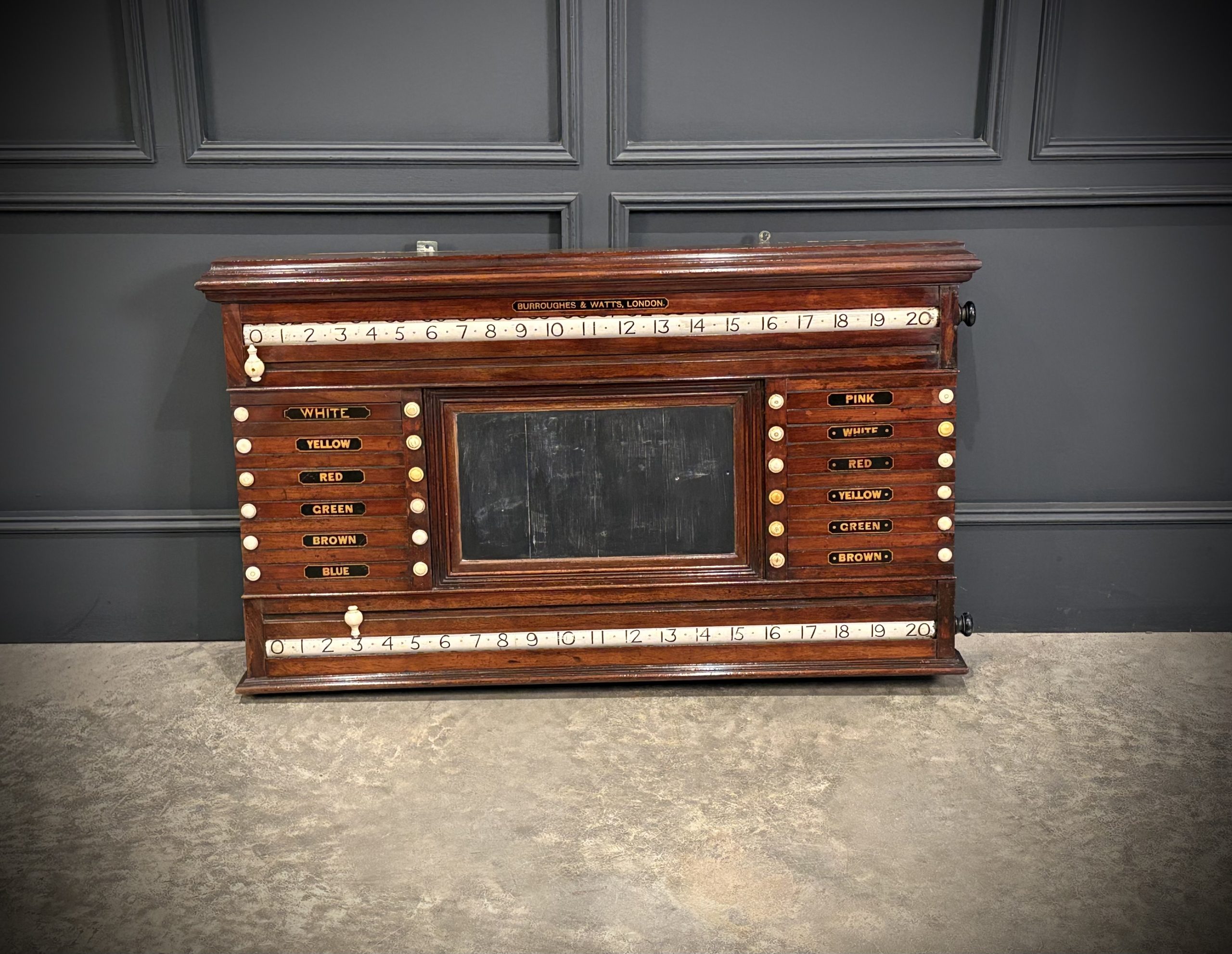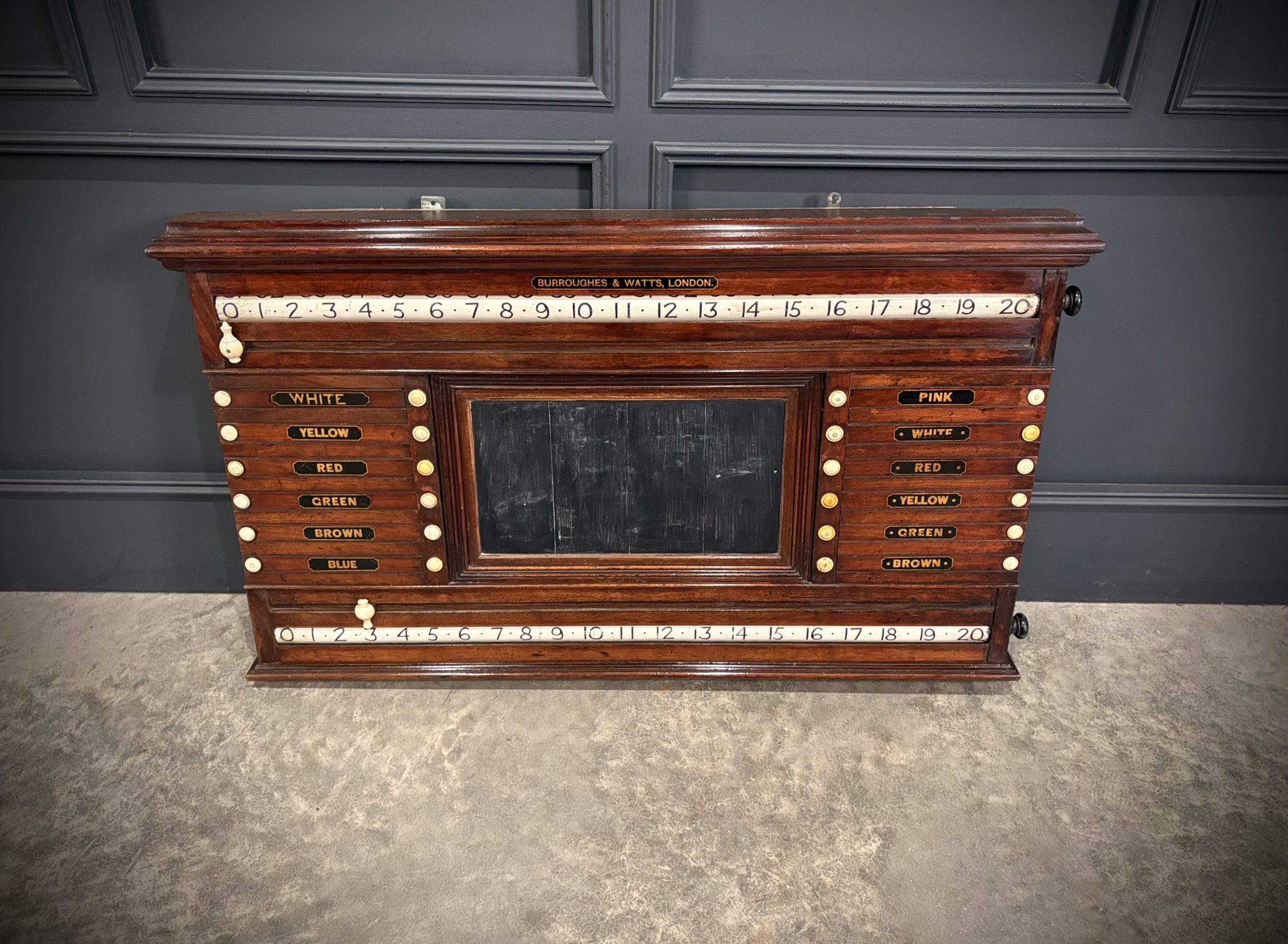 A fine late 19th century wall-mounted billiards scoreboard by the renowned makers Burroughes & Watts, London, as indicated by the original maker’s plaque to the top centre.
