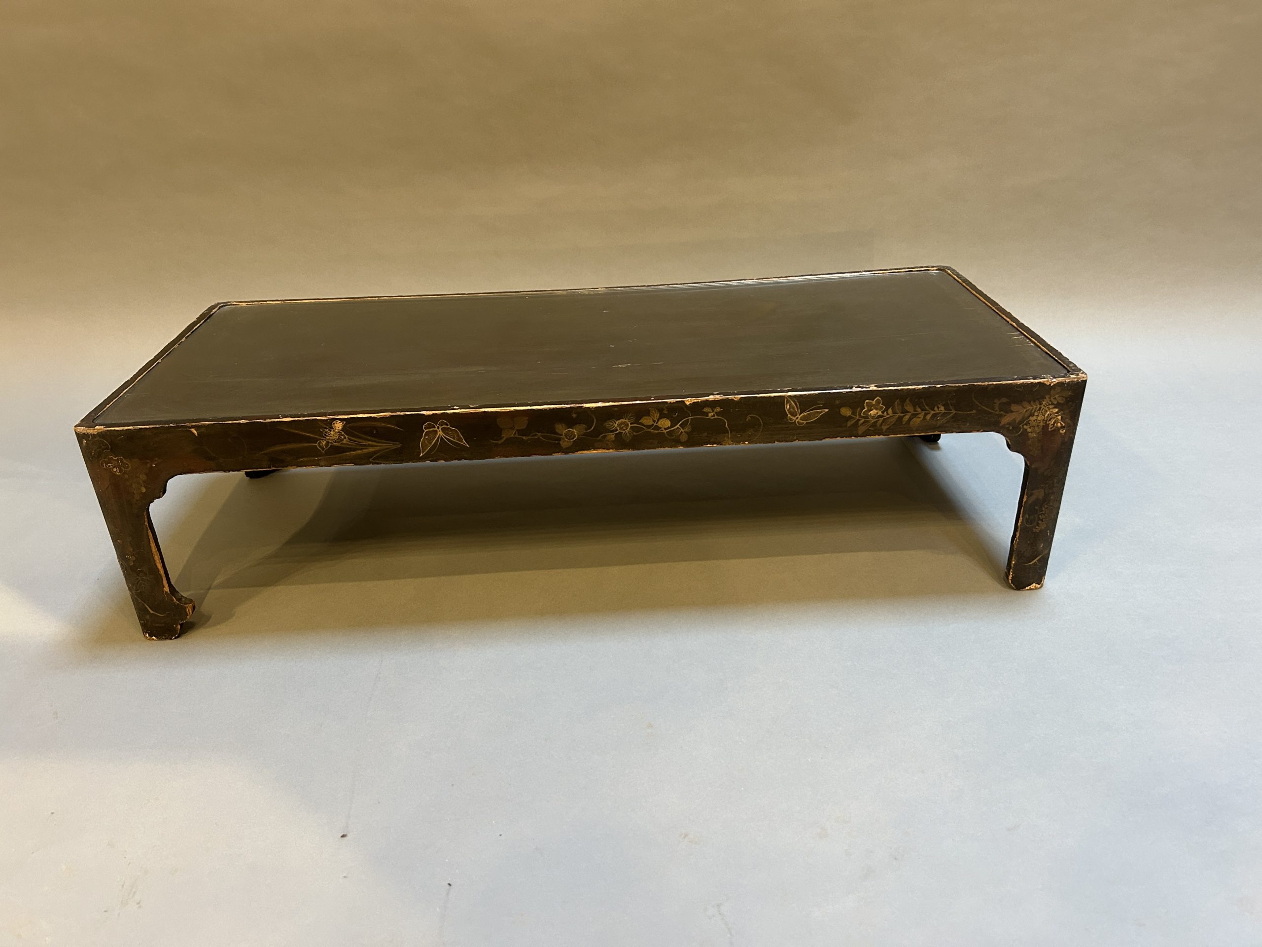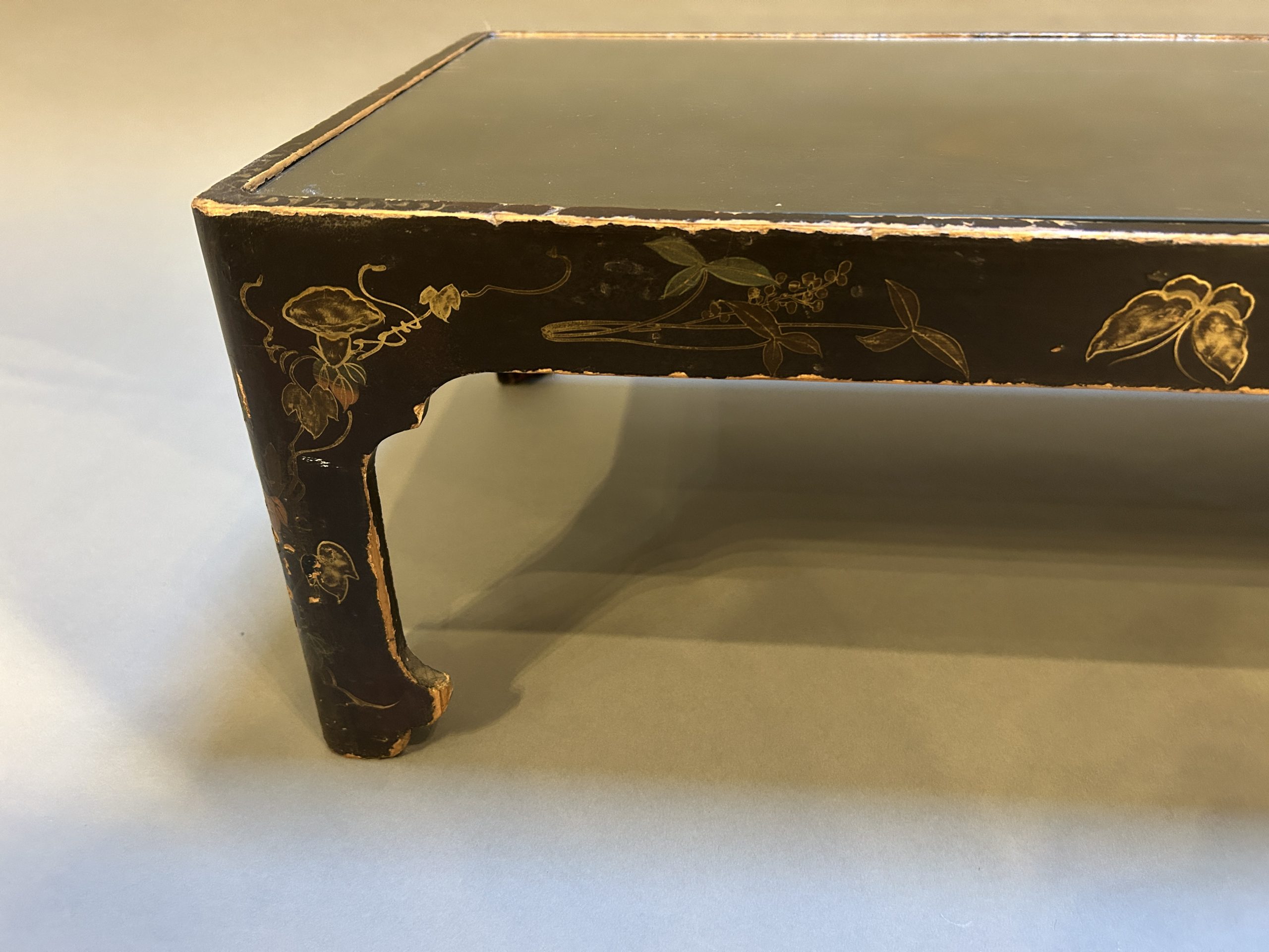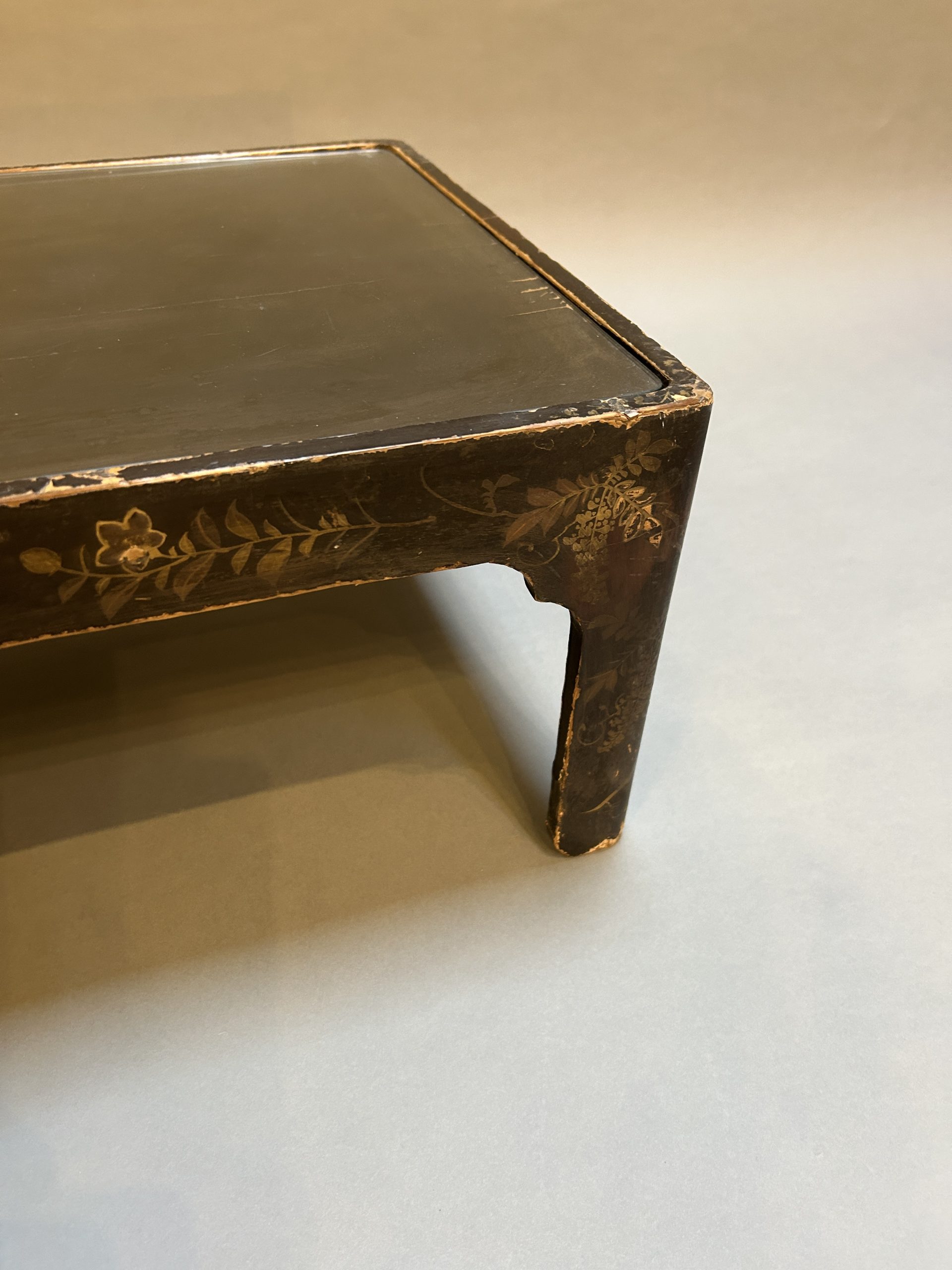 the black lacquer and gilt floral decoration heavily worn, very decorative nonetheless, with inset glass top