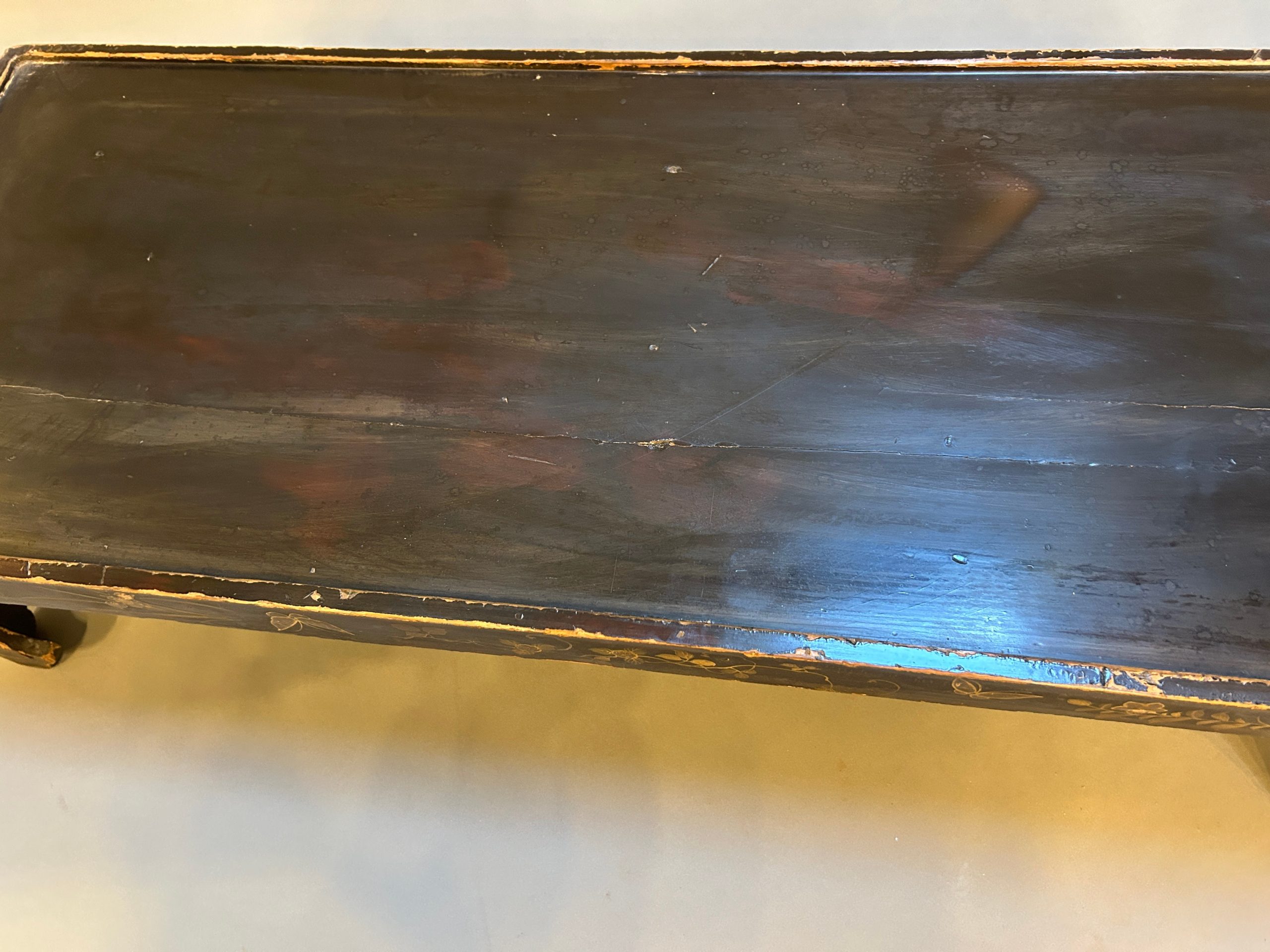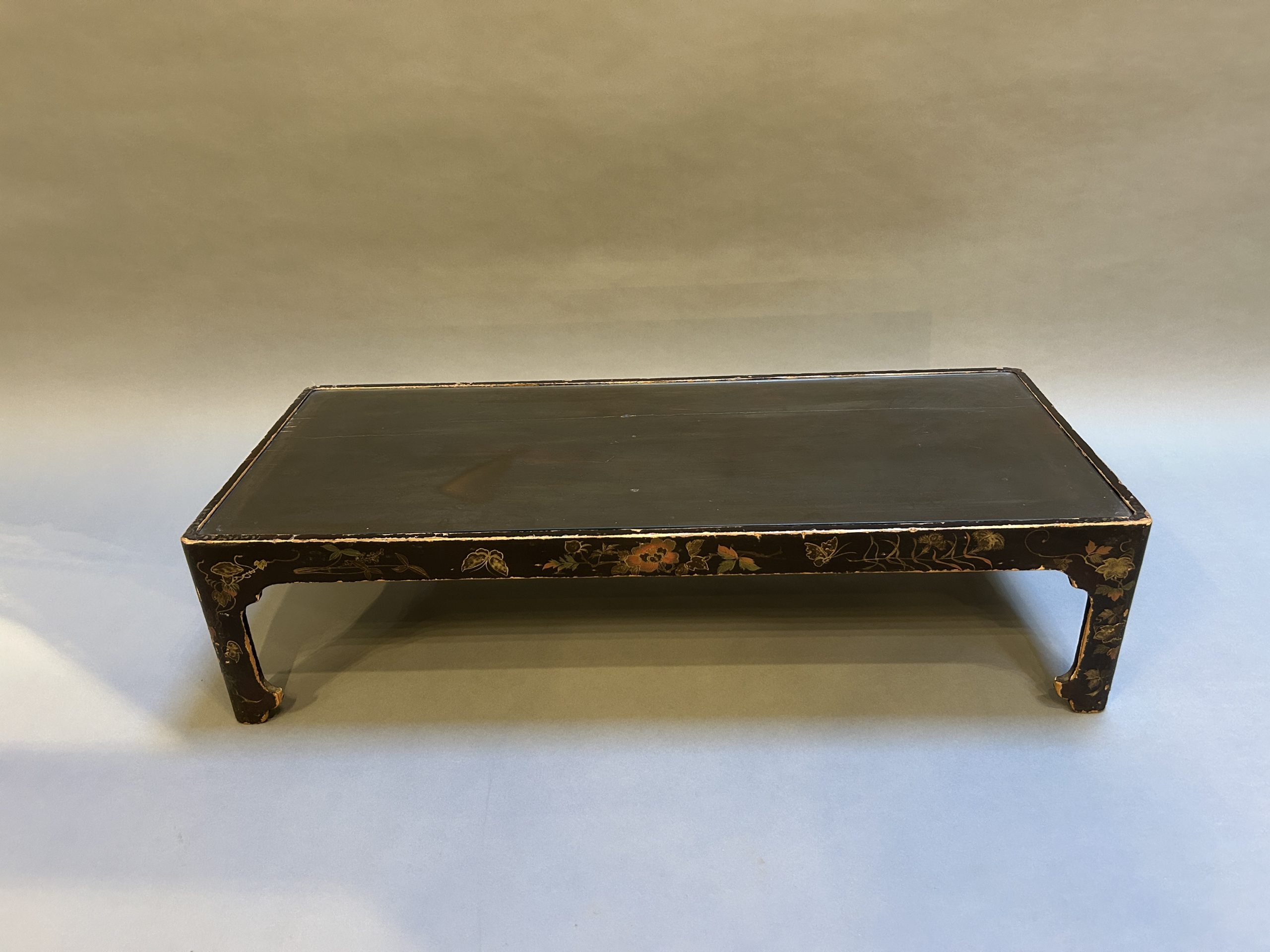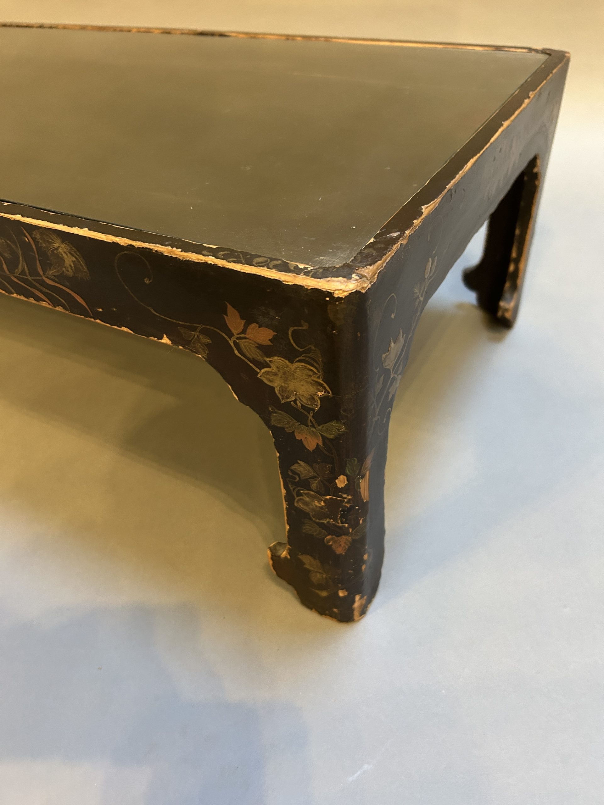 the black lacquer and gilt floral decoration heavily worn, very decorative nonetheless, with inset glass top