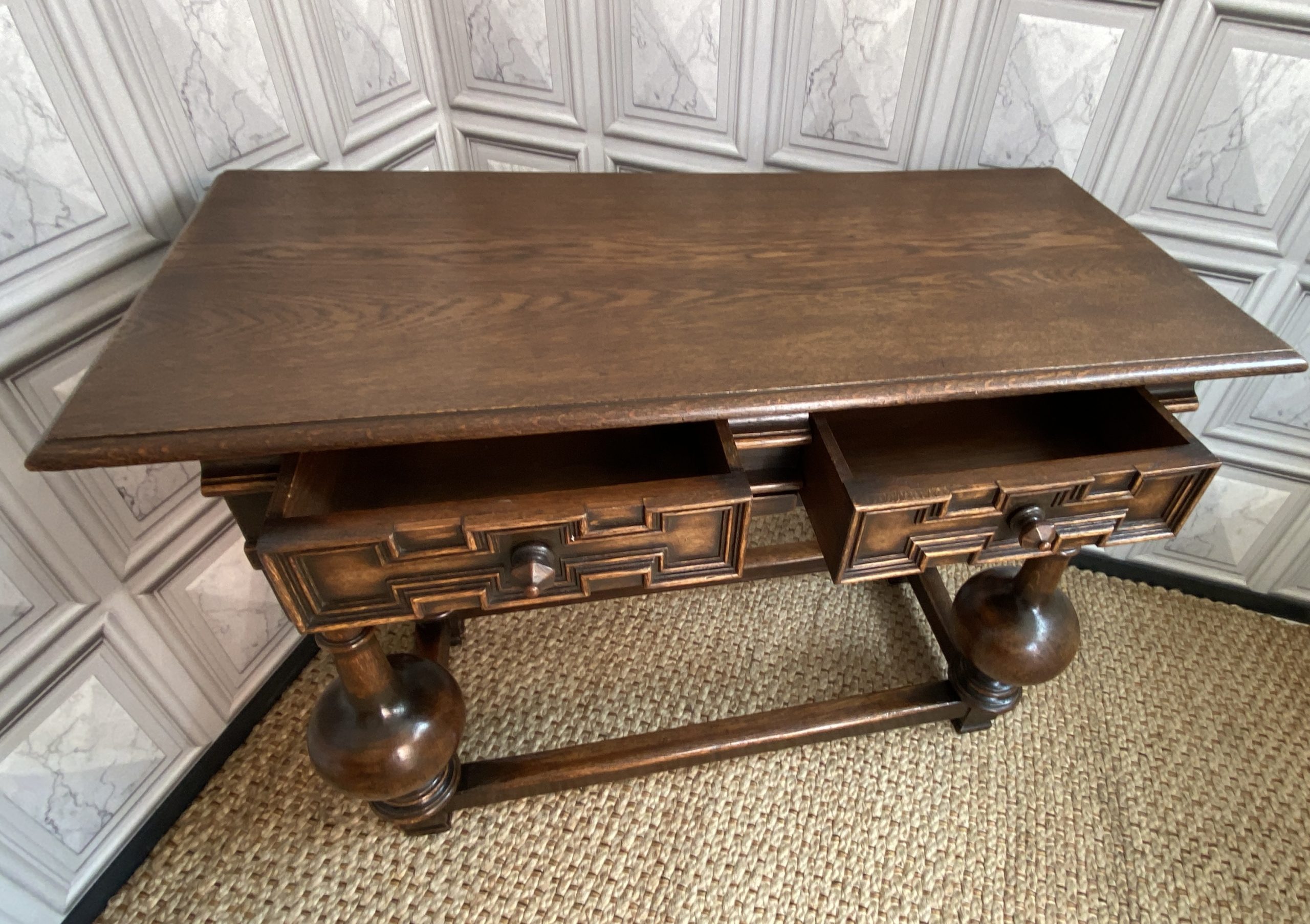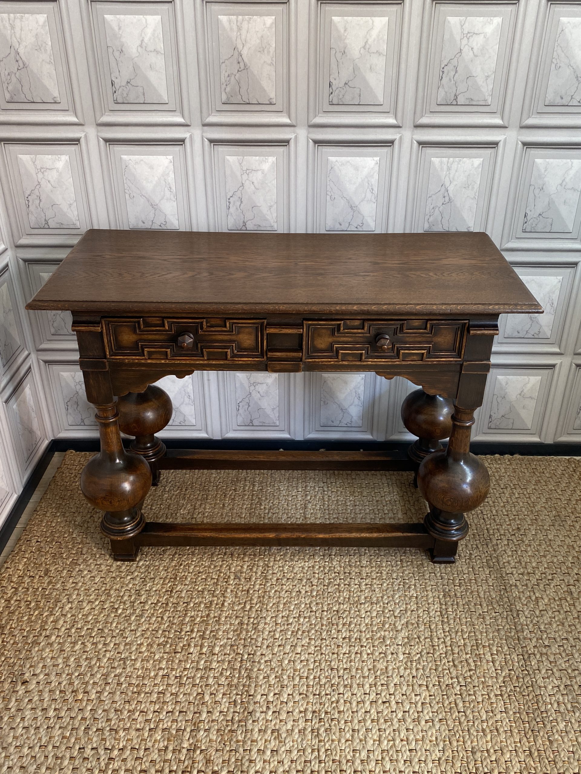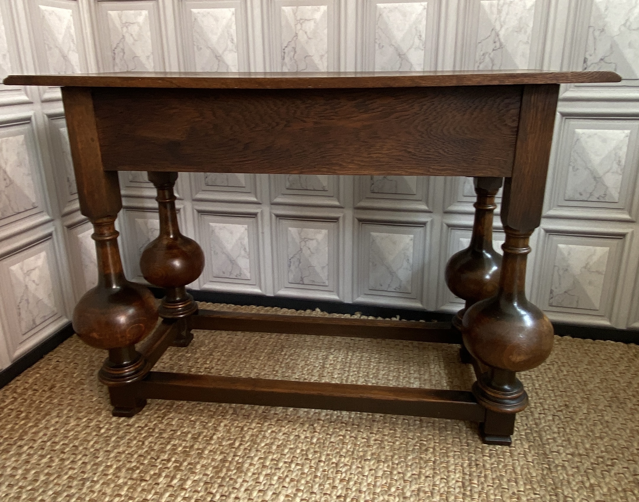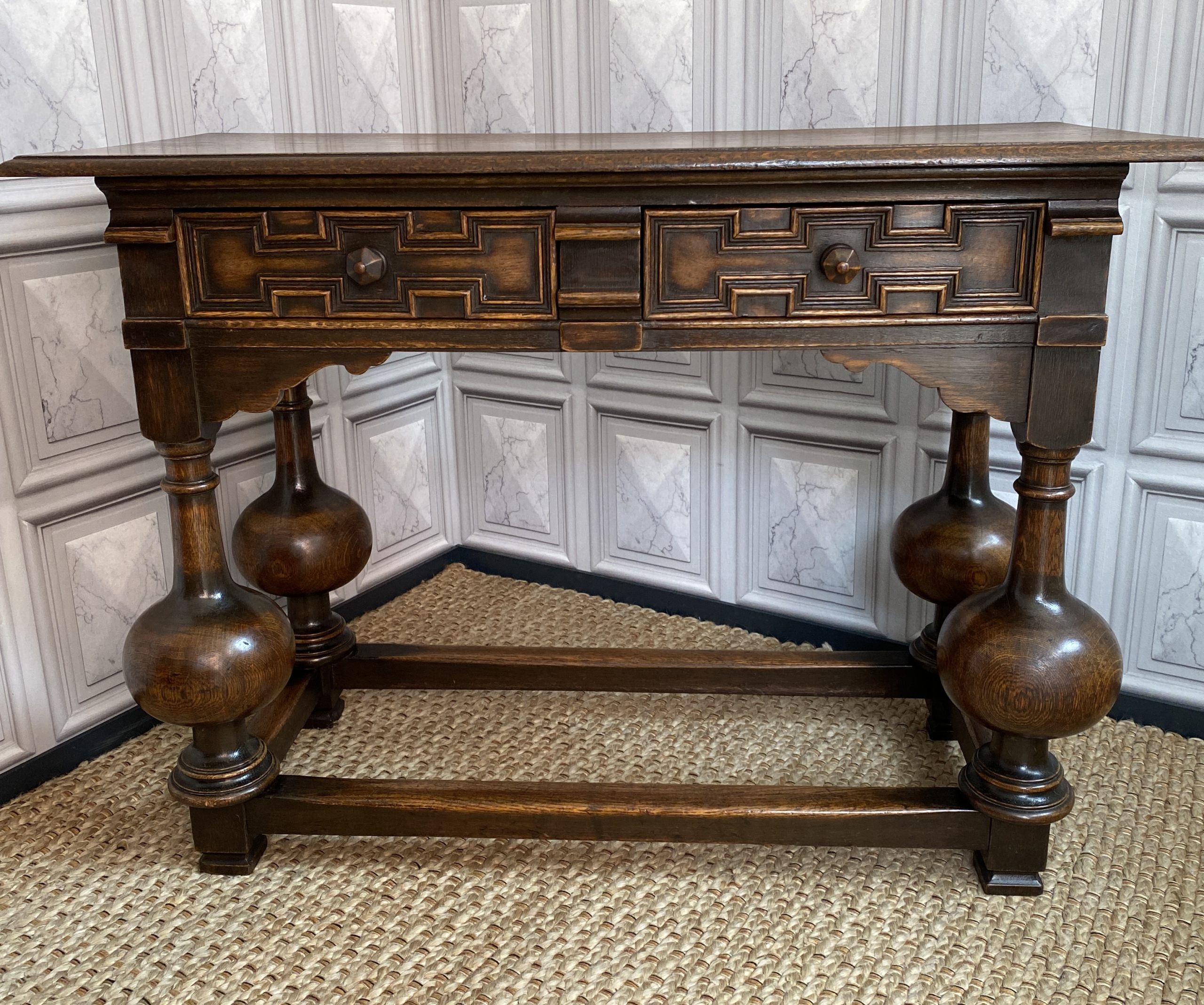 With distinctive large bulbous vase shaped legs and strong straight stretchers, and solid joints with no play.The nicely grained Oak top has a moulded finish to the front and two sides, the back edge being flat.There are two frieze drawers with feature mouldings and wooden shaped handles.Measuring 105cm in length,76cm in height and 47cm deep this side table would make a statement piece in any location.